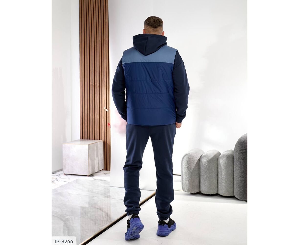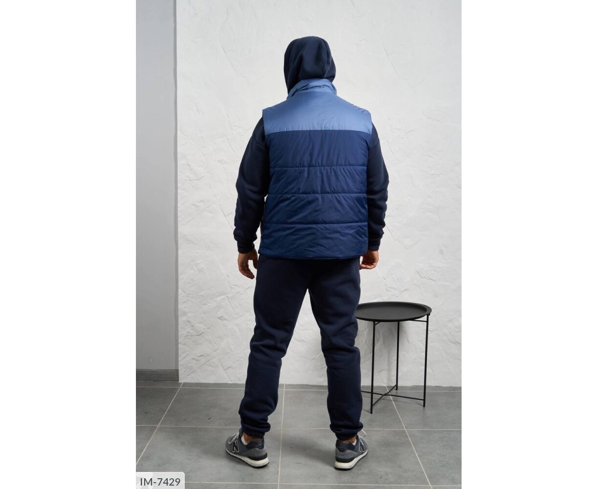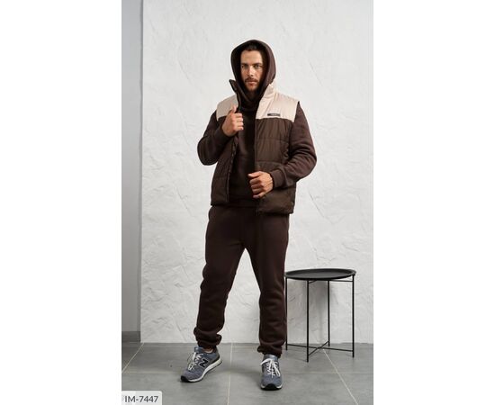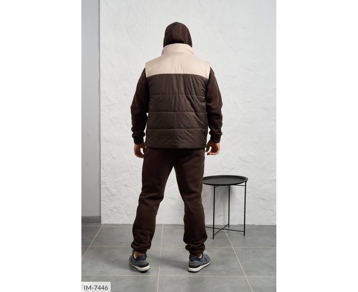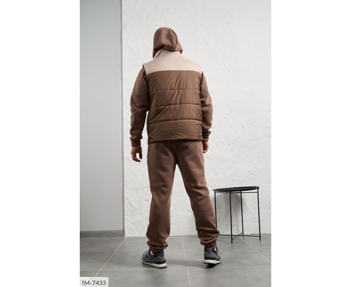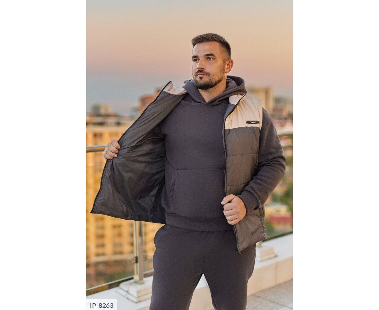 Костюм з жилетом, чоловічий, теплий з кишенею - кенгуру збоку прикрашен нашивкою, з капюшоном. Рукава на манжетах. Штани - висока посадка з кишенями, і знизу на гумці. Жилет