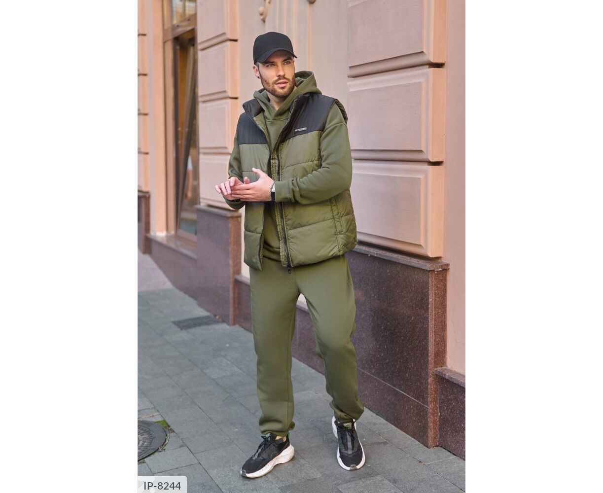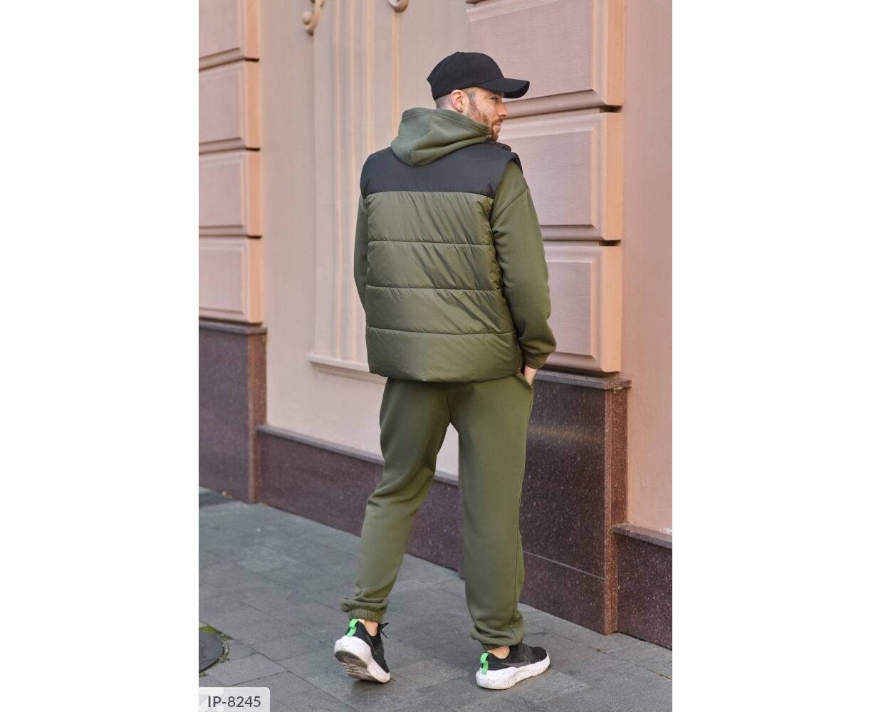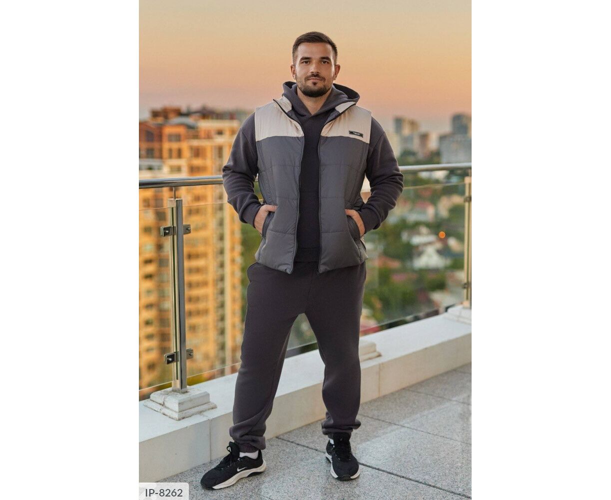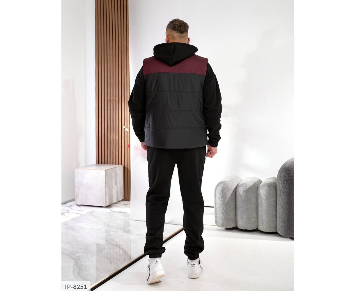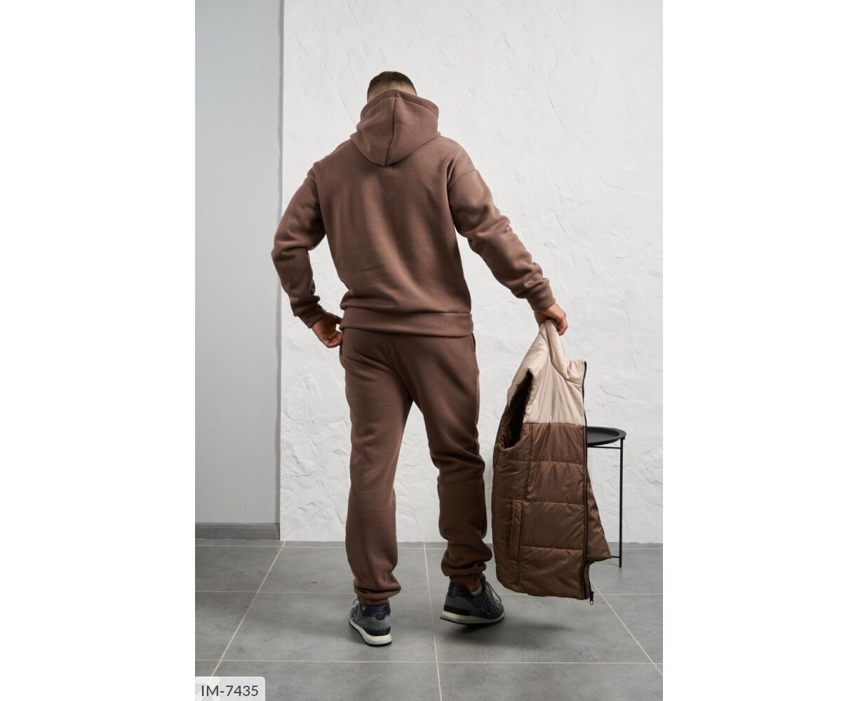 Костюм з жилетом, чоловічий, теплий з кишенею - кенгуру збоку прикрашен нашивкою, з капюшоном. Рукава на манжетах. Штани - висока посадка з кишенями, і знизу на гумці. Жилет