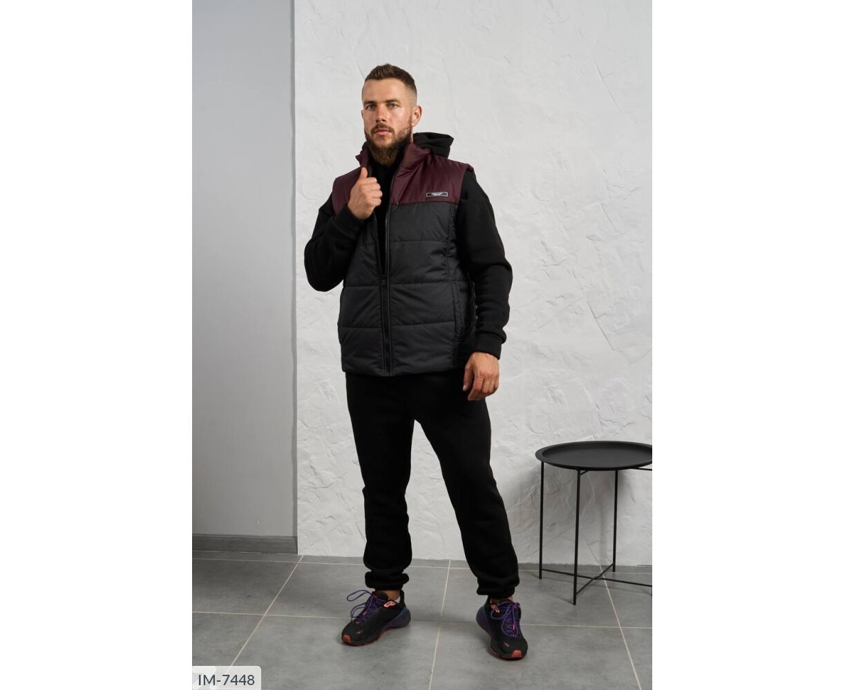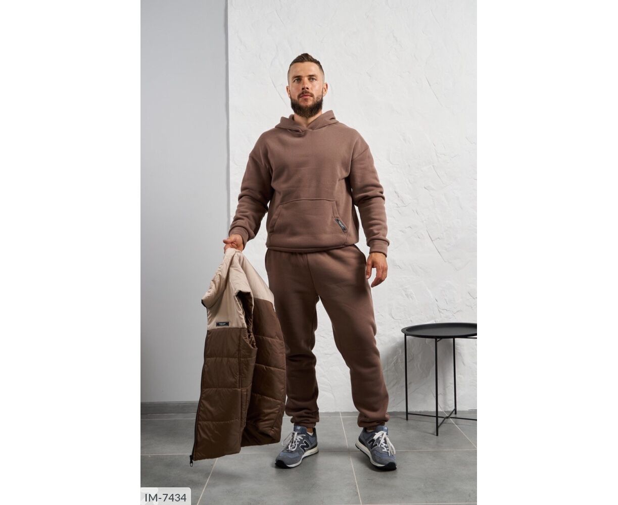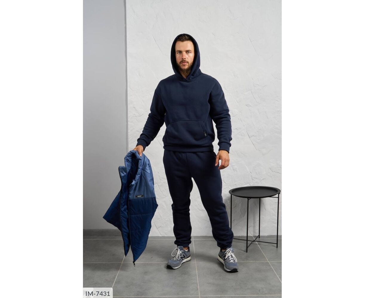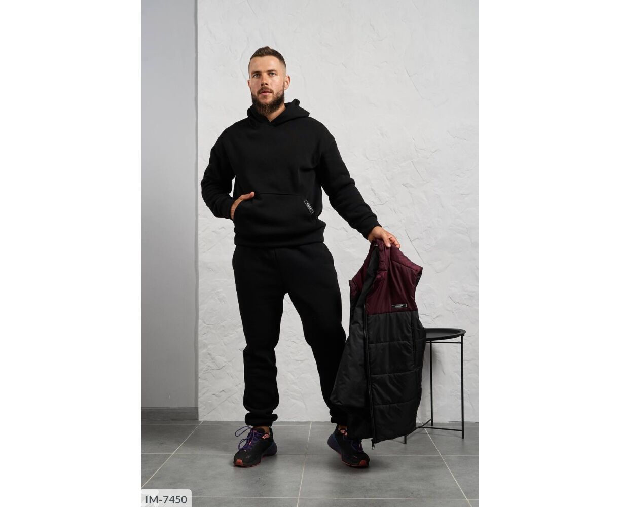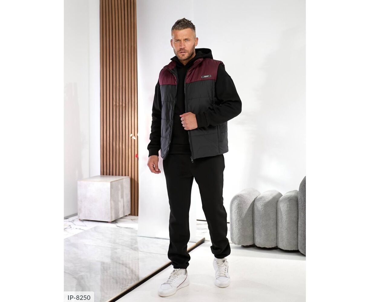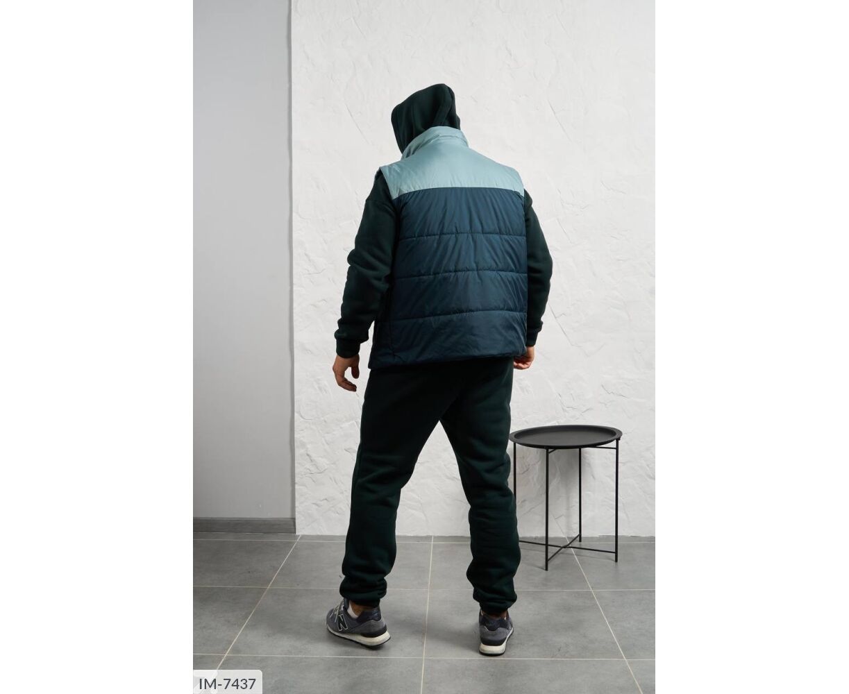 Костюм з жилетом, чоловічий, теплий з кишенею - кенгуру збоку прикрашен нашивкою, з капюшоном. Рукава на манжетах. Штани - висока посадка з кишенями, і знизу на гумці. Жилет