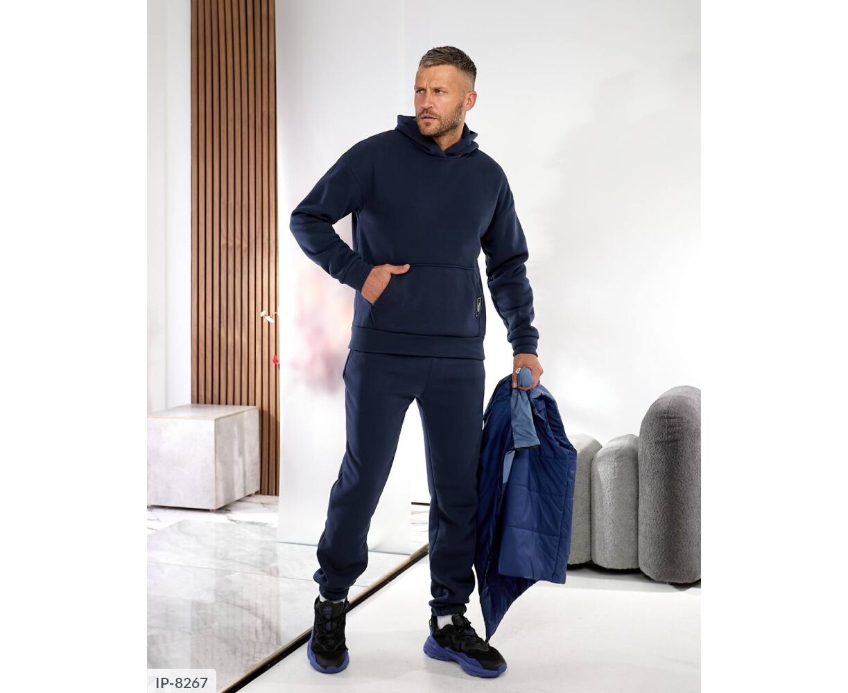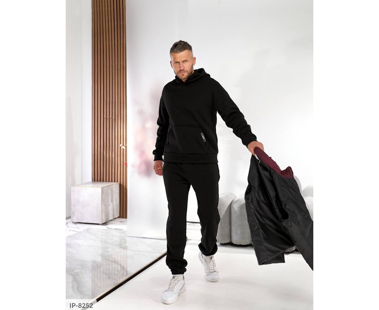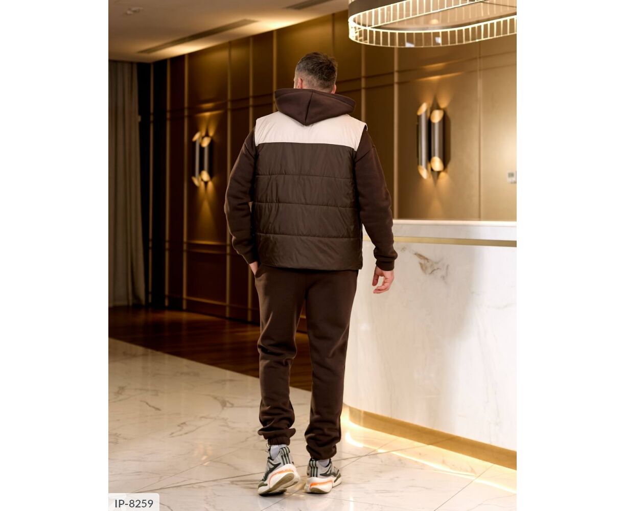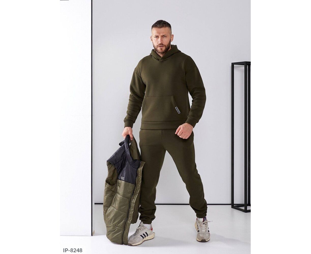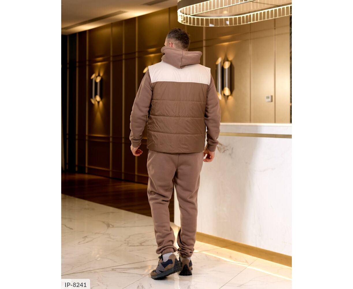 Костюм з жилетом, чоловічий, теплий з кишенею - кенгуру збоку прикрашен нашивкою, з капюшоном. Рукава на манжетах. Штани - висока посадка з кишенями, і знизу на гумці. Жилет