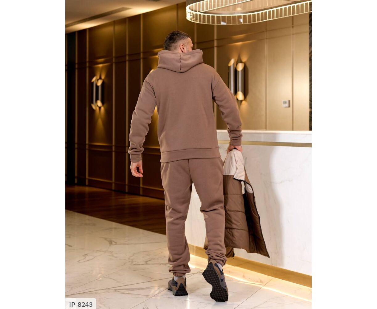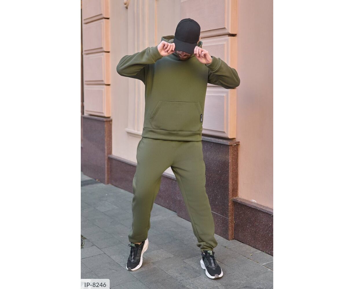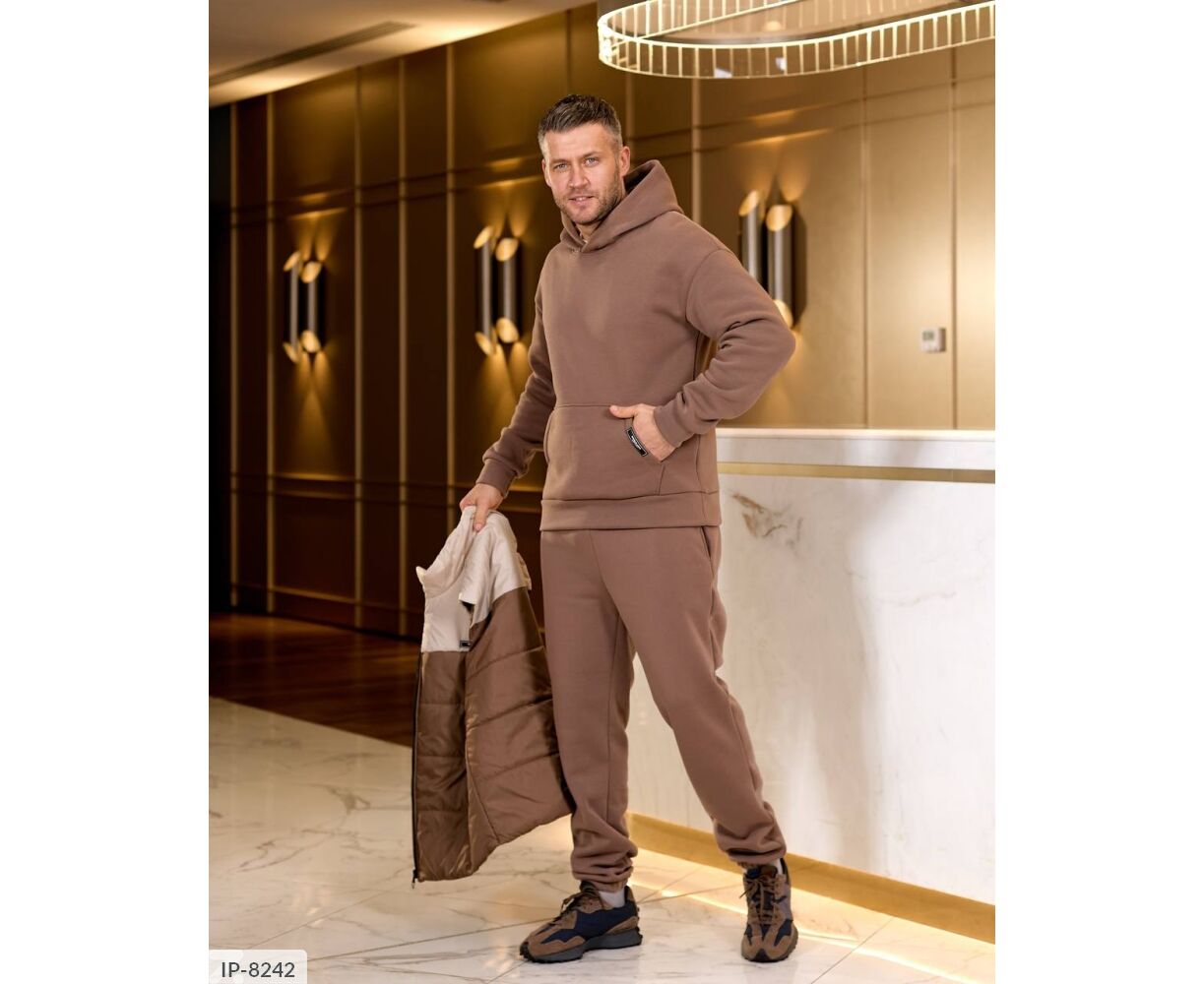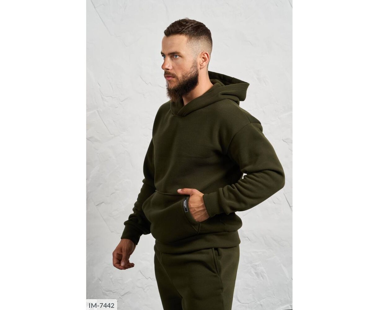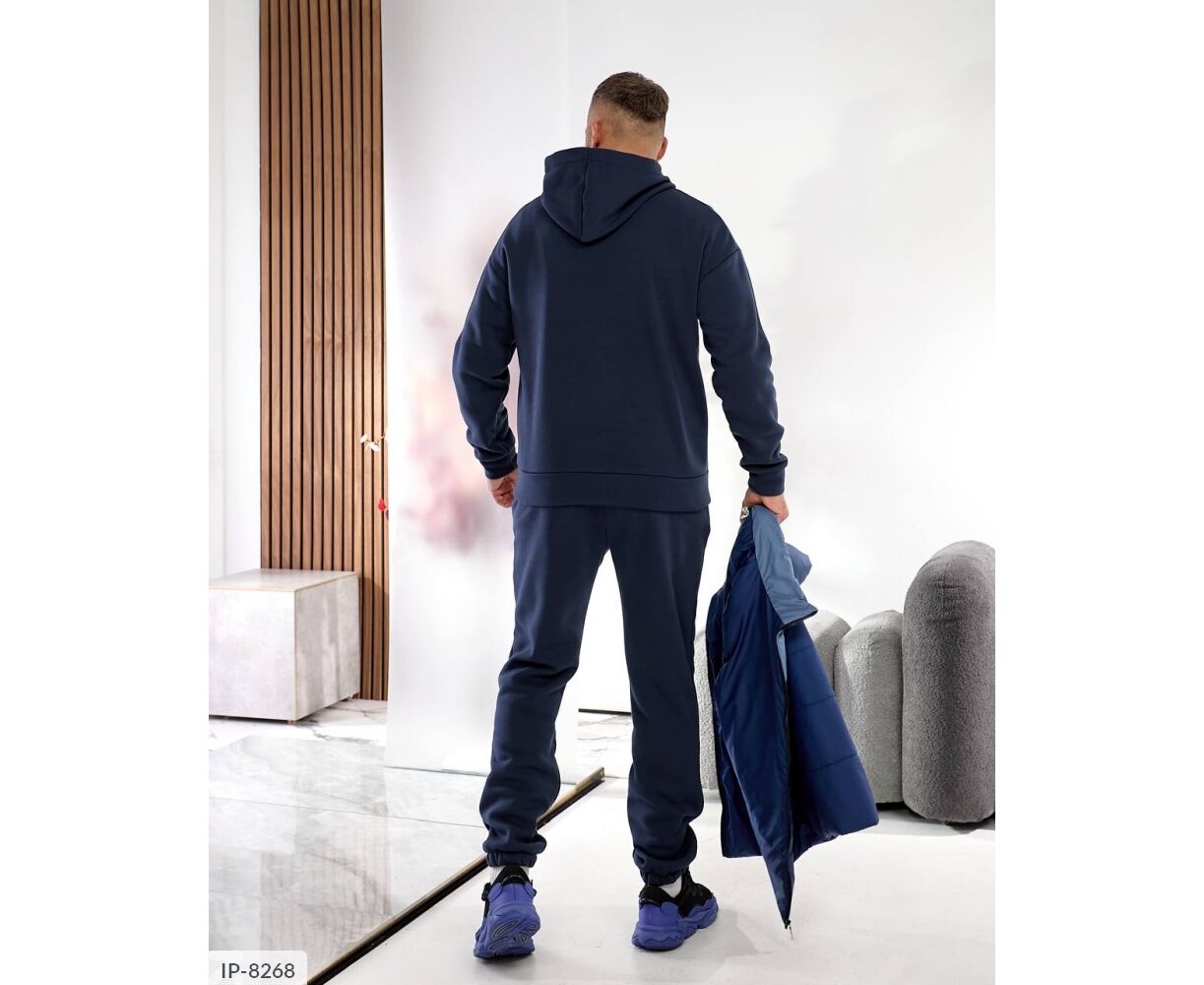 Костюм з жилетом, чоловічий, теплий з кишенею - кенгуру збоку прикрашен нашивкою, з капюшоном. Рукава на манжетах. Штани - висока посадка з кишенями, і знизу на гумці. Жилет