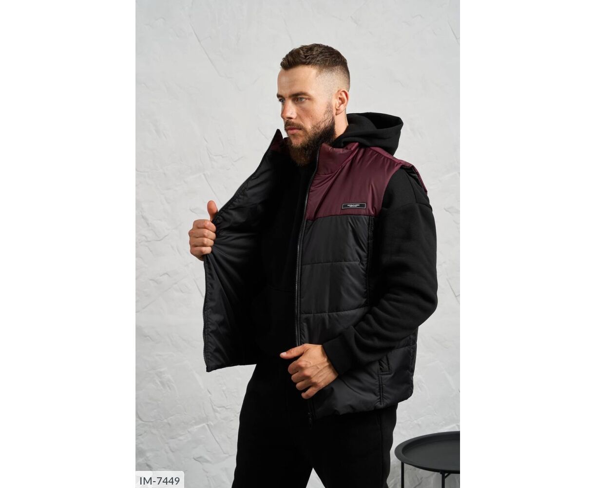 Стьобаний синтепоном, на підкладці з плащової тканини, застібається на блискавку, на грудях прикрашений нашивкою.