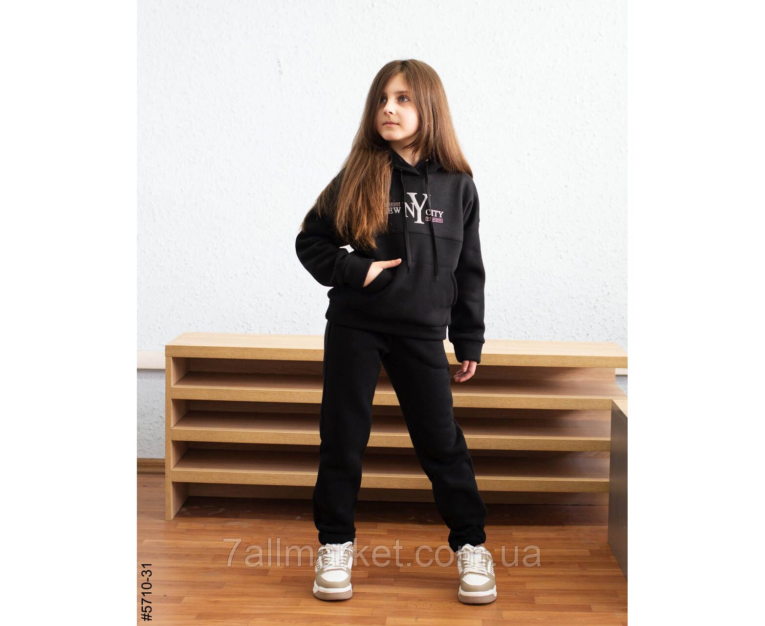 Підлітковий спортивний костюм з тринитки на флісі. Верх — худі з капюшоном, прикрашена стильним написом і стразами. Низ — штани на манжеті-резинці, у поясі широка з комфортноа резинка. Гарне лекало, стильна повномірна модель.