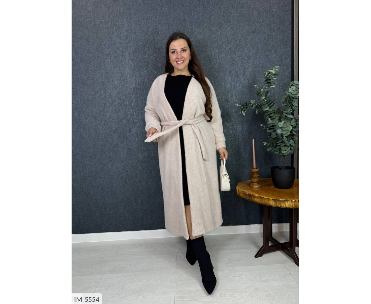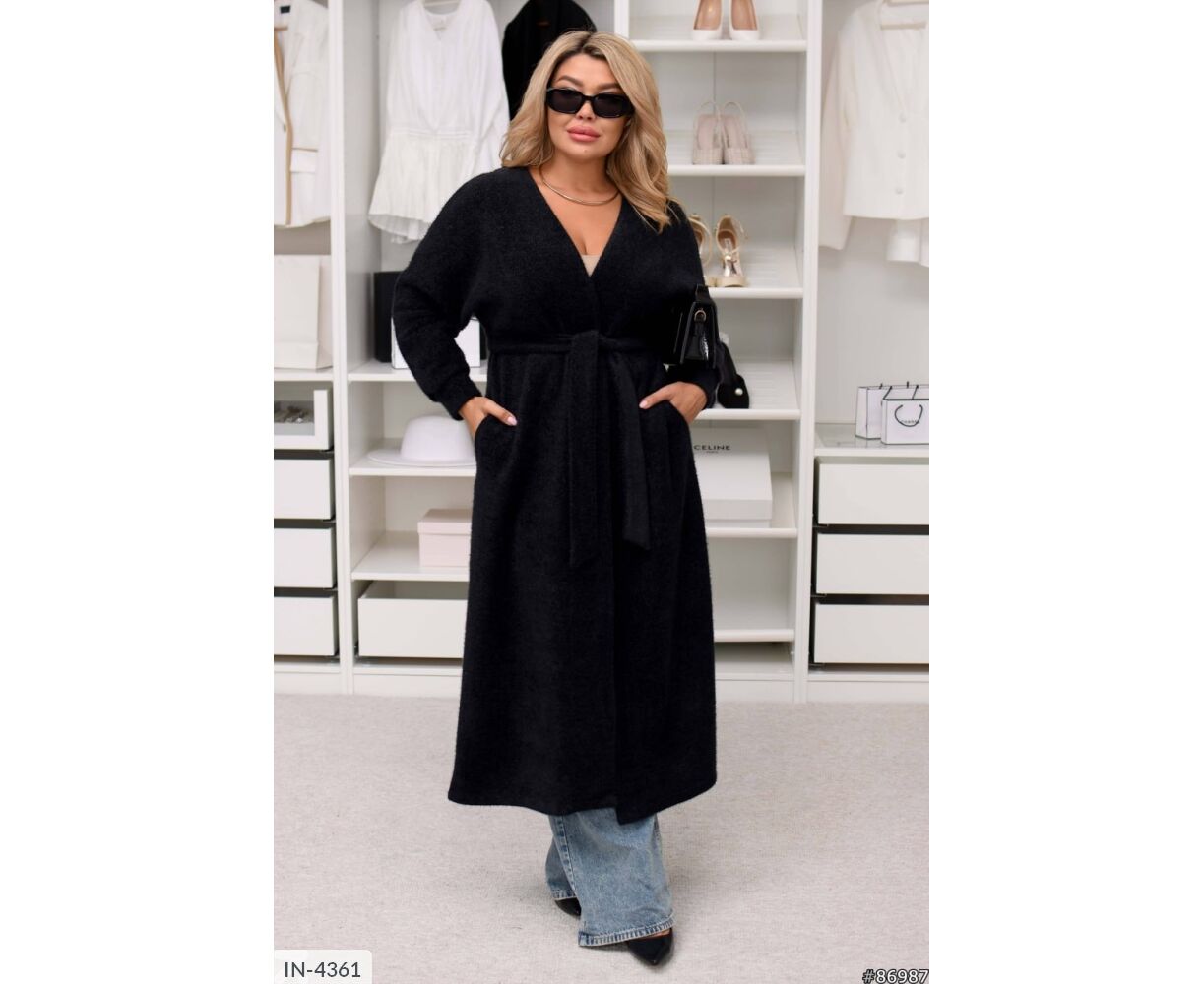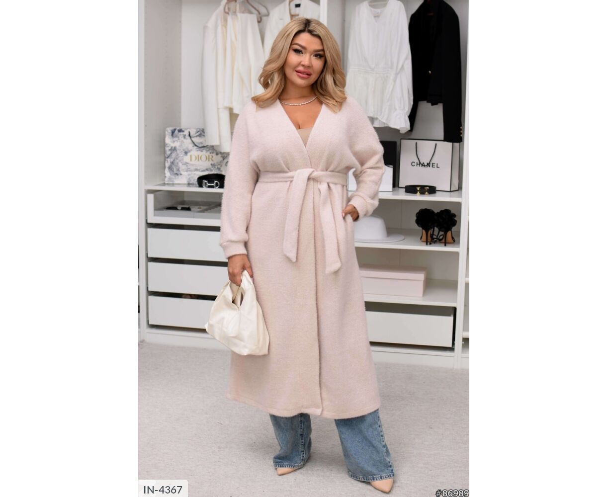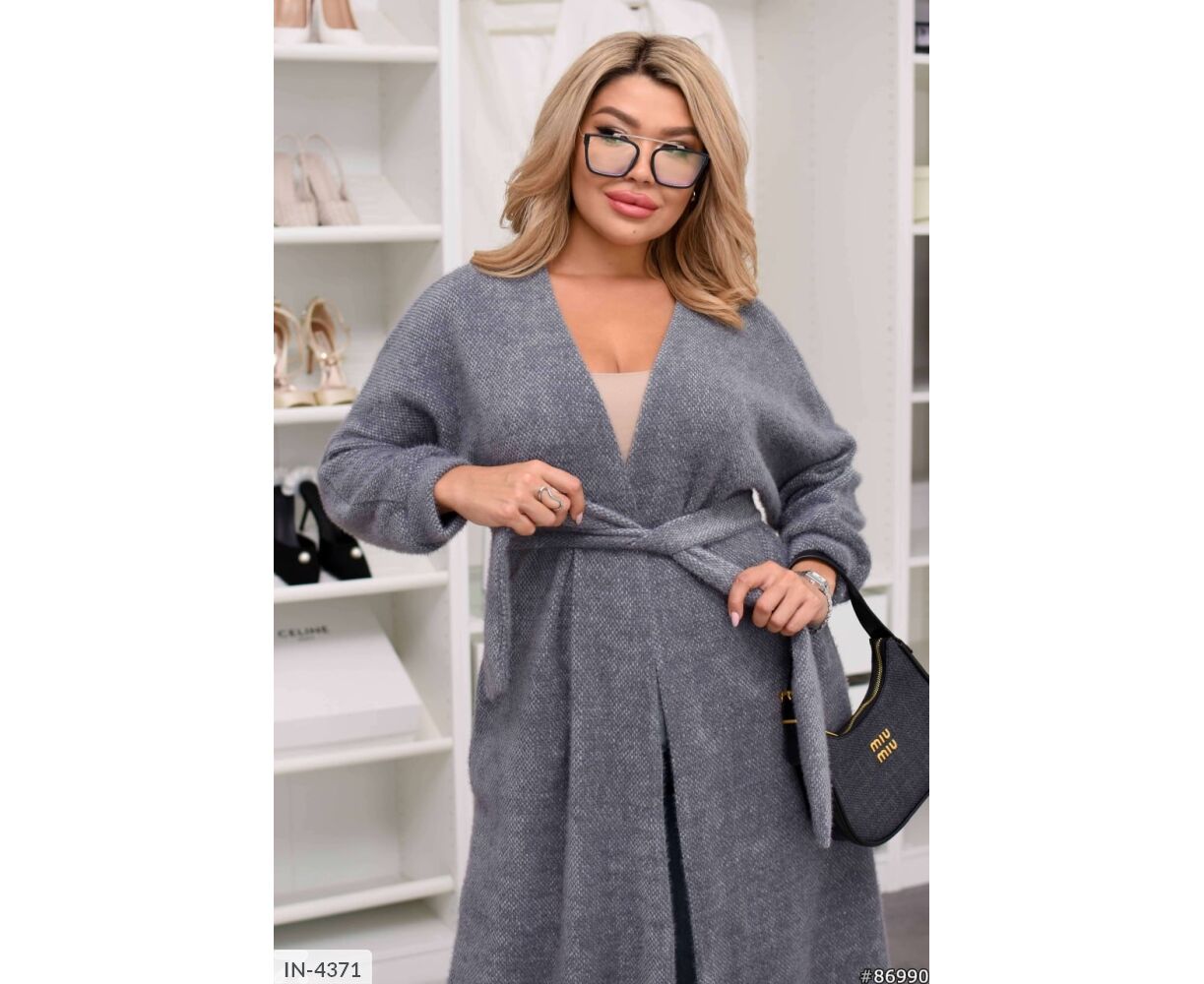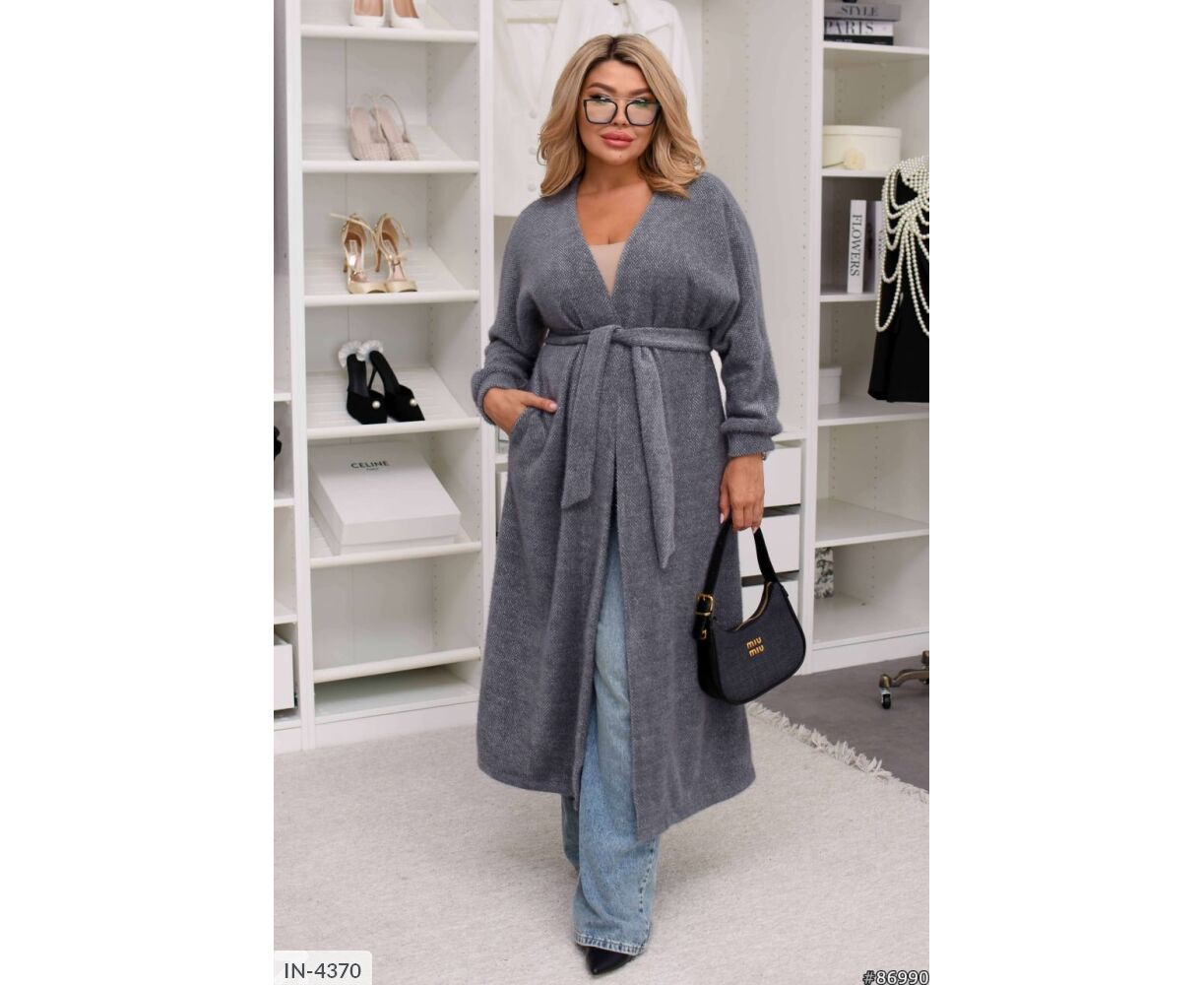 Подовжений кардиган на запах, талія фіксується канатом, на рукавах манжети