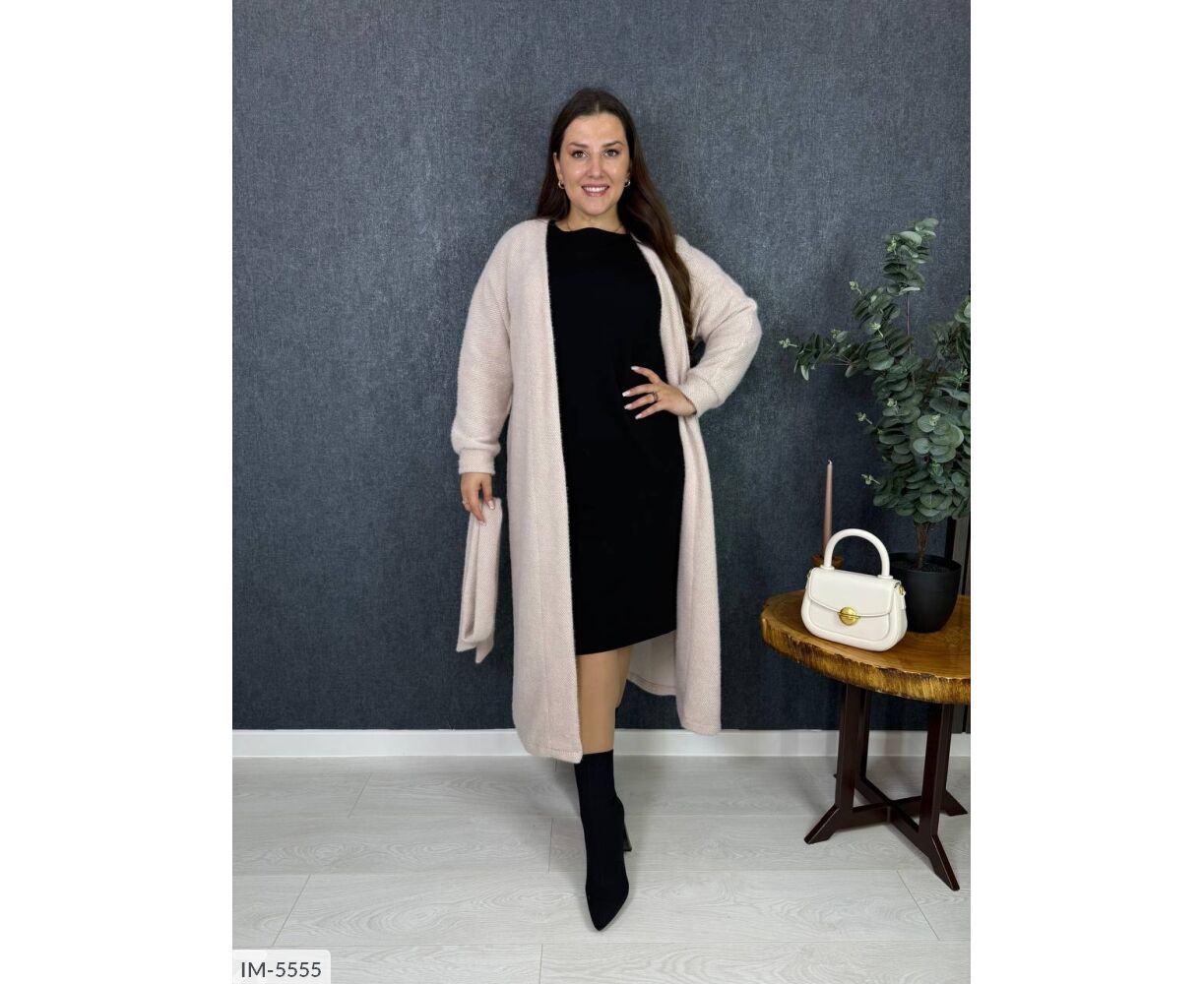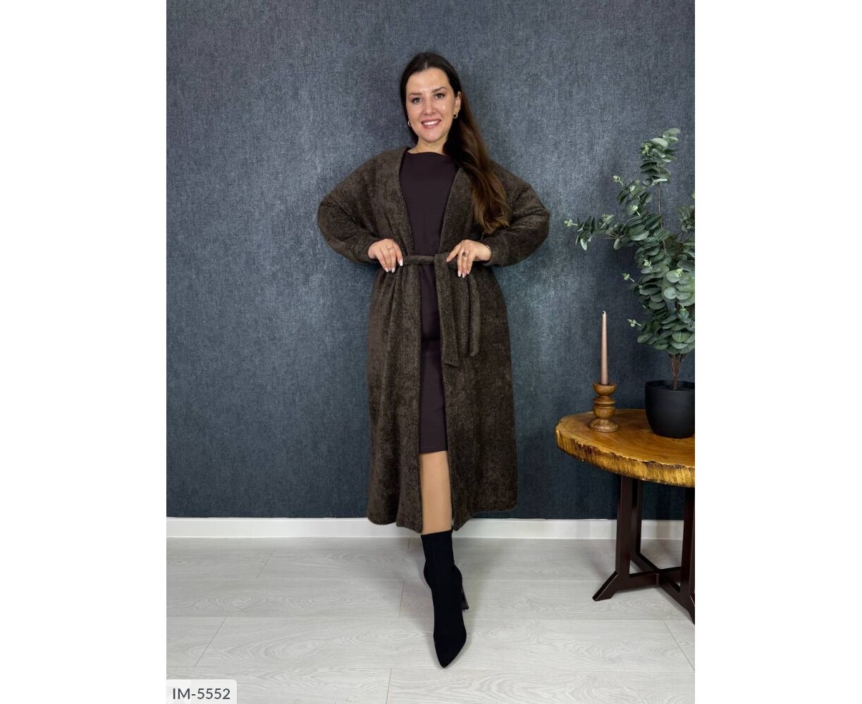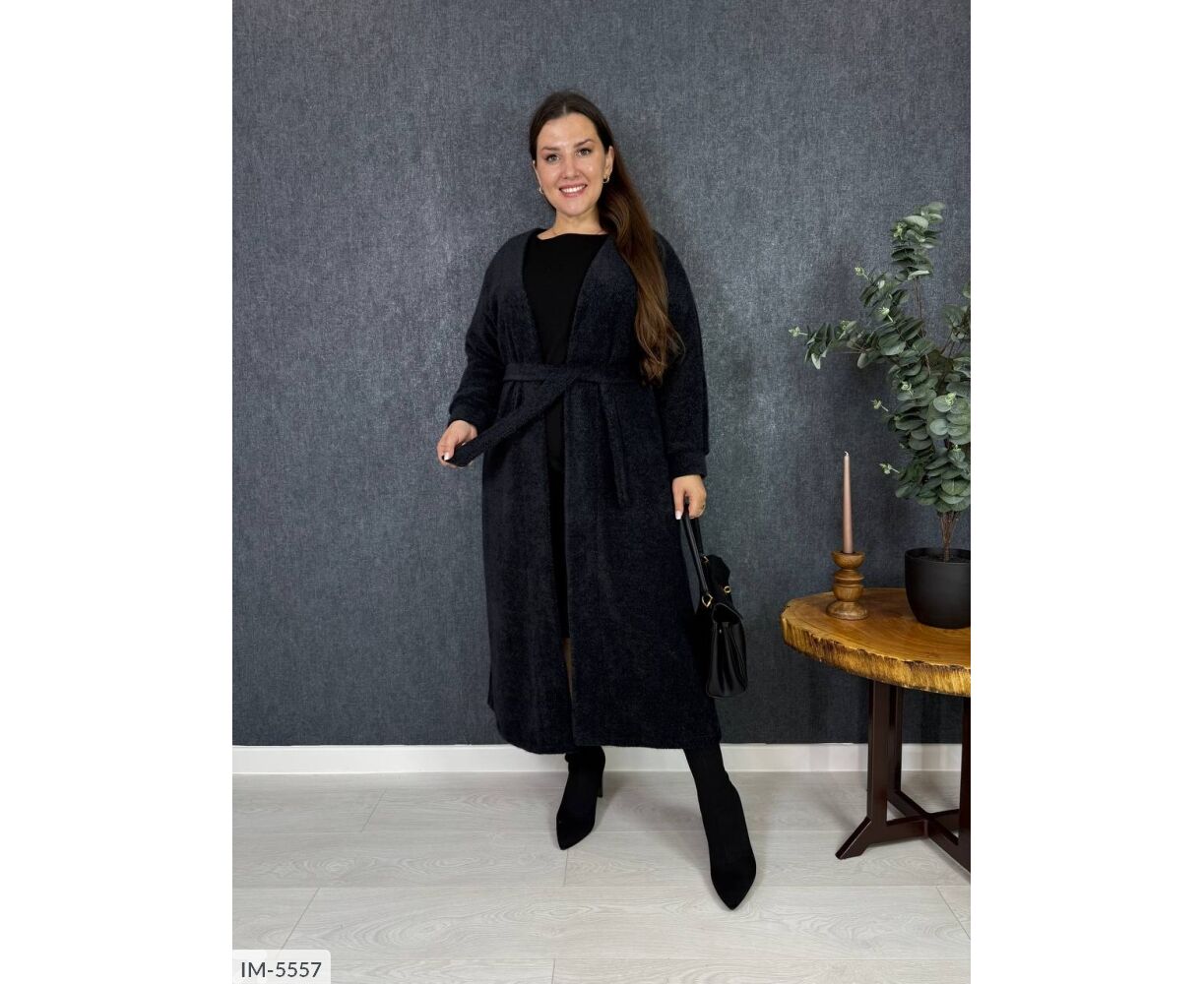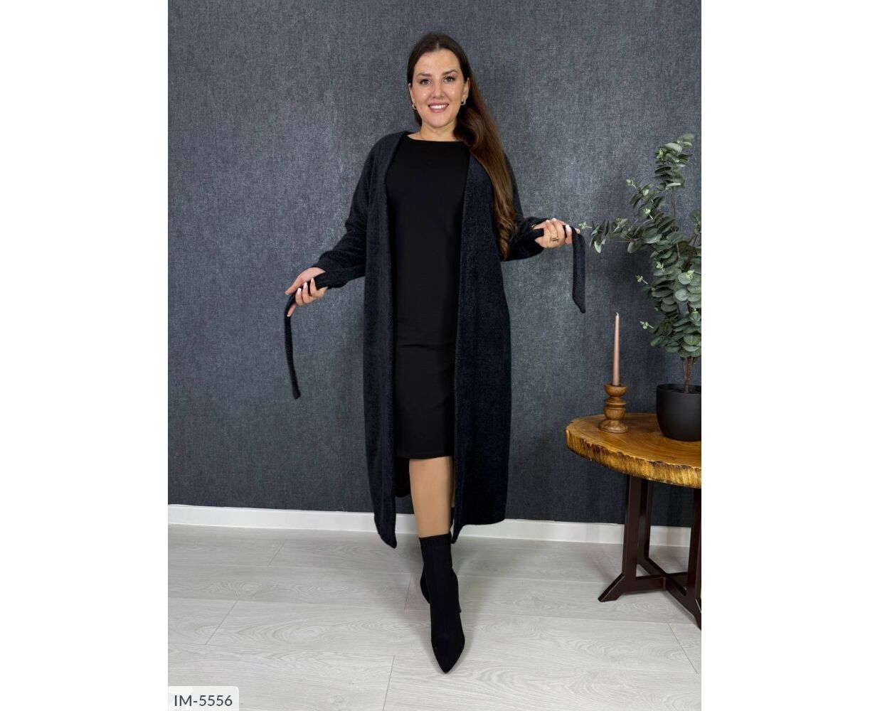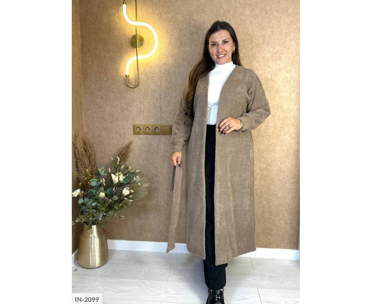 Подовжений кардиган на запах, талія фіксується канатом, на рукавах манжети