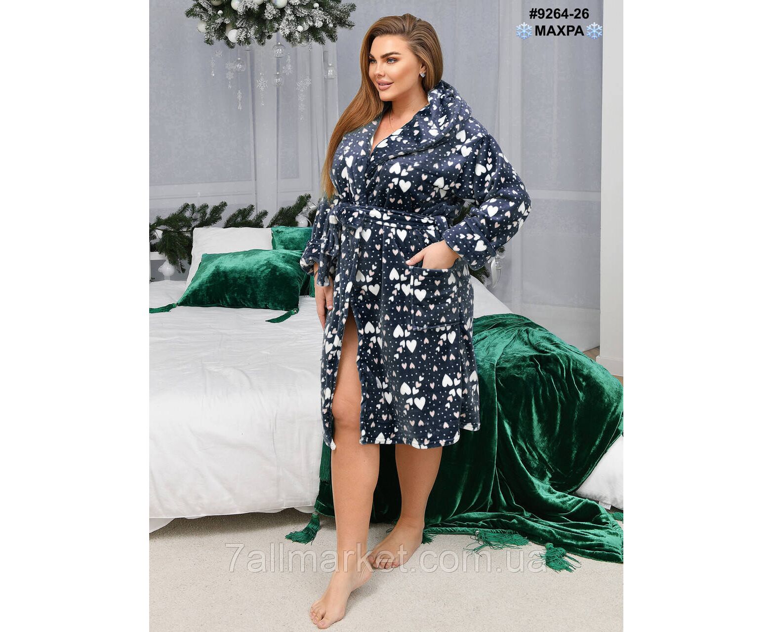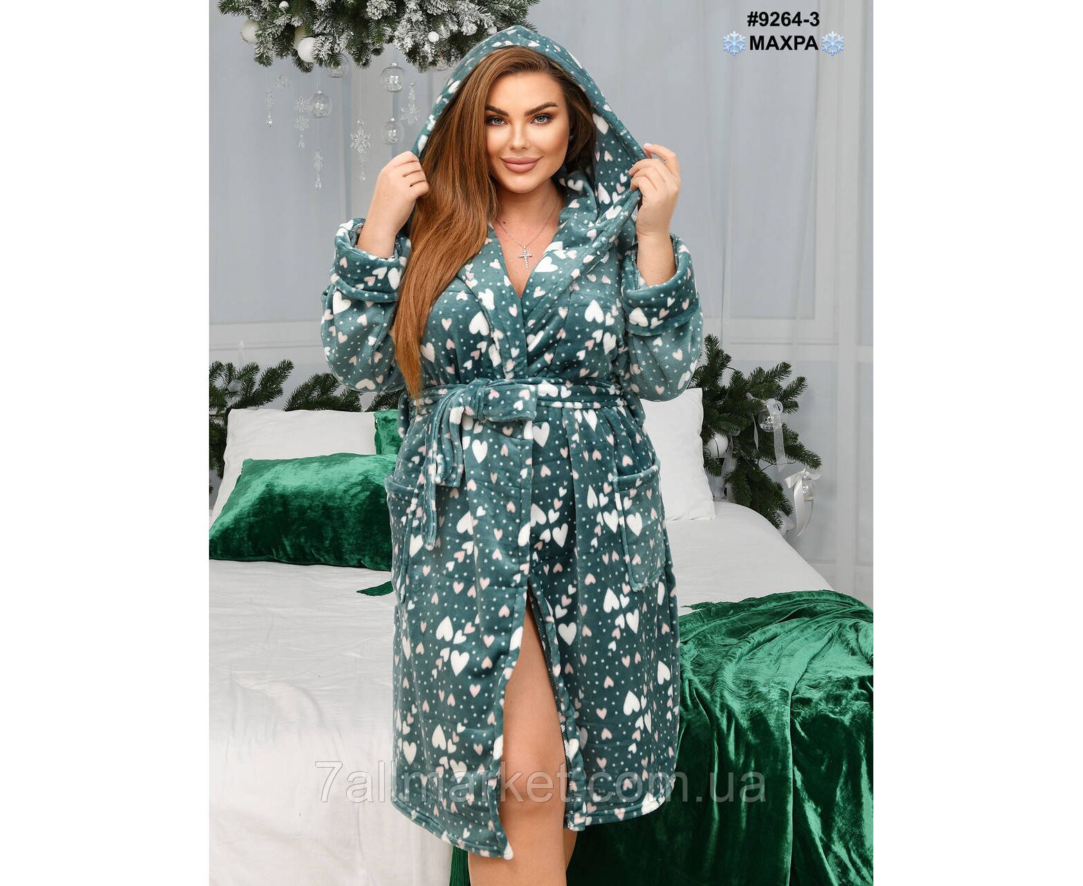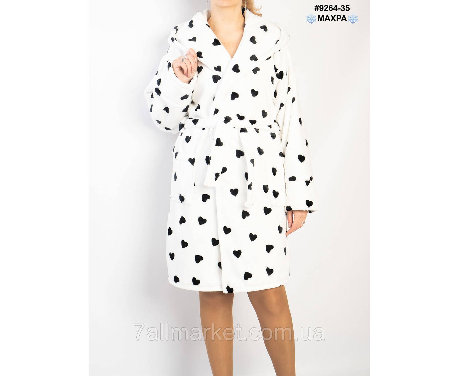 Махровий жіночий халат на запах; оснащений капюшоном та двома кишенями. Тепла зручна модель для дому.