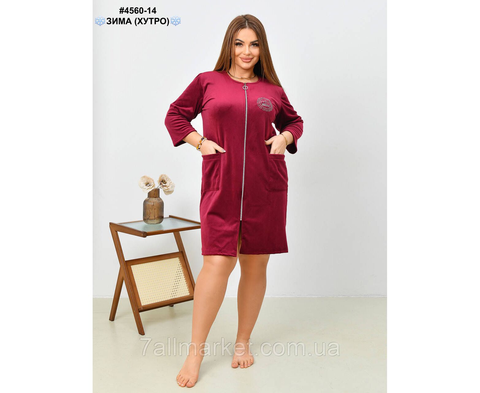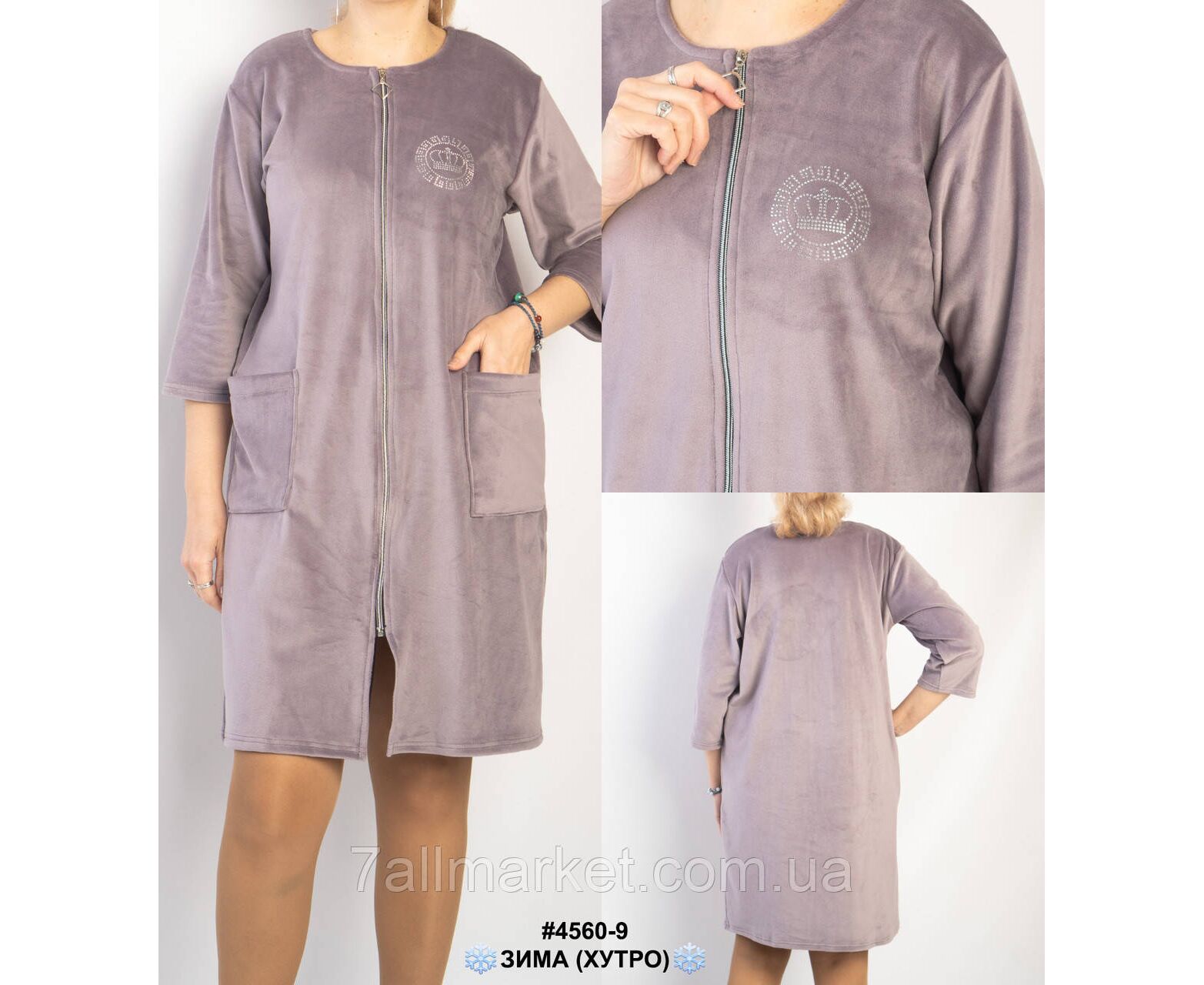 Теплий жіночий халат з велюру на хутрі: на блискавці, є дві кишені. Доповнено малюнком зі страз. Шикарна зручна модель для дому.