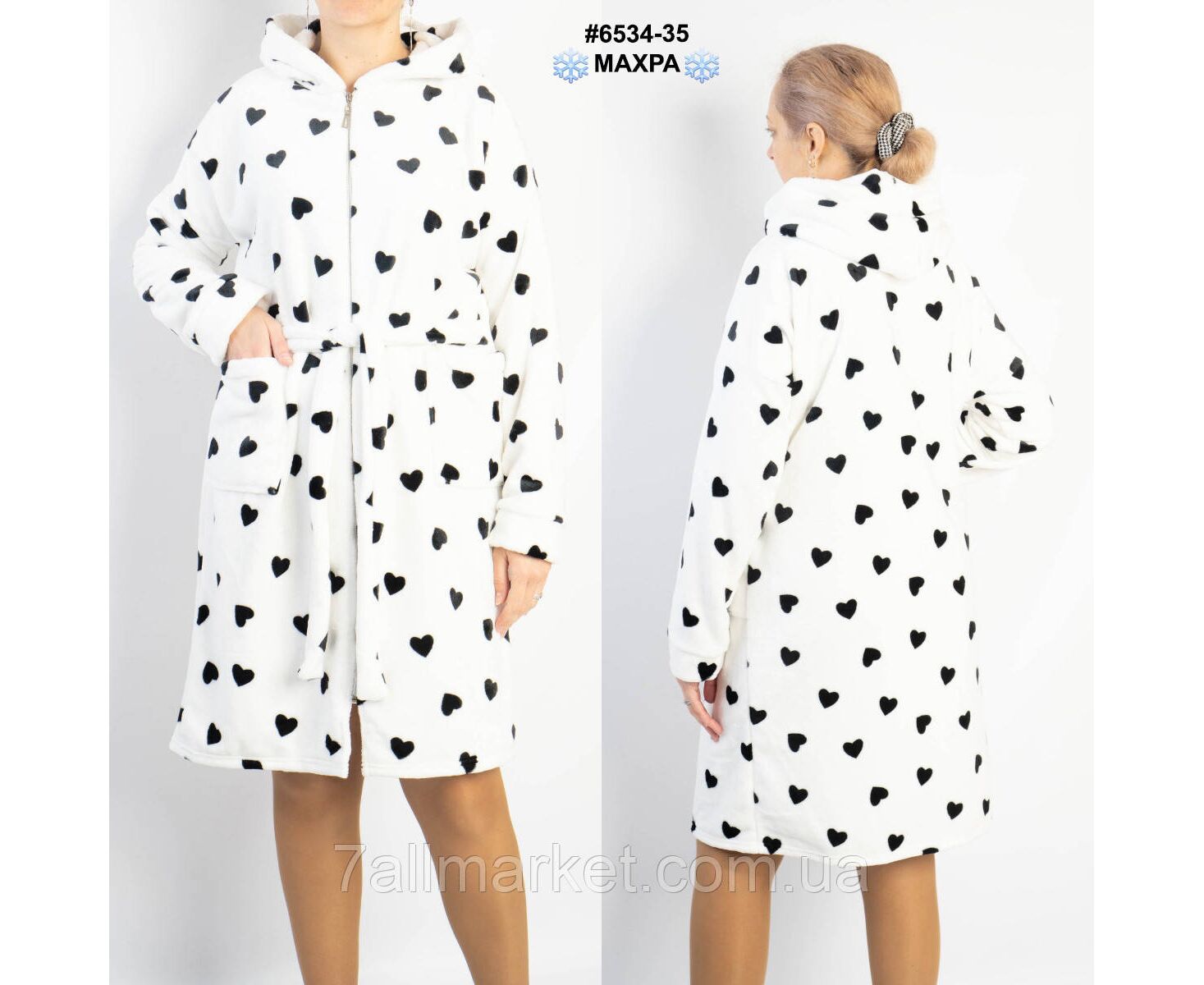 Махровий жіночий халат на блискавці; оснащений поясом для додаткової фіксації, капюшоном та двома кишенями. Тепла зручна модель для дому.