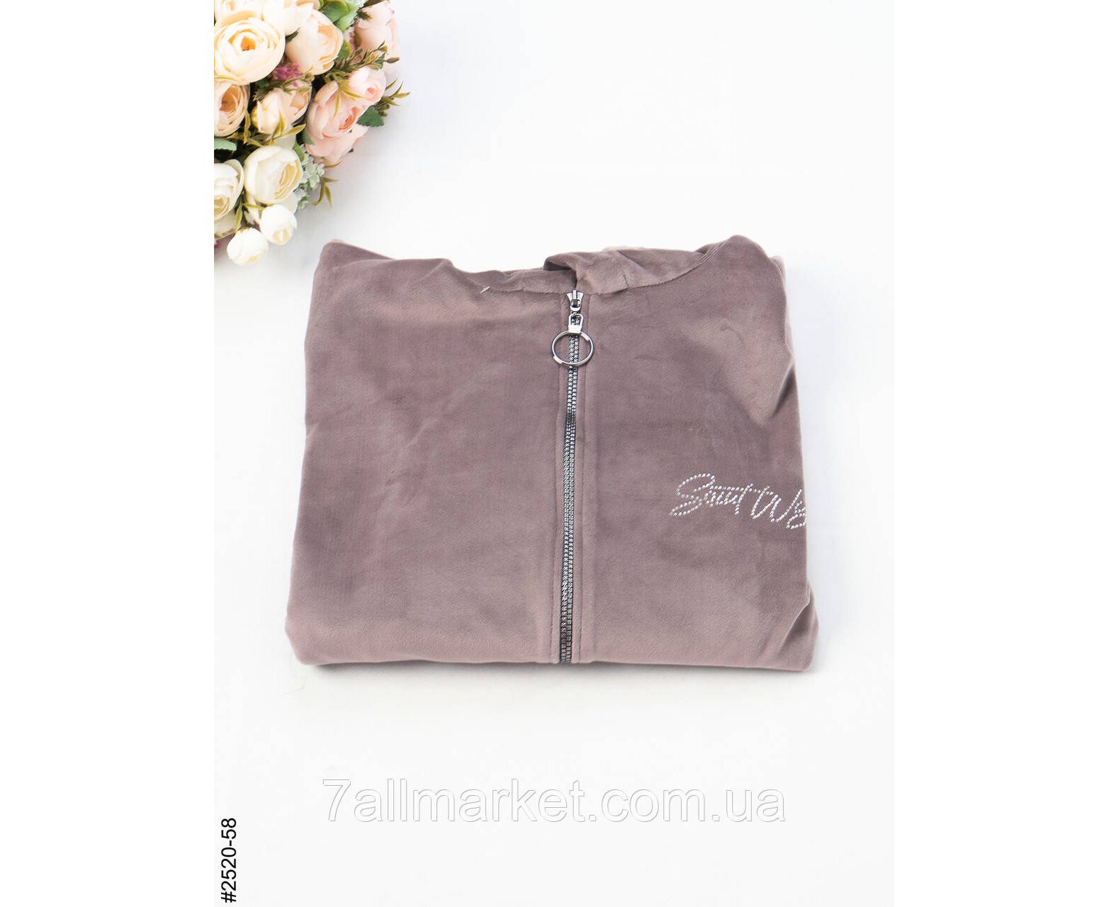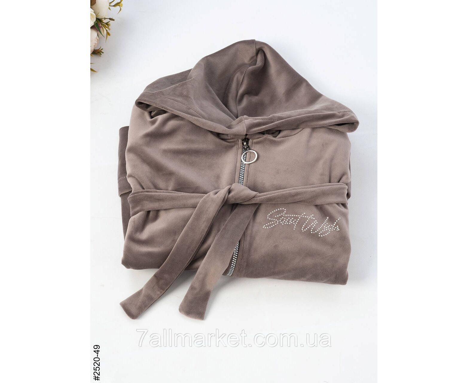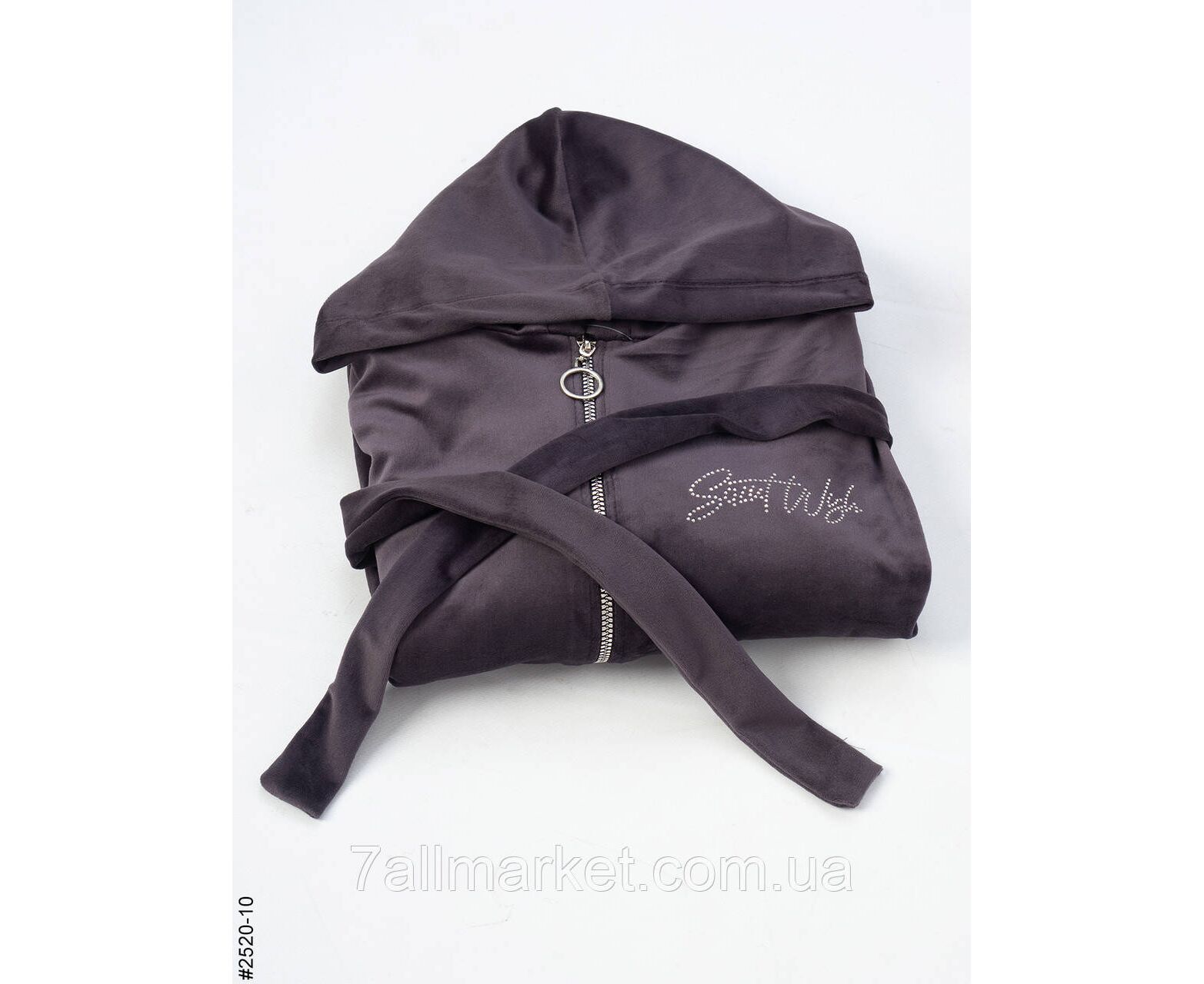Велюровий жіночий халат на блискавці; оснащений поясом для додаткової фіксації, капюшоном та двома кишенями. Шикарна зручна модель для дому.