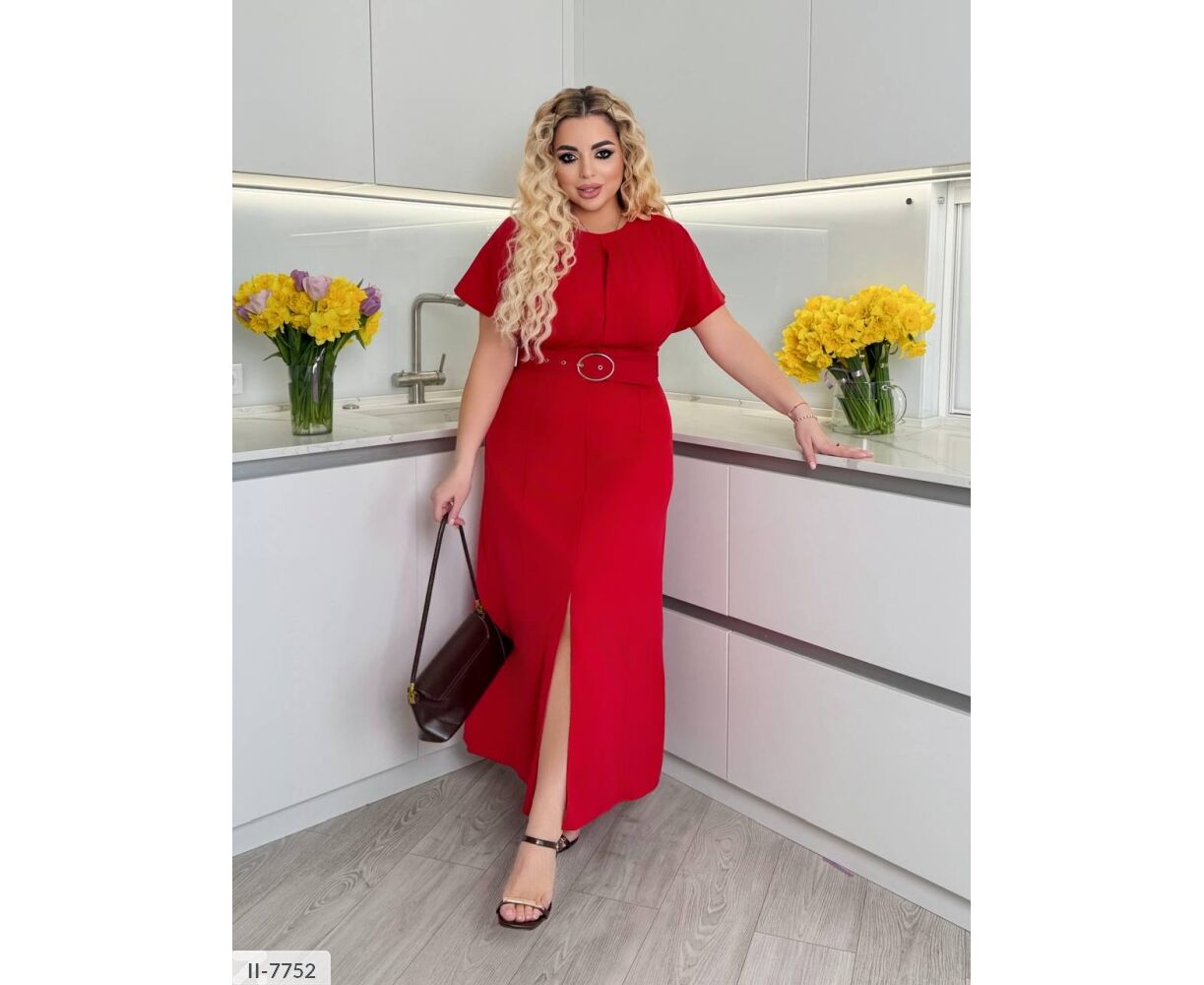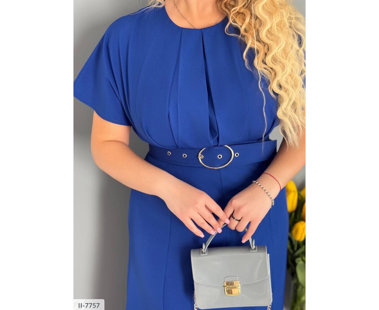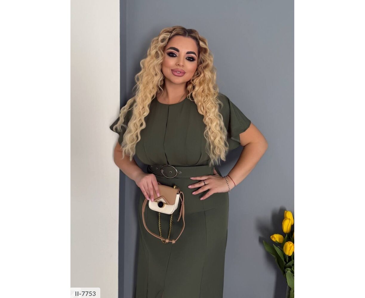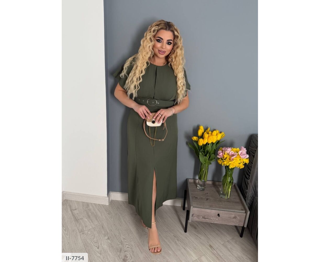 Сукня цікавого крою: на грудях складки, підкреслює груди і привертає увагу. Широкий пояс підкреслює талію (виготовлений під кольори сукні ). Сукня-міді, від талії кльош, по центру розріз