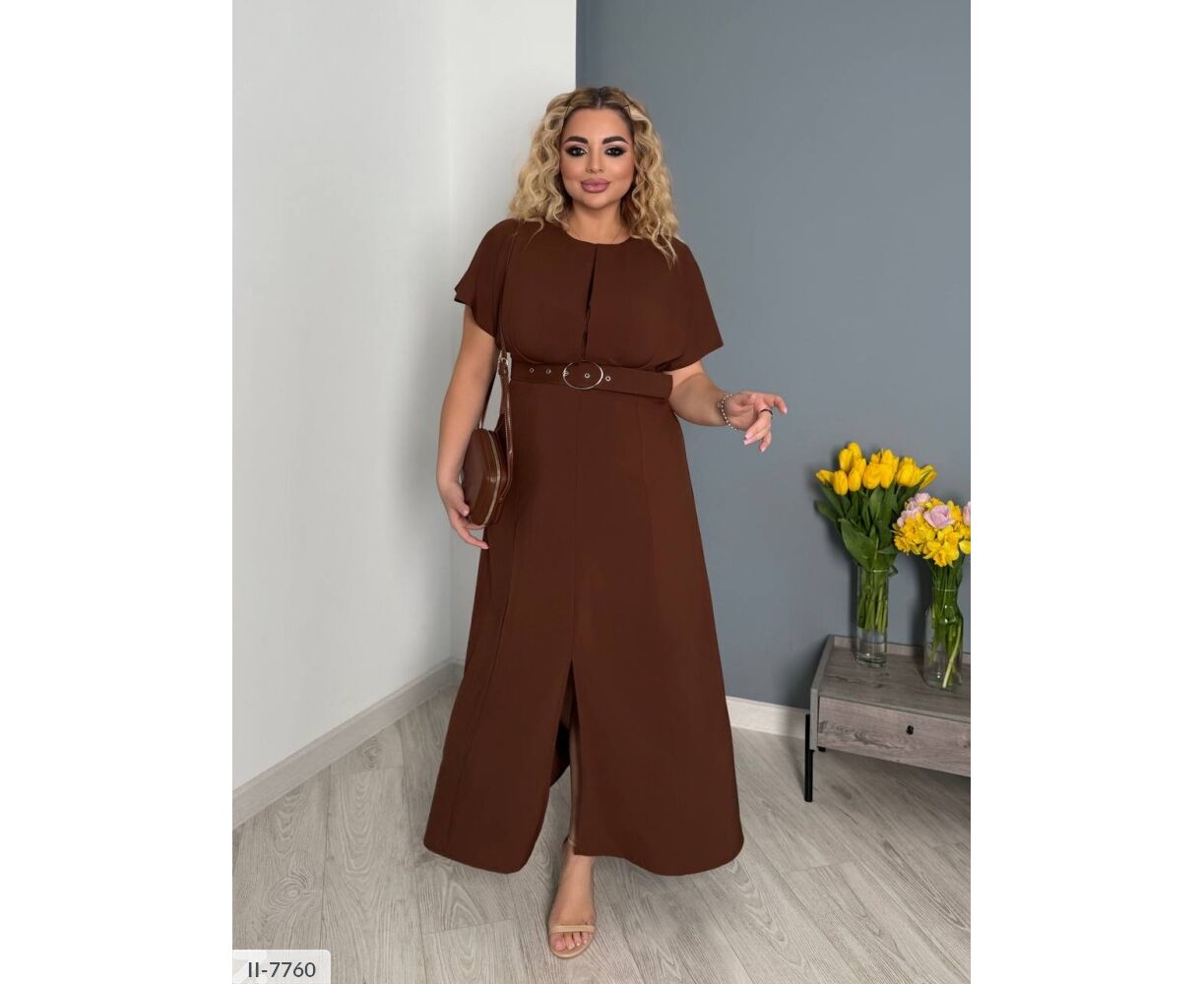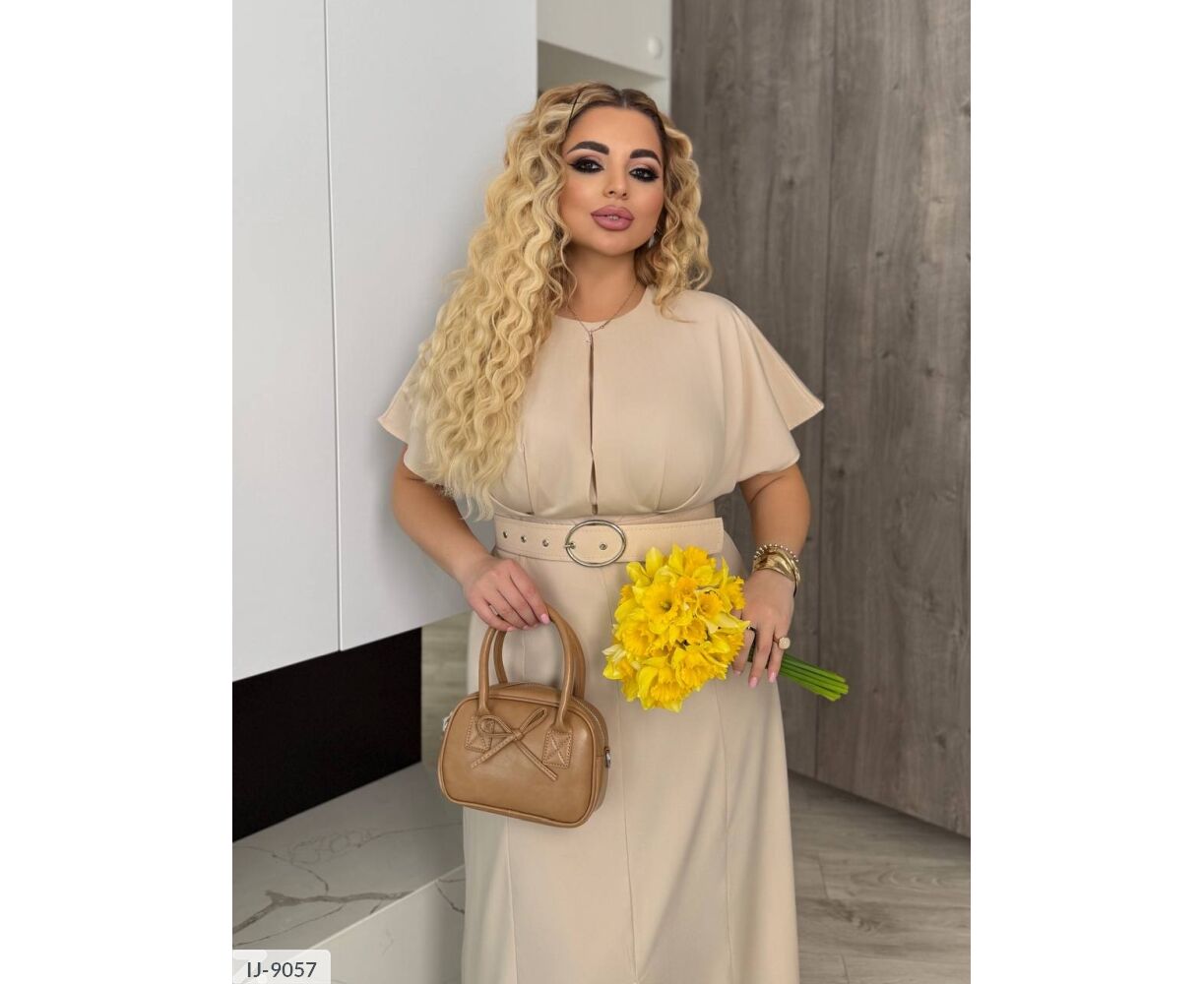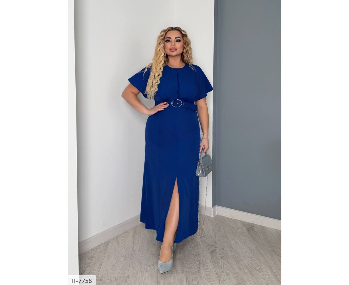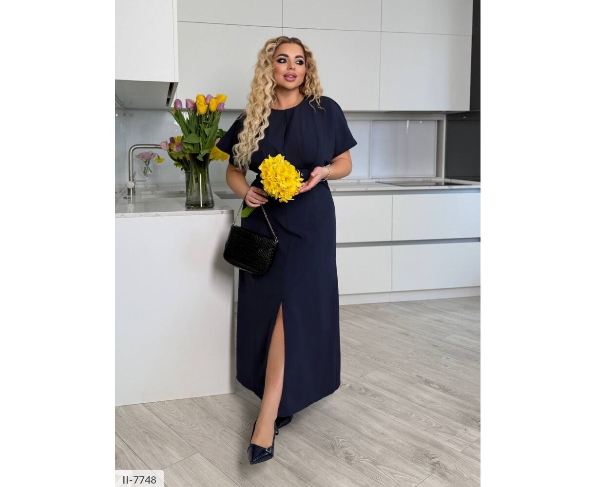 Сукня цікавого крою: на грудях складки, підкреслює груди і привертає увагу. Широкий пояс підкреслює талію (виготовлений під кольори сукні ). Сукня-міді, від талії кльош, по центру розріз