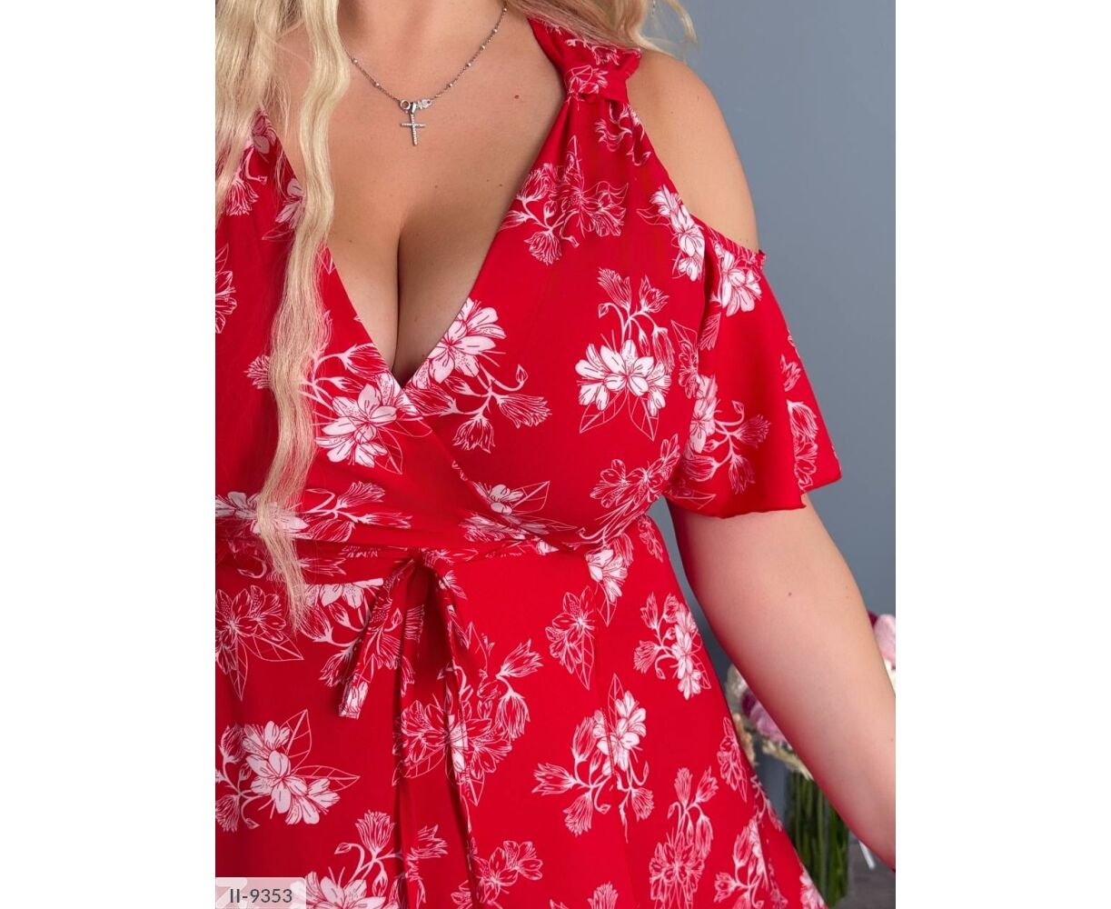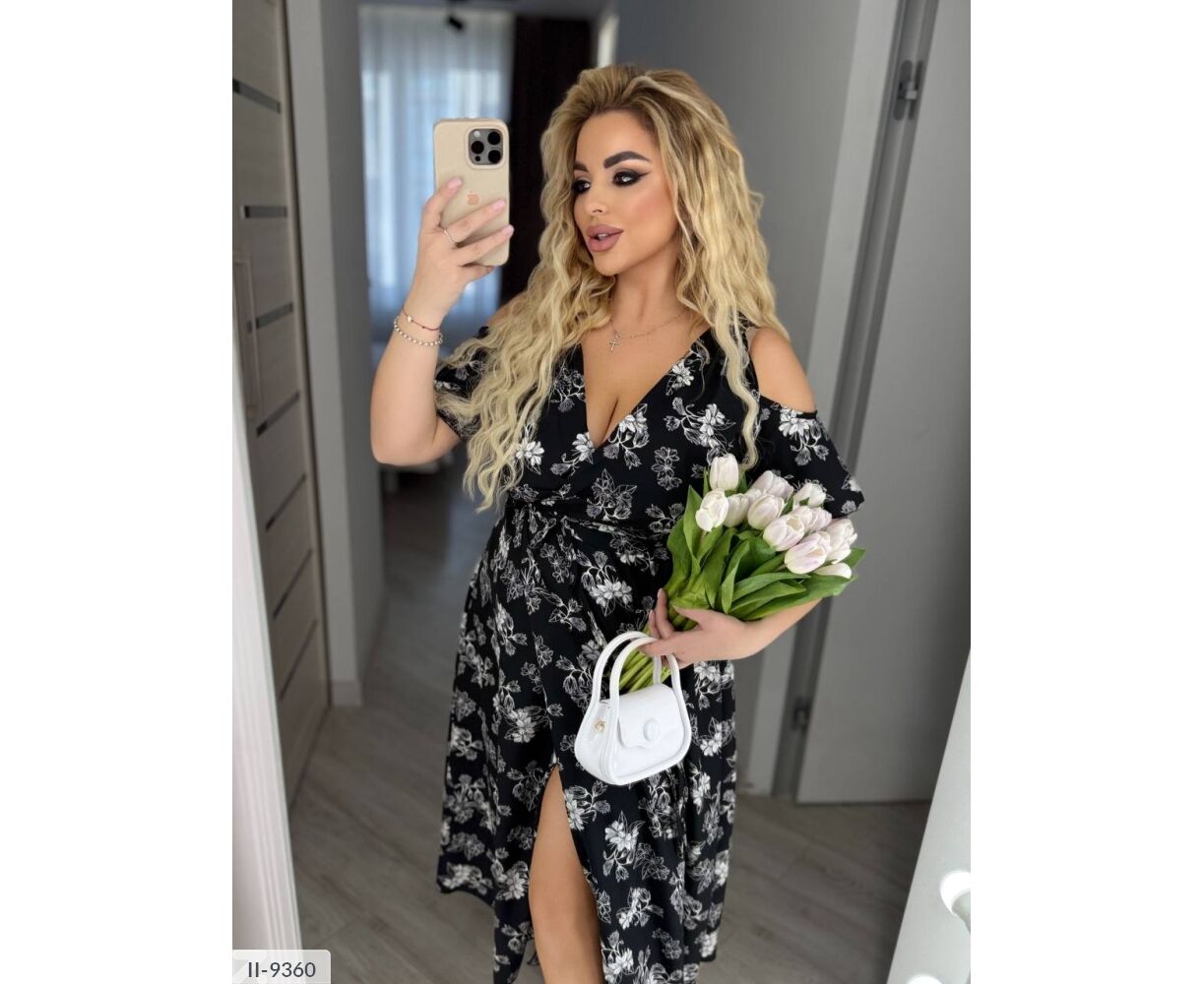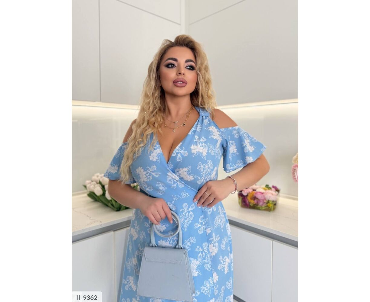 Подовжене плаття на запах, цікавого крою: на грудях є фіксатори (можна регулювати об'єм грудей), рукава-волани з голими плечима, талія на запах (фіксується канатами )