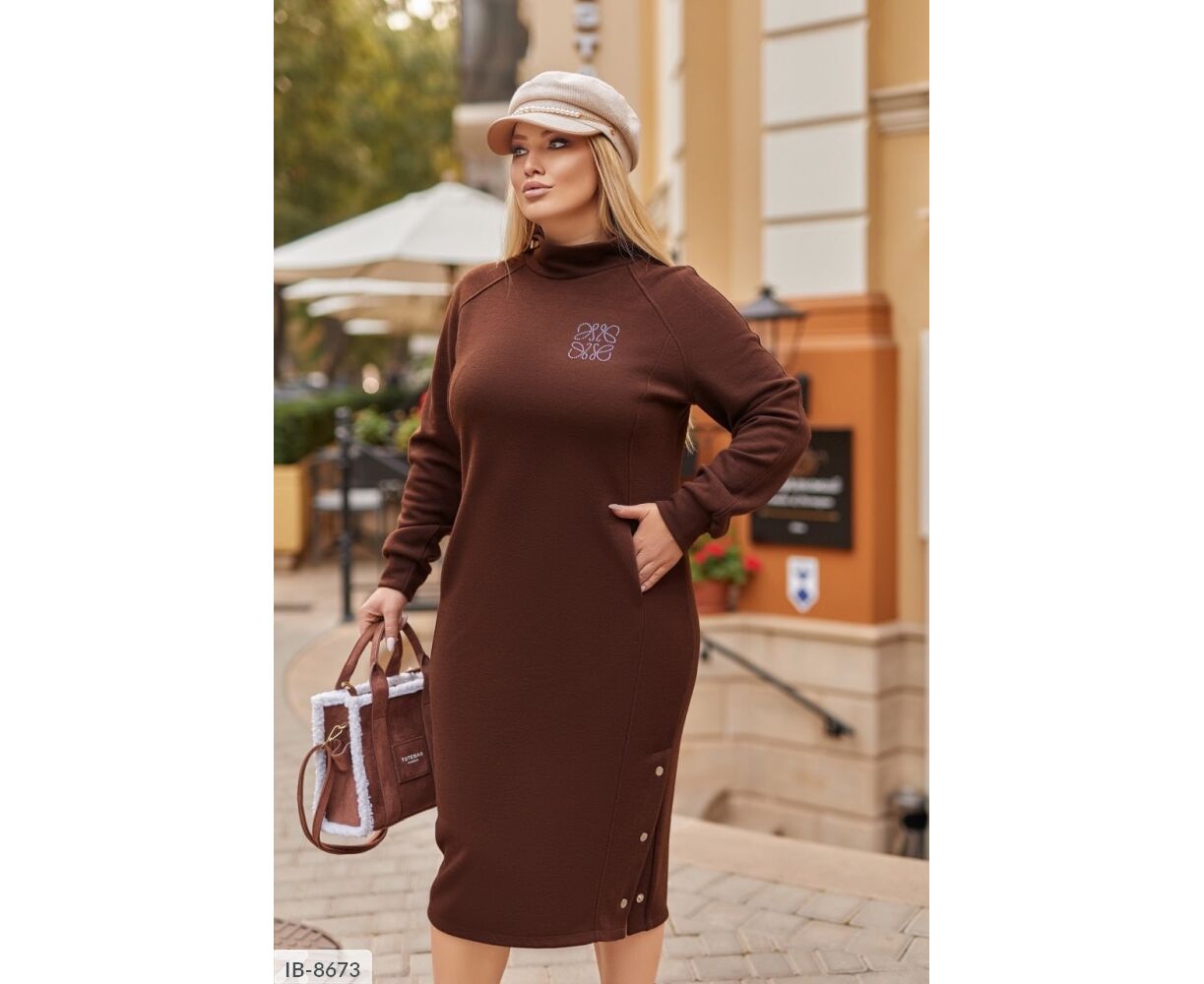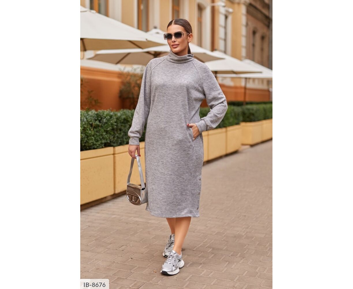 Сукня вільного крою, на грудях-прикраса зі страз, рукав реглан, з кишенями, знизу з розрізами на кнопках.
