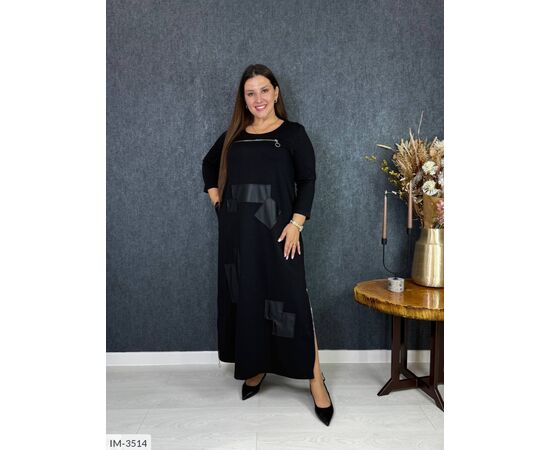 Довге плаття в підлогу, прикрашене шкіряними вставками + робоча молнія на грудях, які привертають увагу, як цікава родзинка. З боків по низу плаття дві робочі молнії.