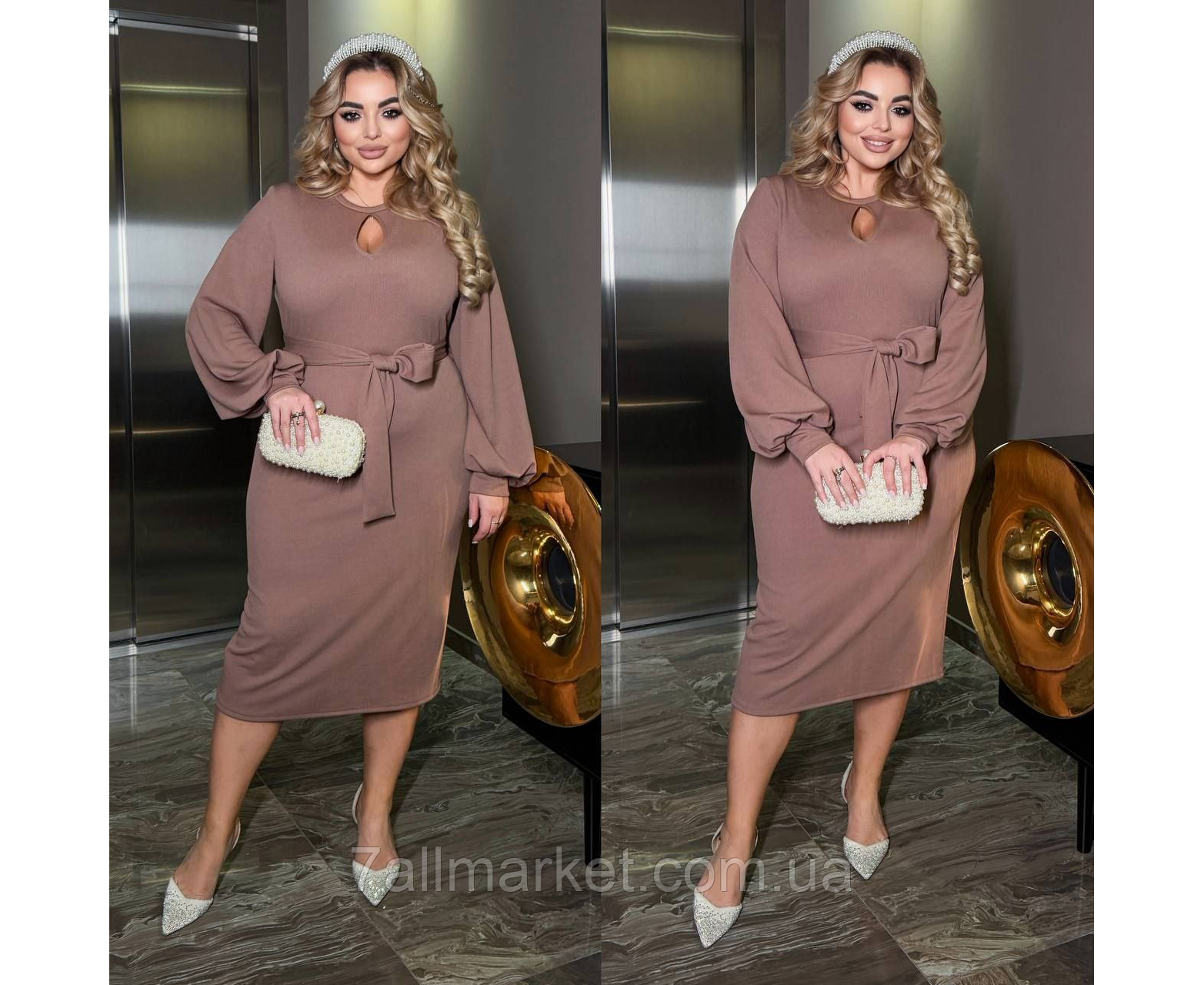 Сукня Модель № 7915-1 ЯКІСТЬ ВІДМІННА Розмір : 46-48; 50-52; 54-56; 58-60 Тканина : рубчик ( гарно тягнеться ) Довжина сукні : 120 см. Довжина рукава : 70 см. Святкова сукня з широкими рукавами на манжеті , пояс з основної тканини