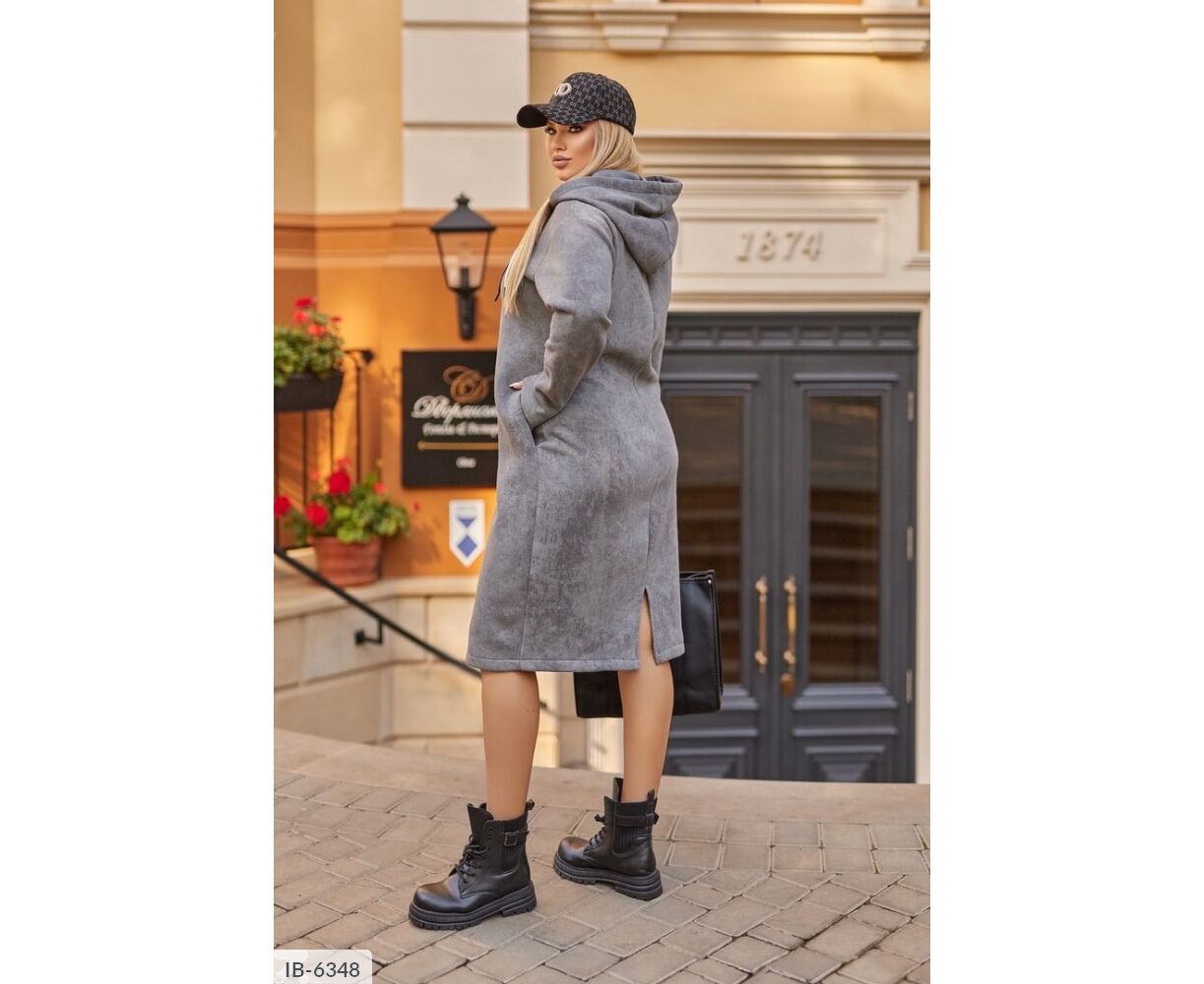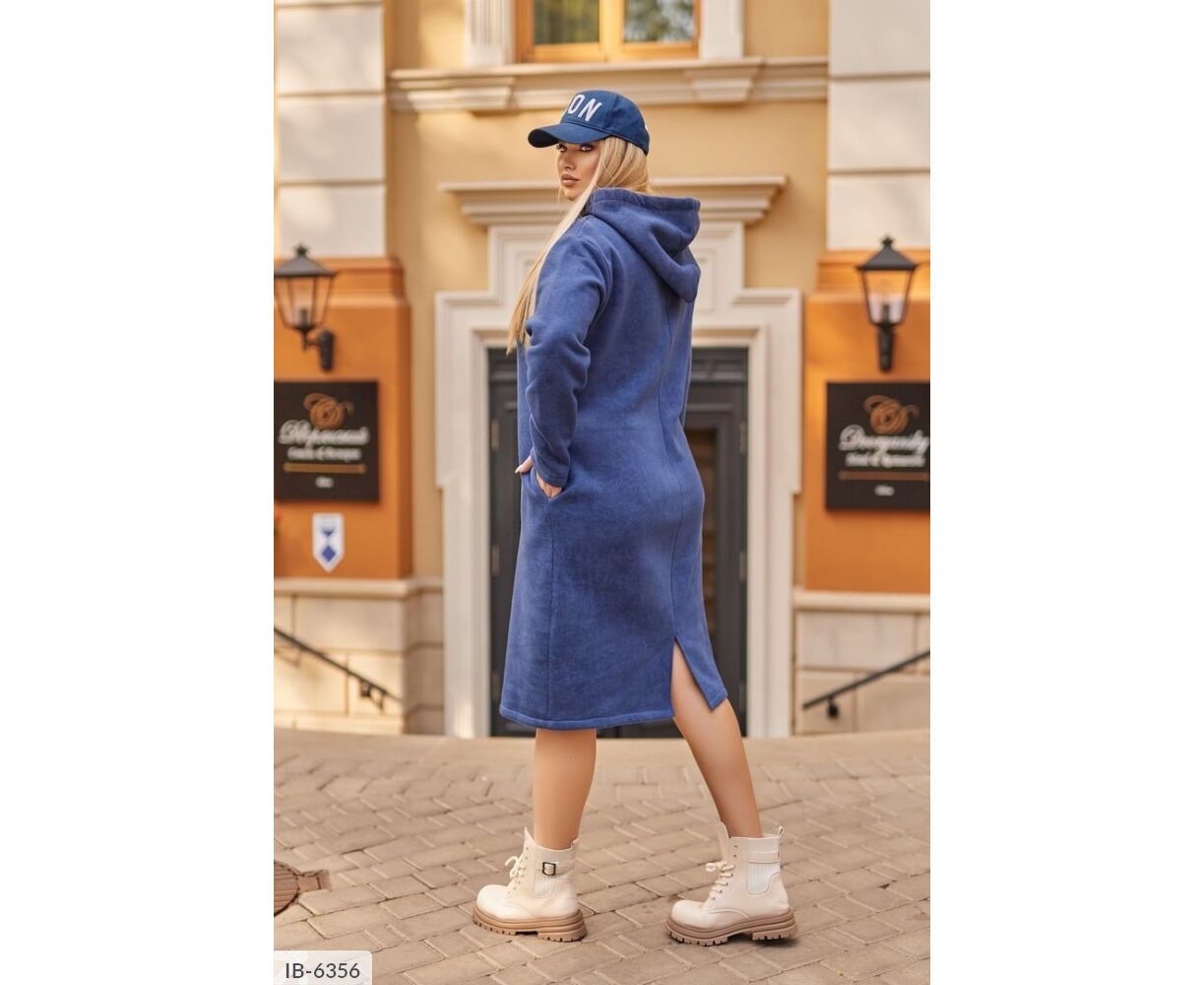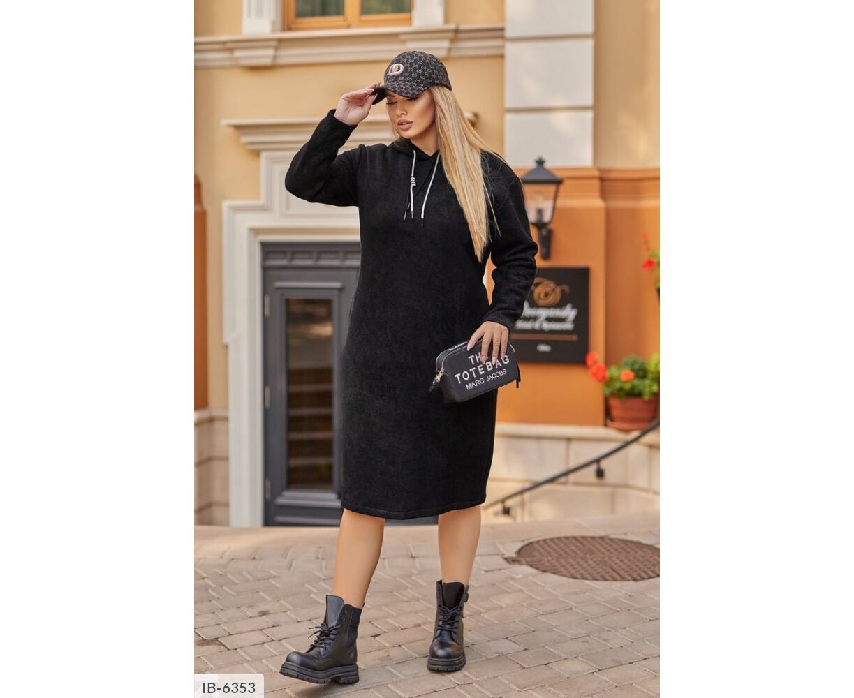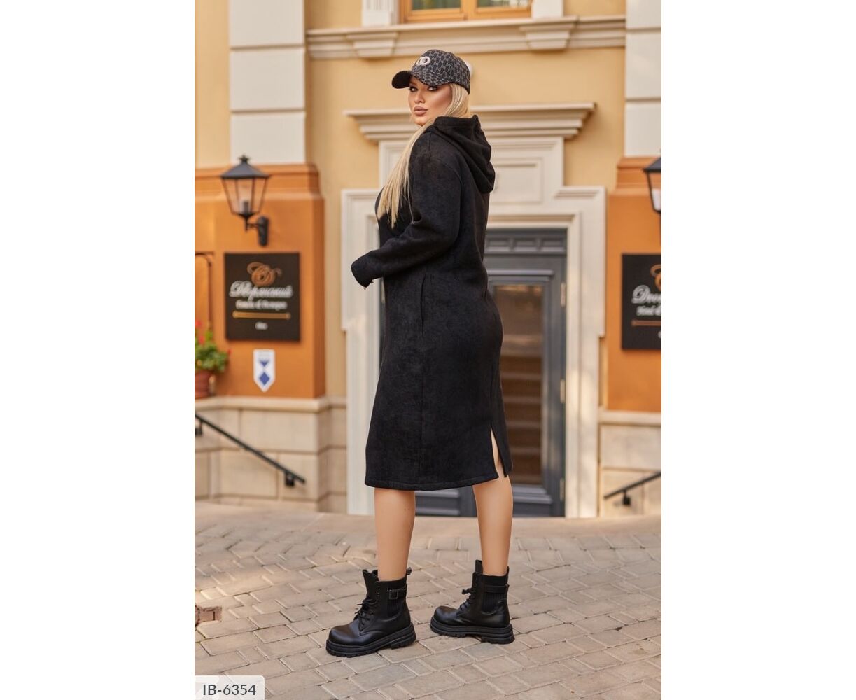 Сукня вільного крою, капюшон затягується подвійним шнуром (шнур може змінюватися), в бічних швах має кишені, ззаду з розрізом.