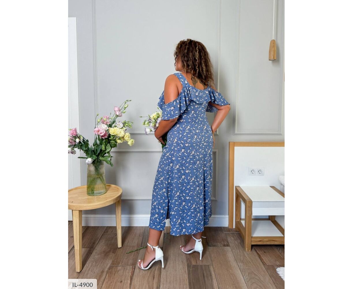 Подовжений сарафан на бретельках: на грудях робочі ґудзики, з боків розрізи до коліна, на грудях та рукавах волани.