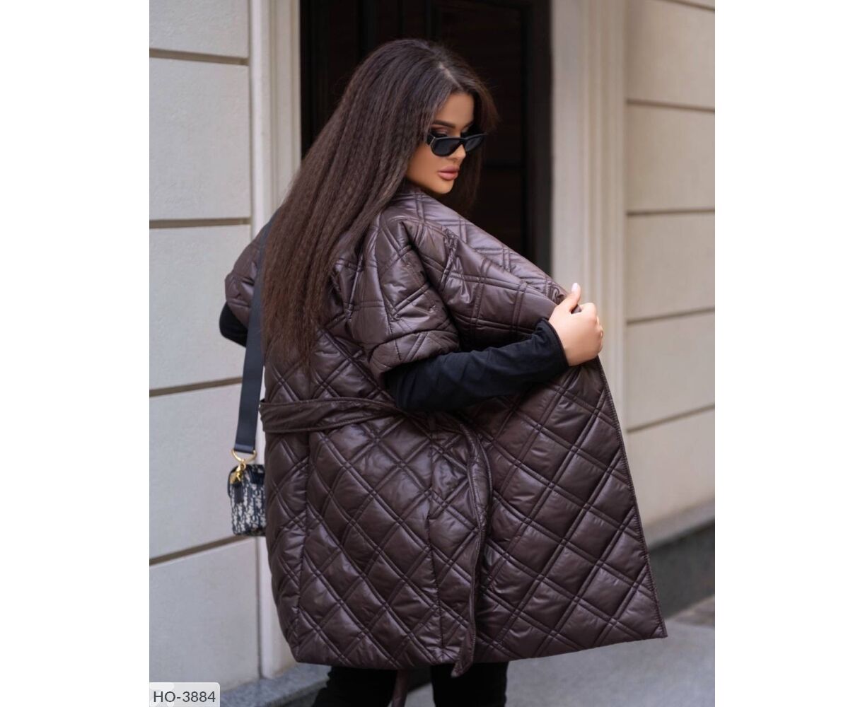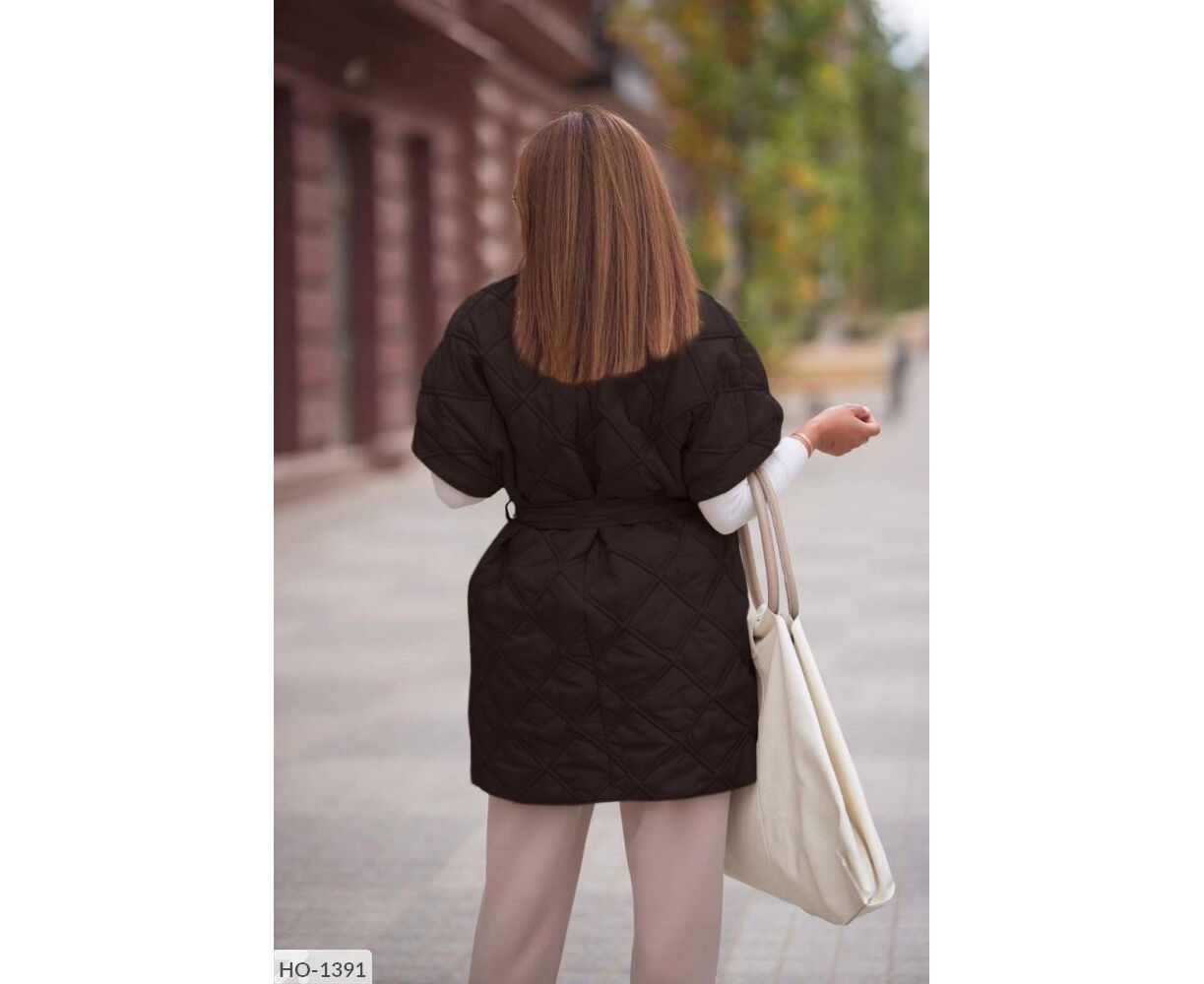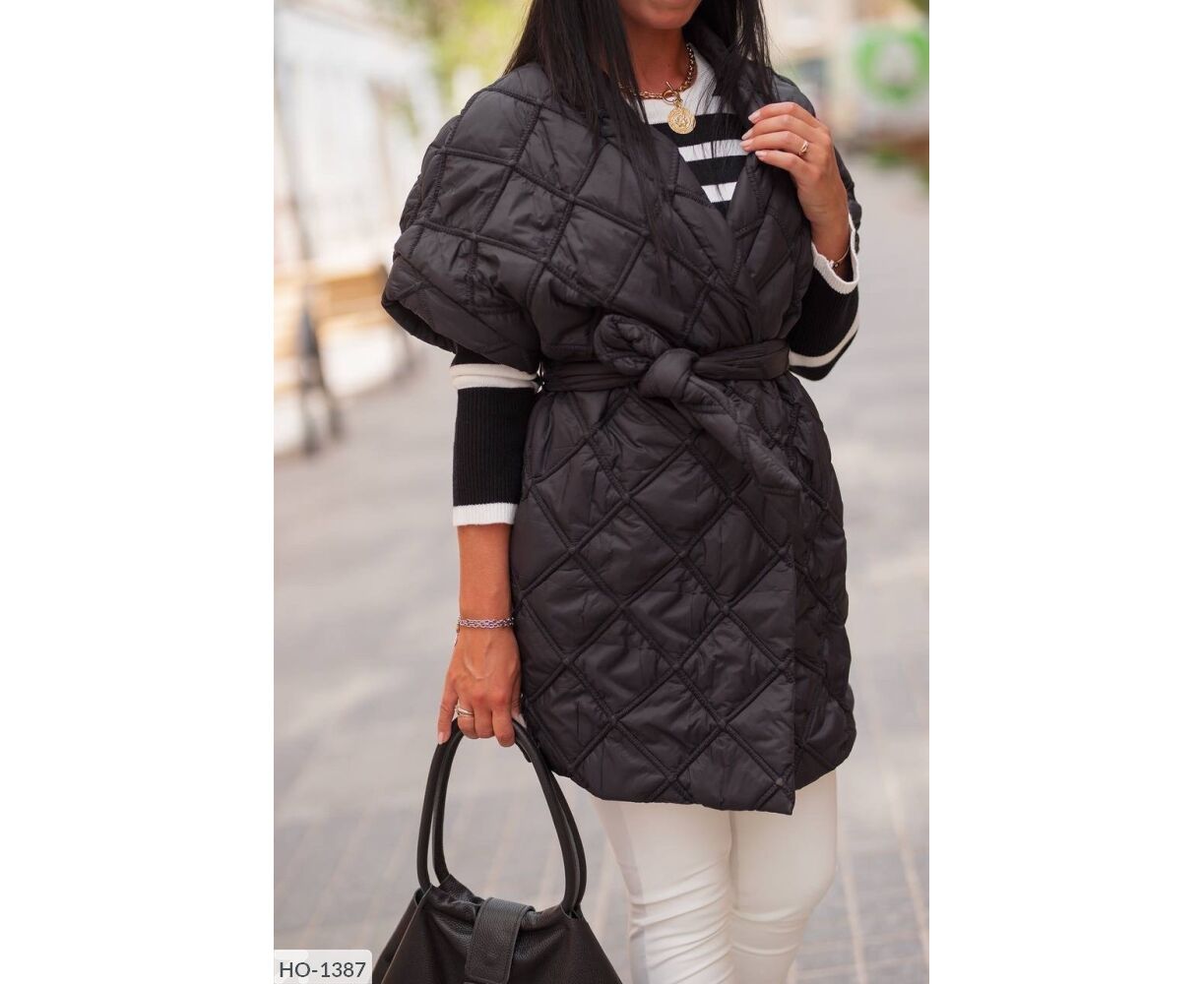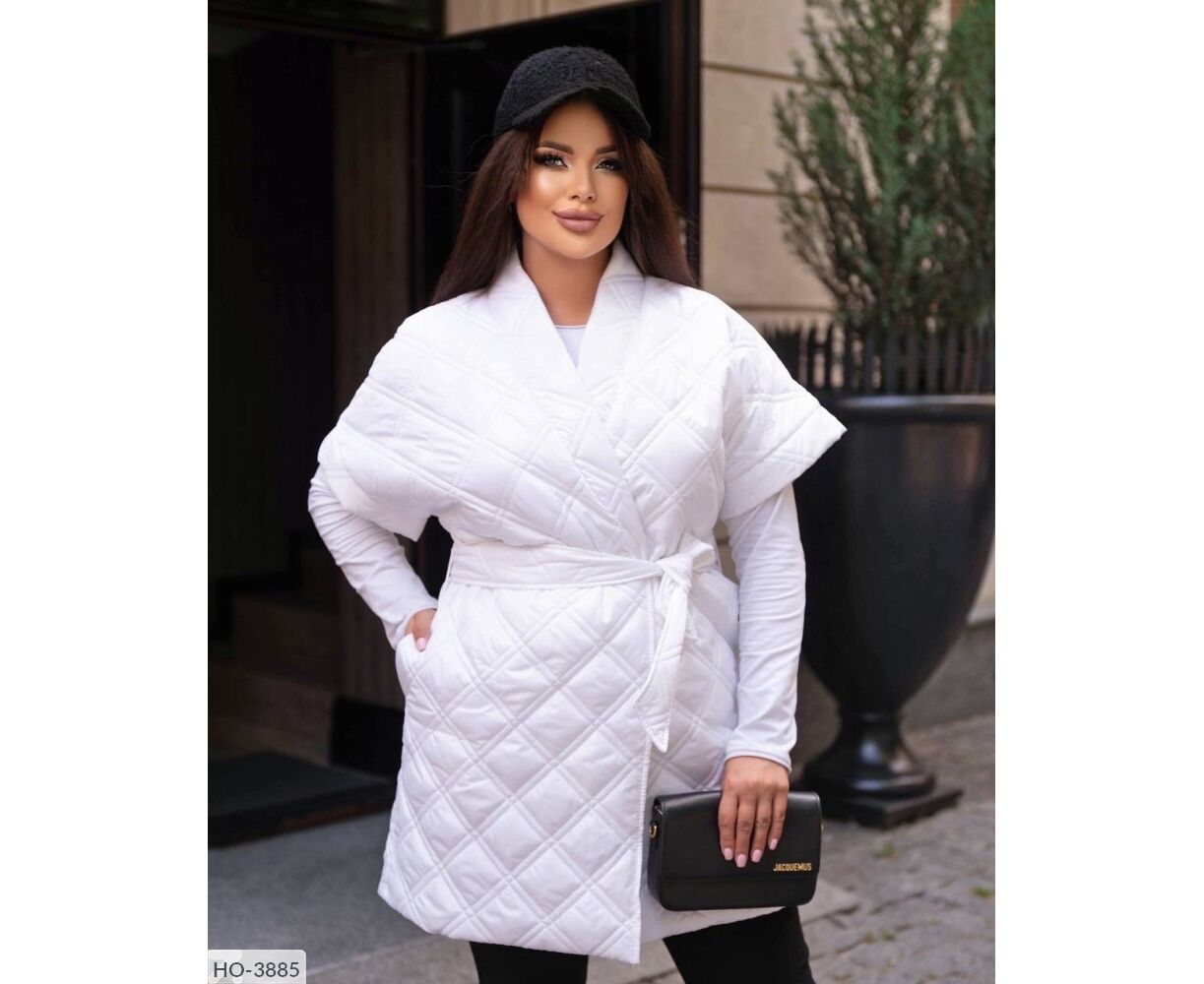Жилет-кімоно на запах, талія фіксується ґудзиком + поясом, всередині є зав'язки, які фіксують талію з середини, з боків зручні кишені. Цікавий подвійний ромб. Параметри моделі-батал ОГ 110, ОТ 86, 110 ОС, ріст 165см, на ній одягнений 50-52