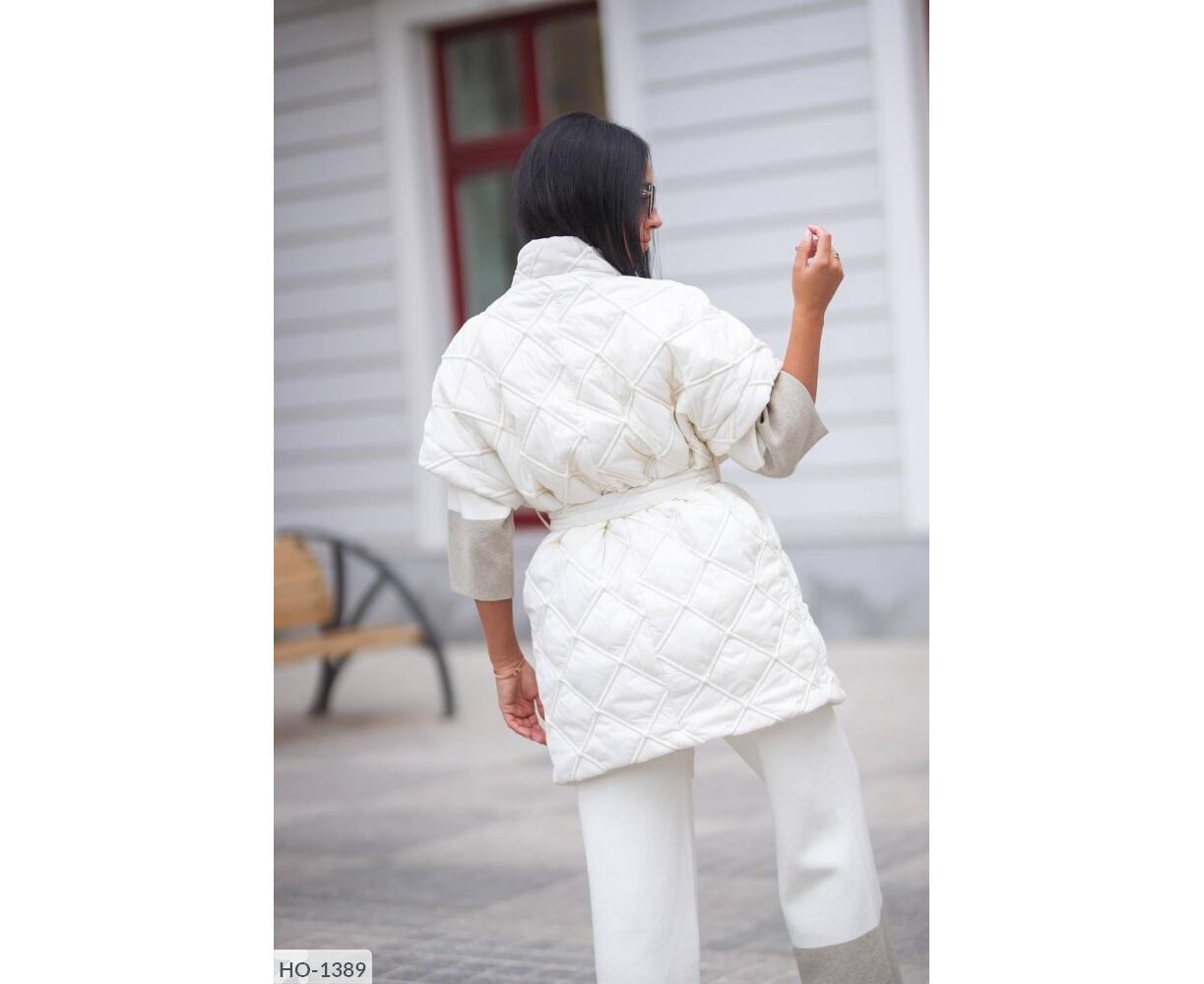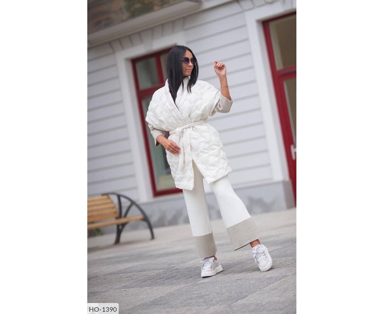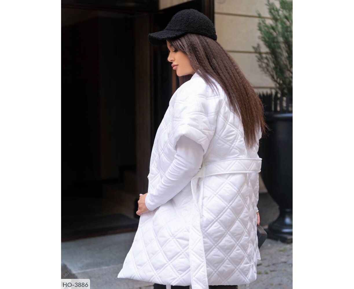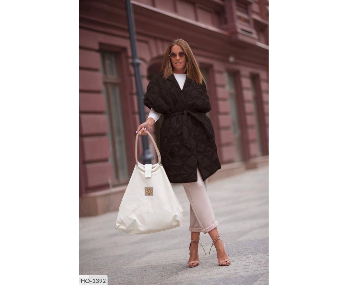 Жилет-кімоно на запах, талія фіксується ґудзиком + поясом, всередині є зав'язки, які фіксують талію з середини, з боків зручні кишені. Цікавий подвійний ромб. Параметри моделі-батал ОГ 110, ОТ 86, 110 ОС, ріст 165см, на ній одягнений 50-52