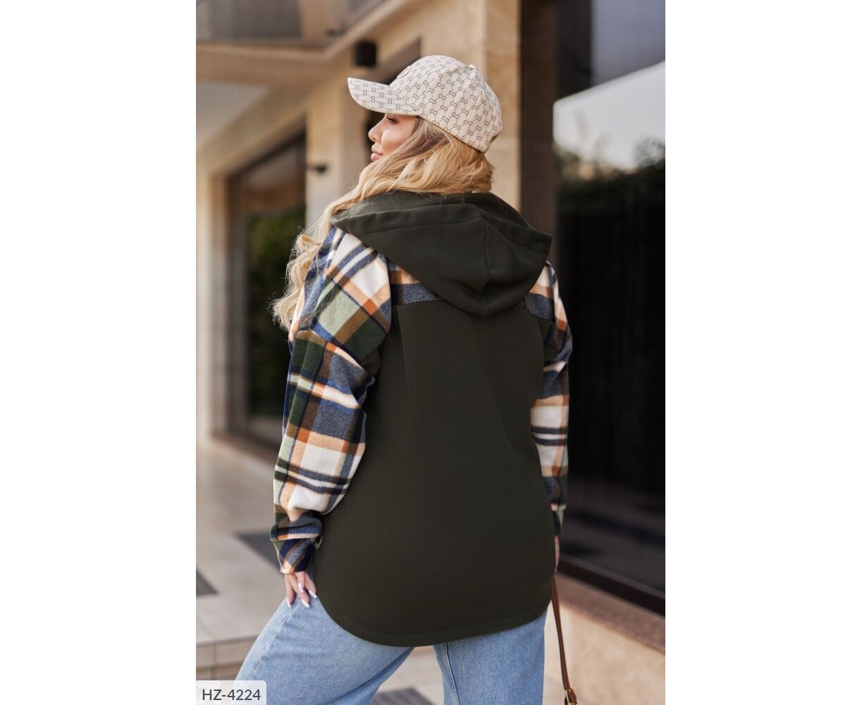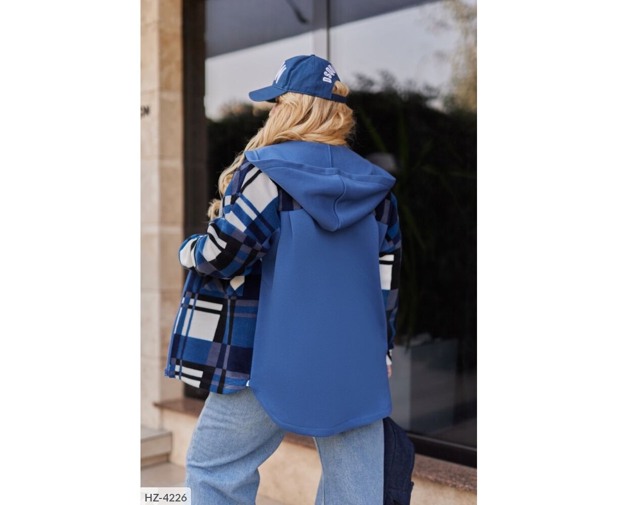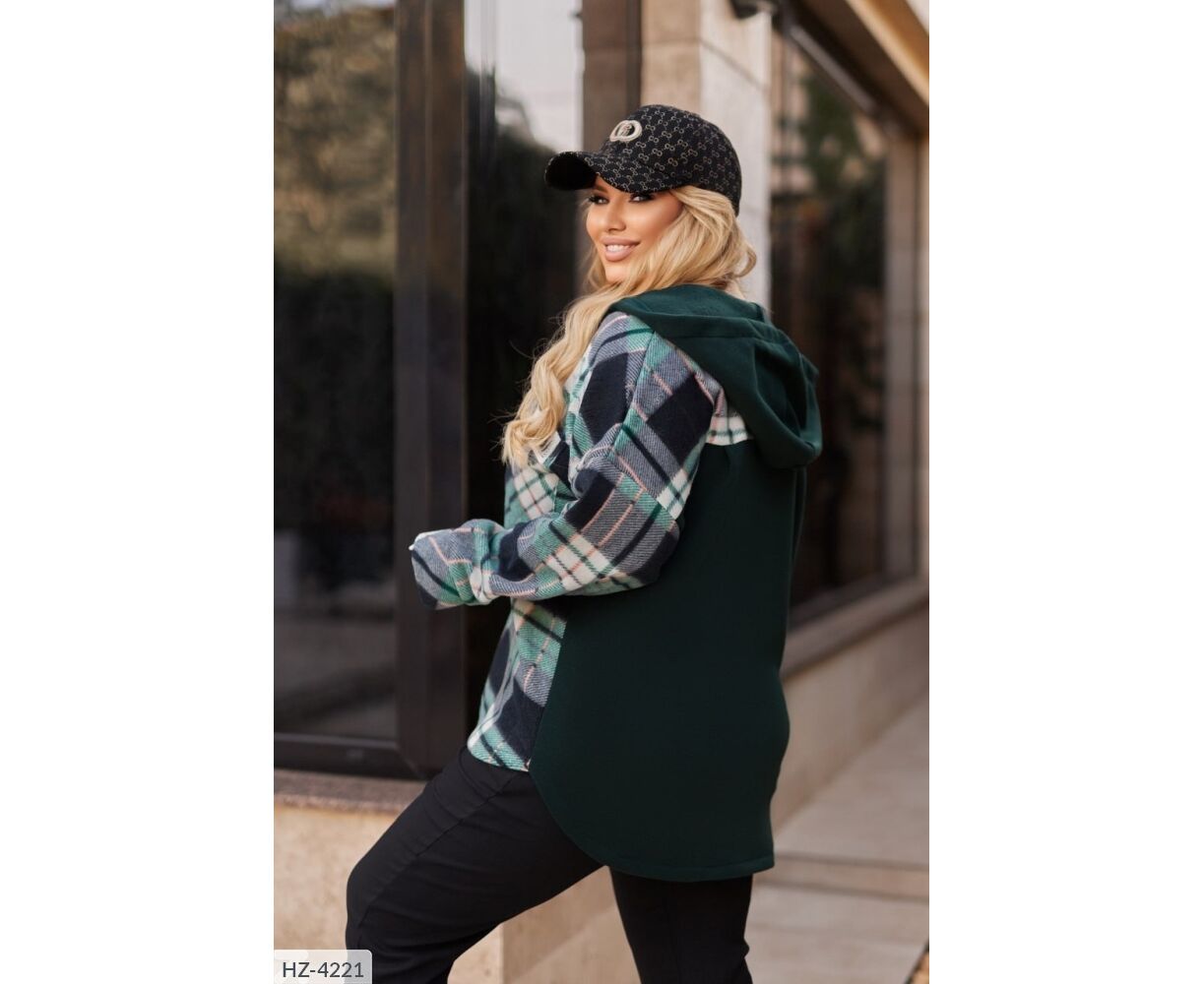 Сорочка вільного крою в комбінації клітка-кашемір з триниткою фліс. Подовжена сорочка на грудях має накладні кишені, на одному - нашивка, спереду застібається на застібку блискавку, з капюшоном. Довгі рукави зі спущеною лінією плечового шва.
