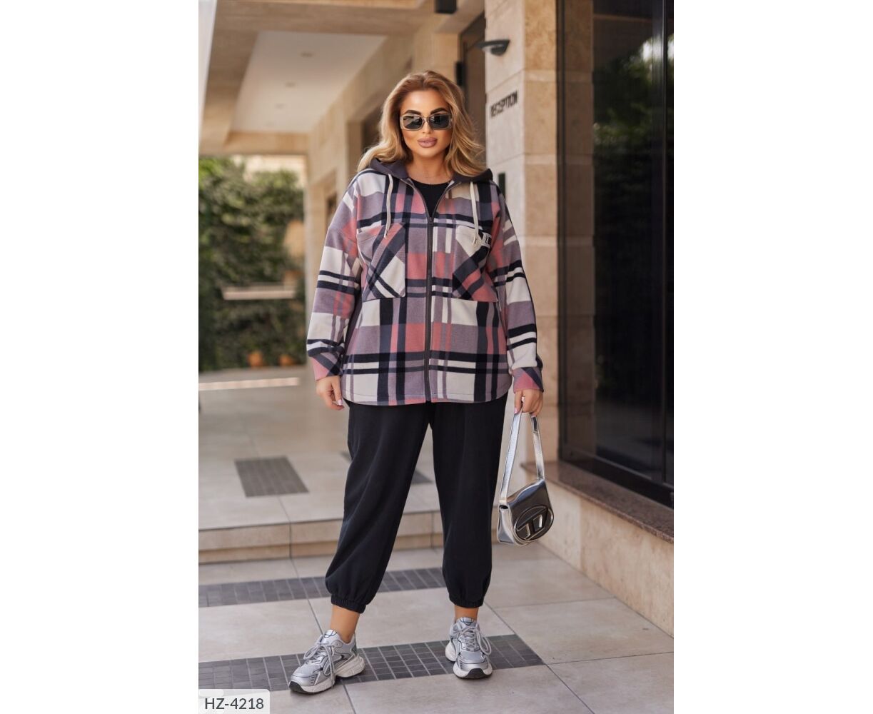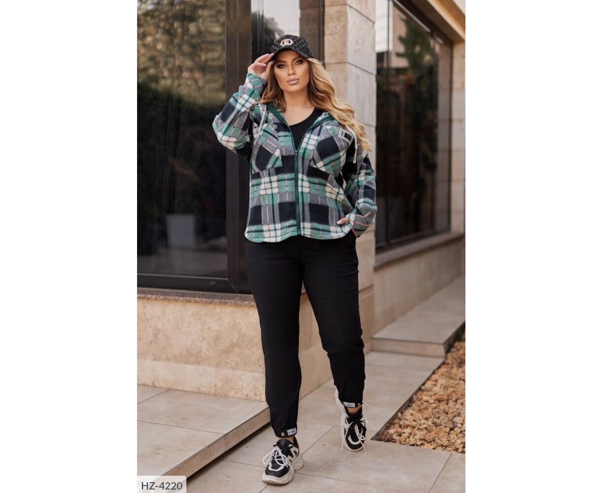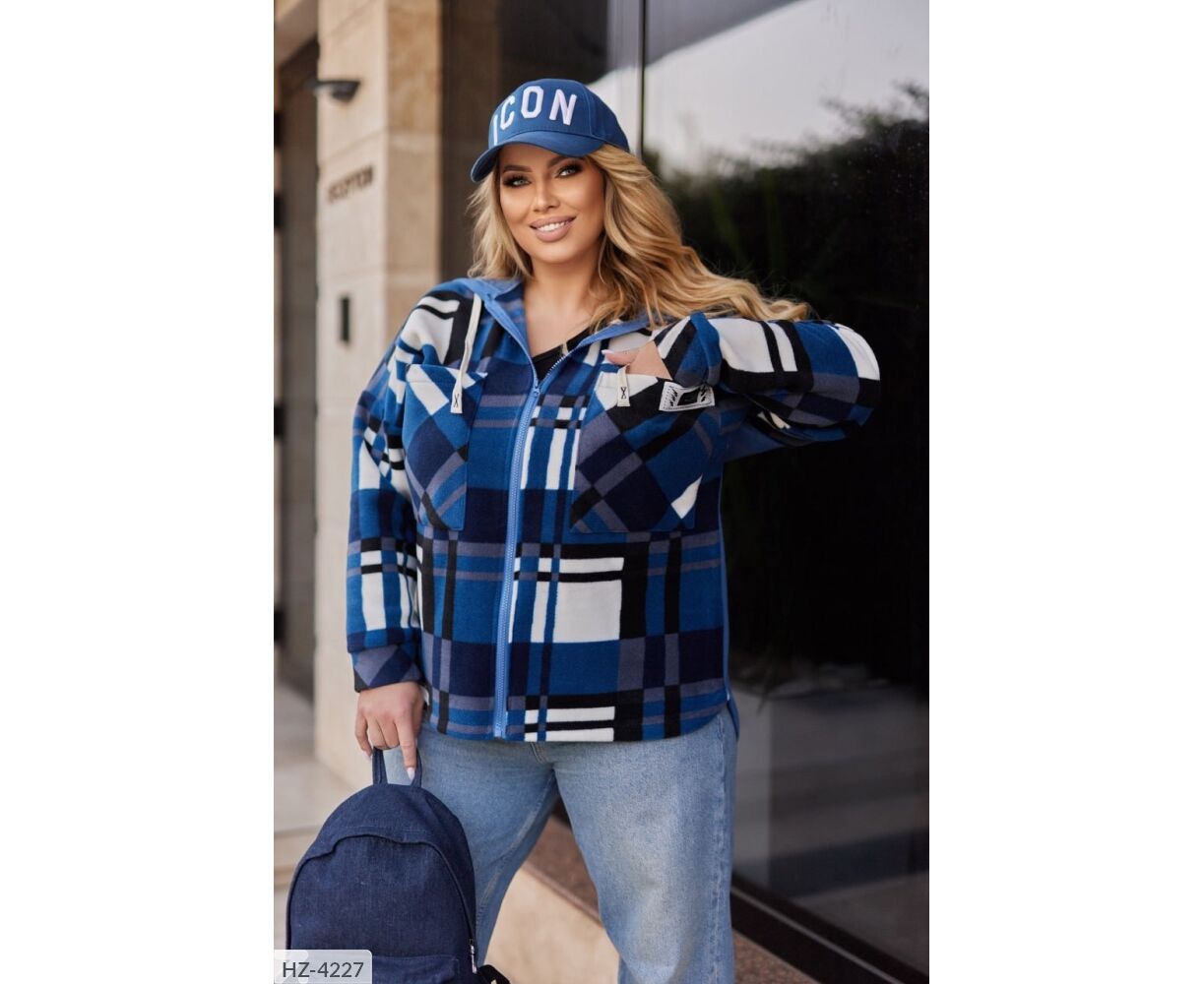 Сорочка вільного крою в комбінації клітка-кашемір з триниткою фліс. Подовжена сорочка на грудях має накладні кишені, на одному - нашивка, спереду застібається на застібку блискавку, з капюшоном. Довгі рукави зі спущеною лінією плечового шва.