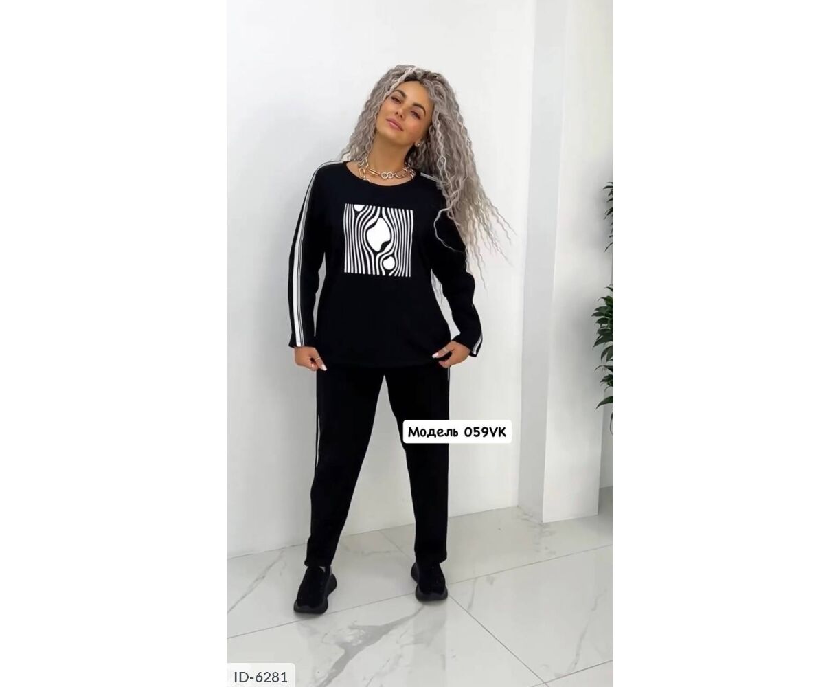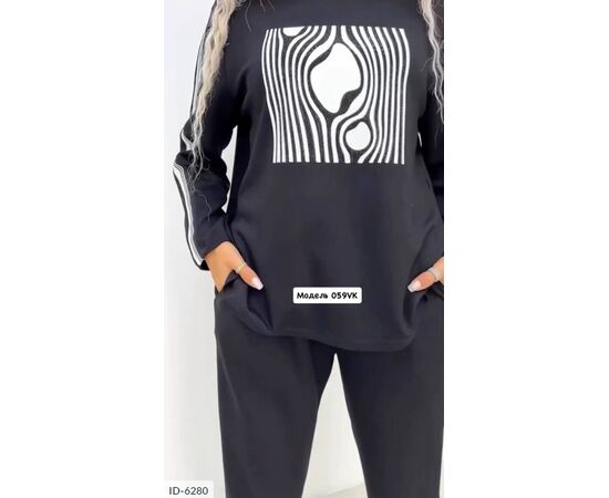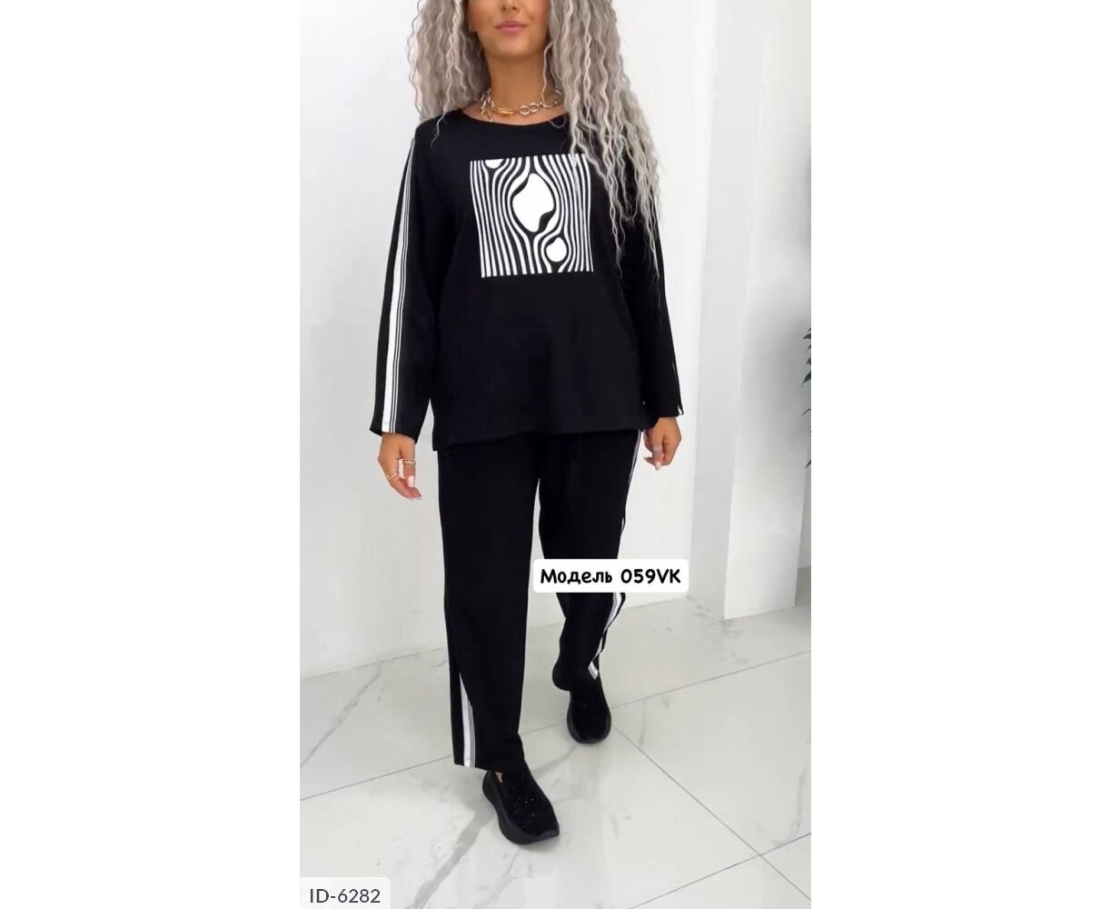 Верх костюма-світшот з якісної двуніткі, прикрашений графічним малюнком у вигляді чорно-білих ліній. З боків рукавів лампаси. Низ костюма вільні штани з аналогічними лампасами і кишенями з боків.