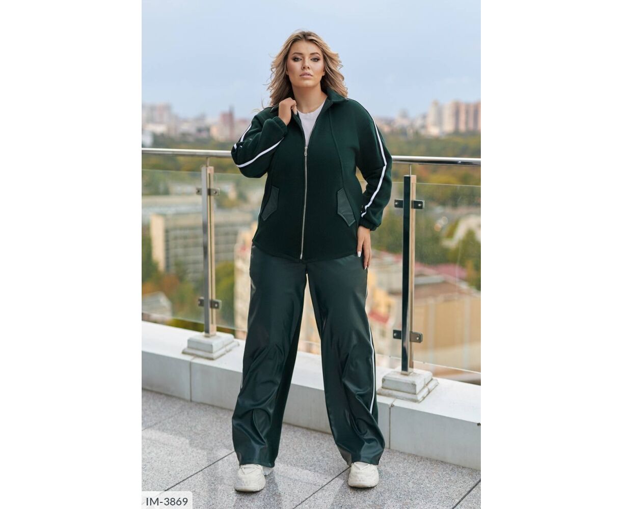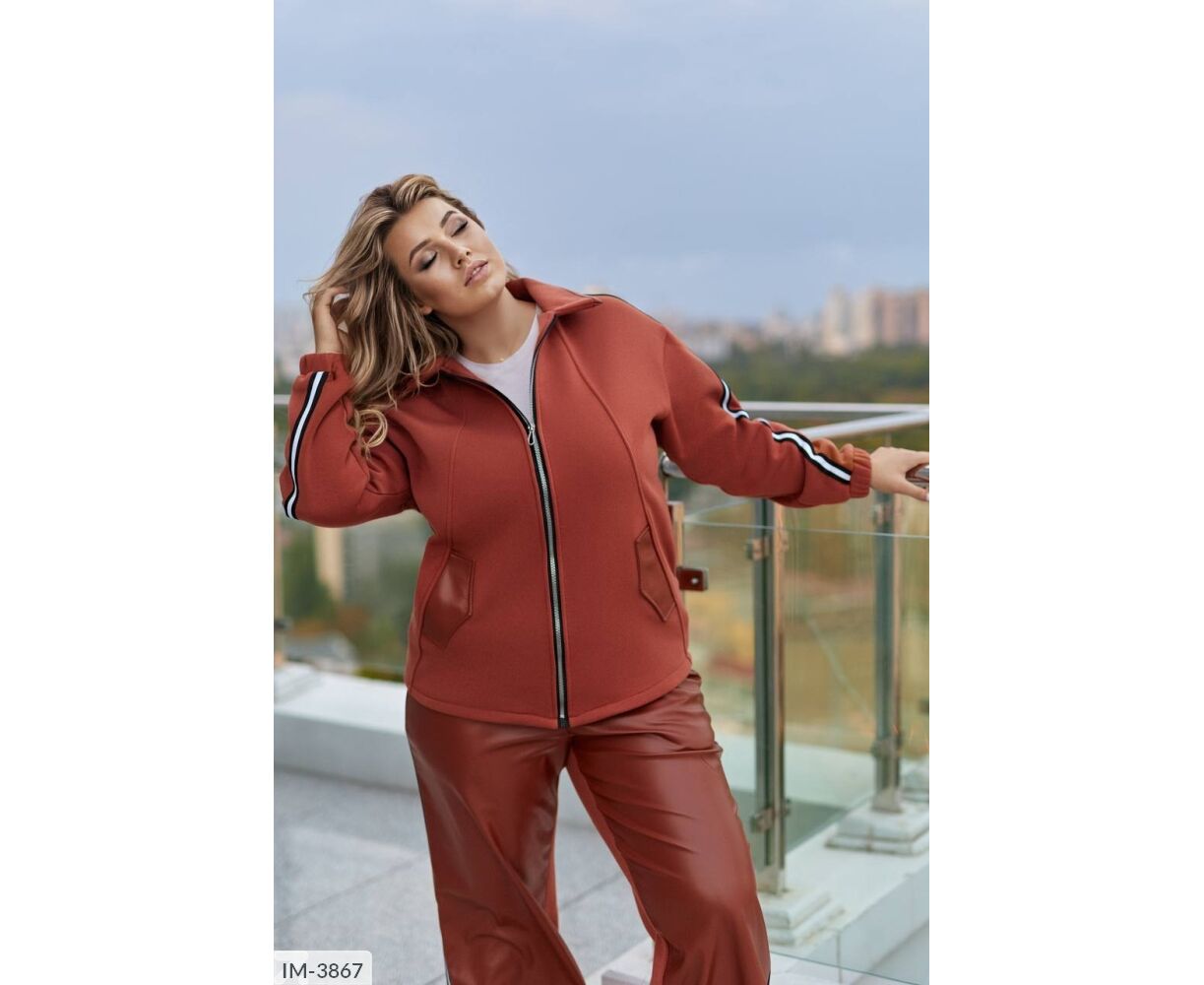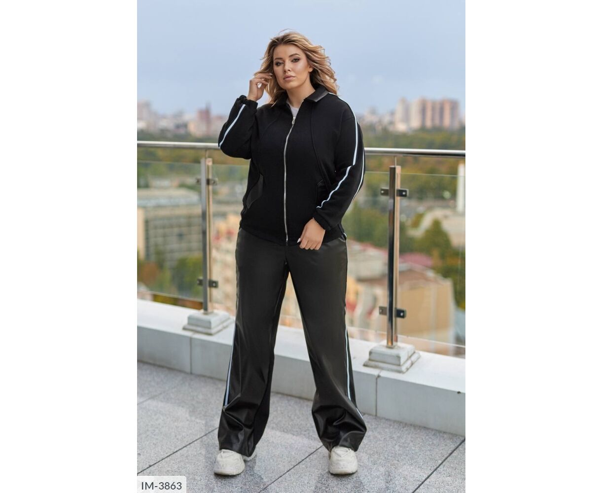 Кофта вільного крою, комір з бічними кишенями декоровані шкірою, з застібкою на блискавці, лампаси на рукавах, довгий спущений рукав, манжети на резинці. Брюки: висока посадка, прямий вільний крій, спереду вставки зі штучної шкіри, сзаду -тринитка, пояс на резинці, лампаси з боків.