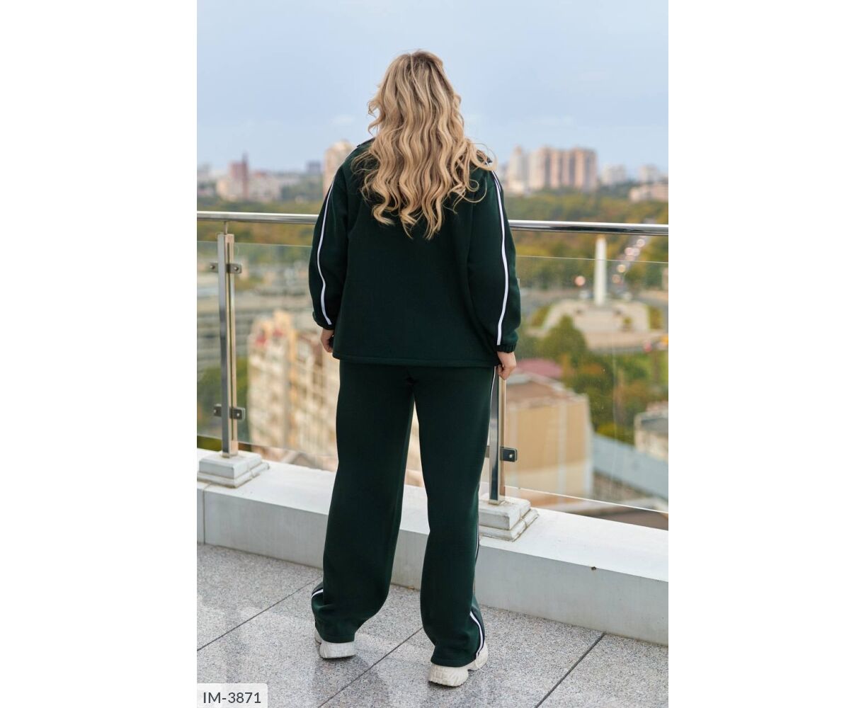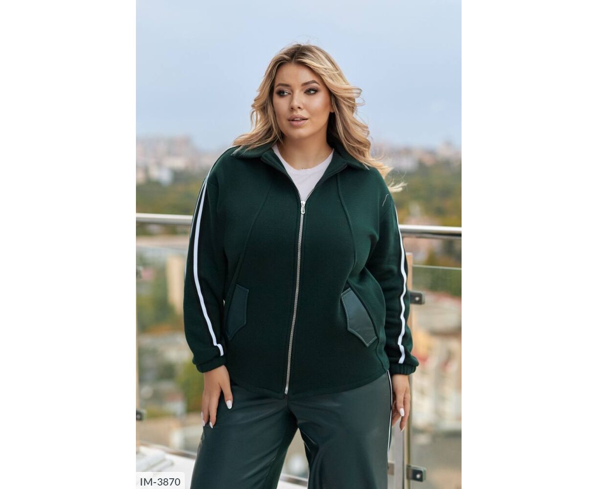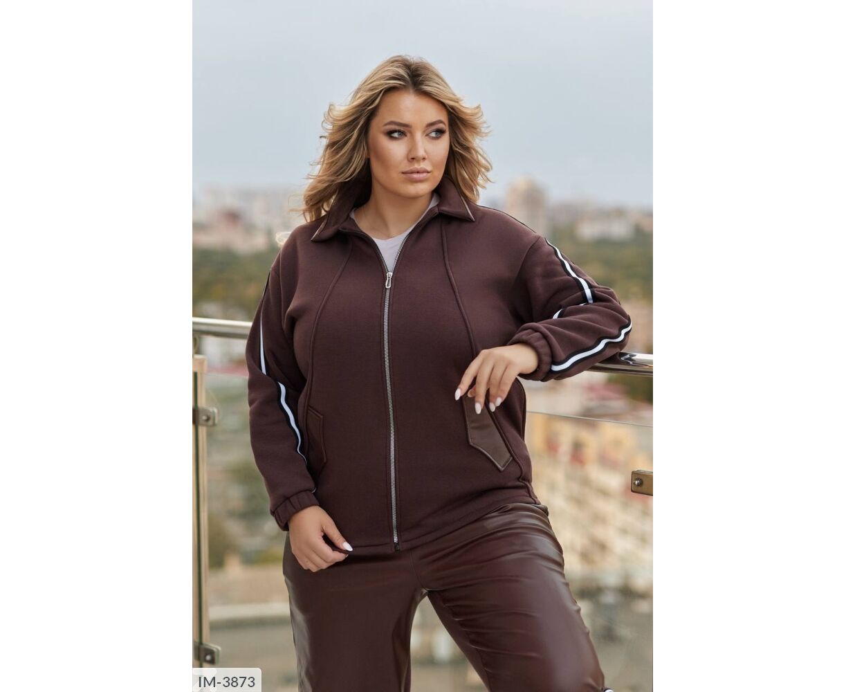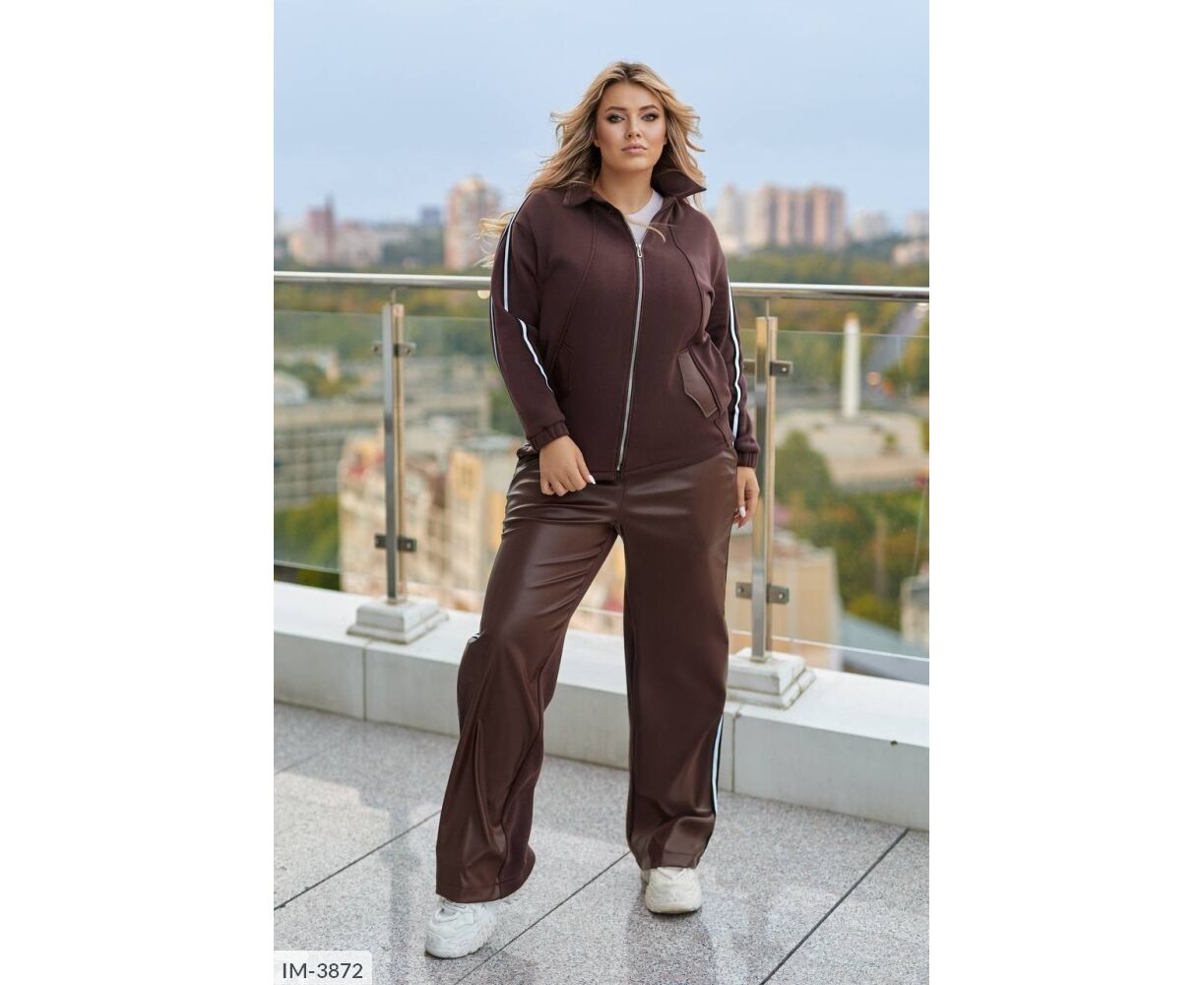 Кофта вільного крою, комір з бічними кишенями декоровані шкірою, з застібкою на блискавці, лампаси на рукавах, довгий спущений рукав, манжети на резинці. Брюки: висока посадка, прямий вільний крій, спереду вставки зі штучної шкіри, сзаду -тринитка, пояс на резинці, лампаси з боків.