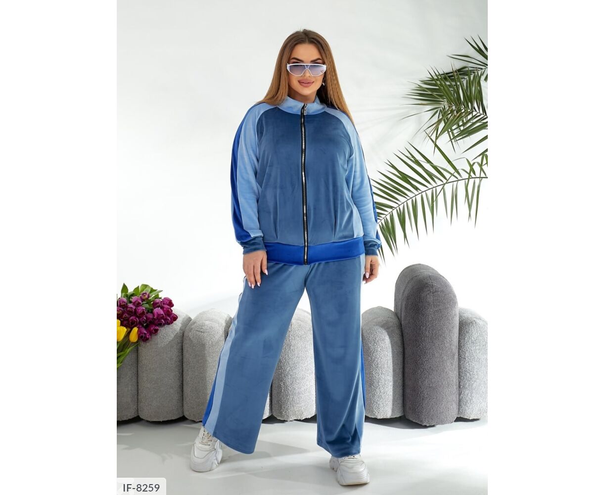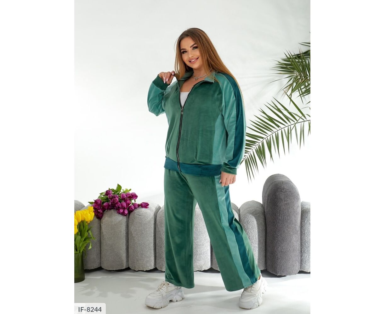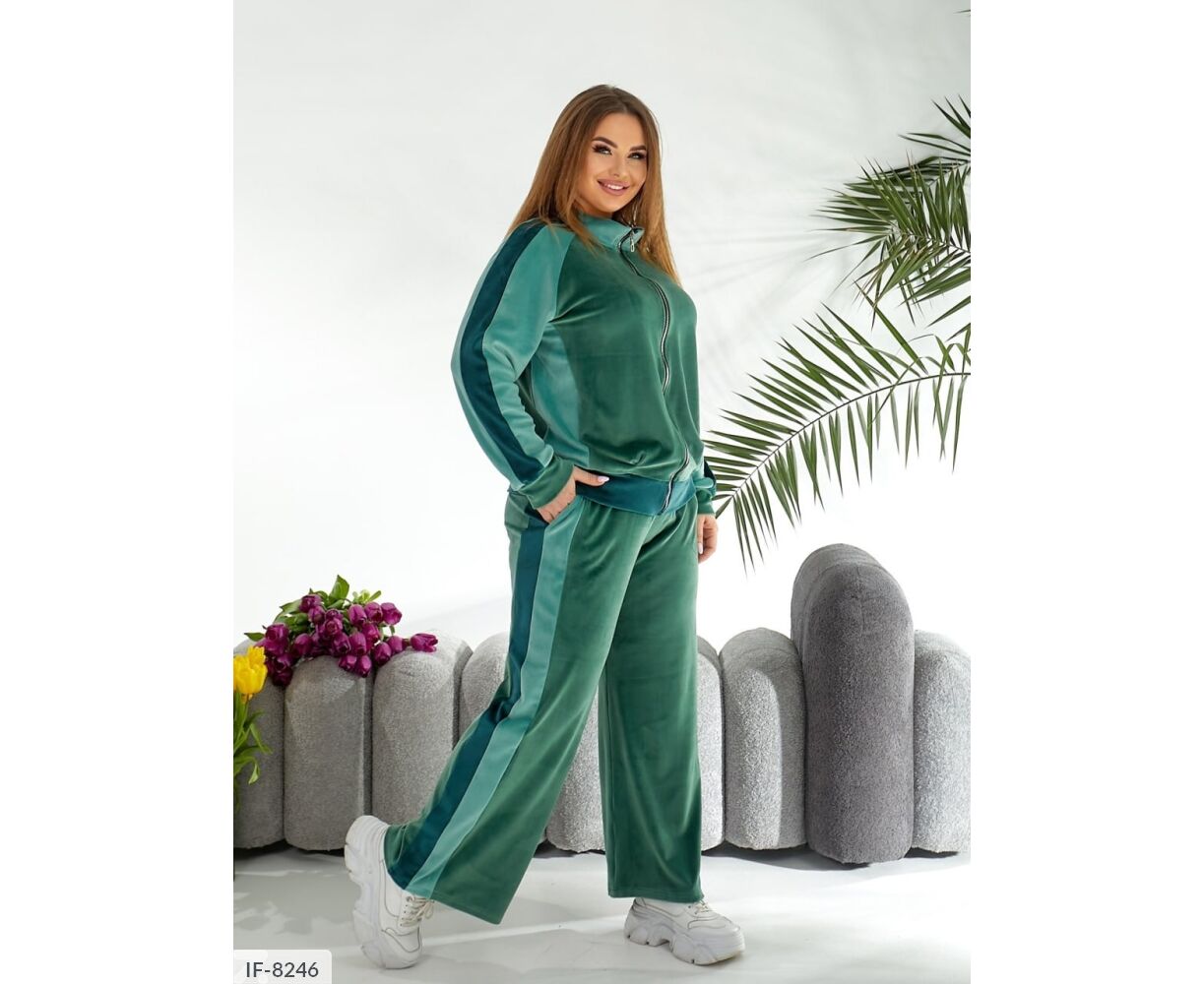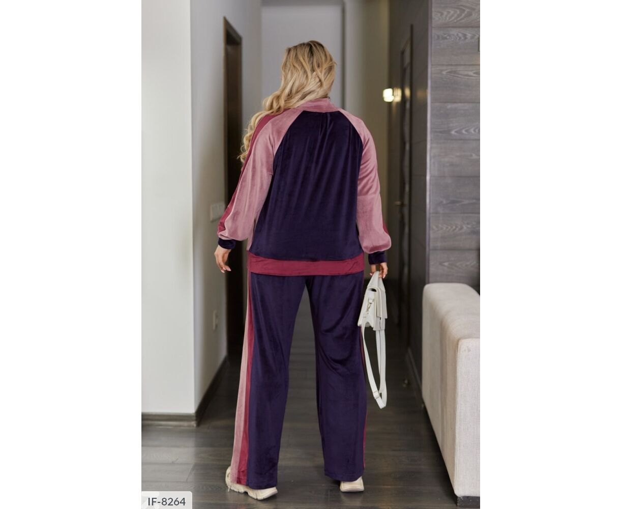 Кофта вільного крою, рукав реглан з лампасами, спереду Застібка блискавка. Штани палаццо, з лампасами, високої посадки і з кишенями.