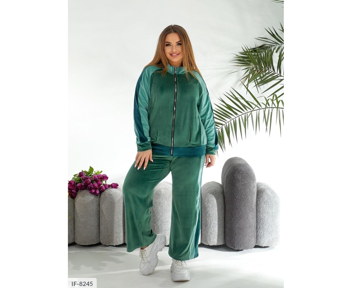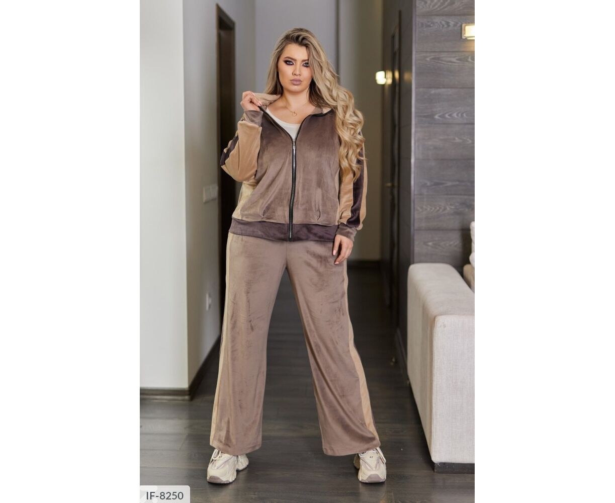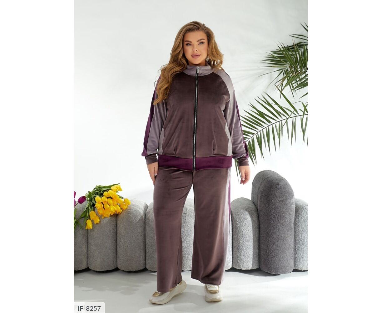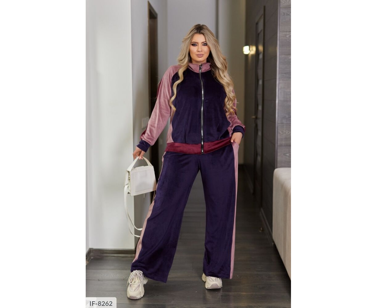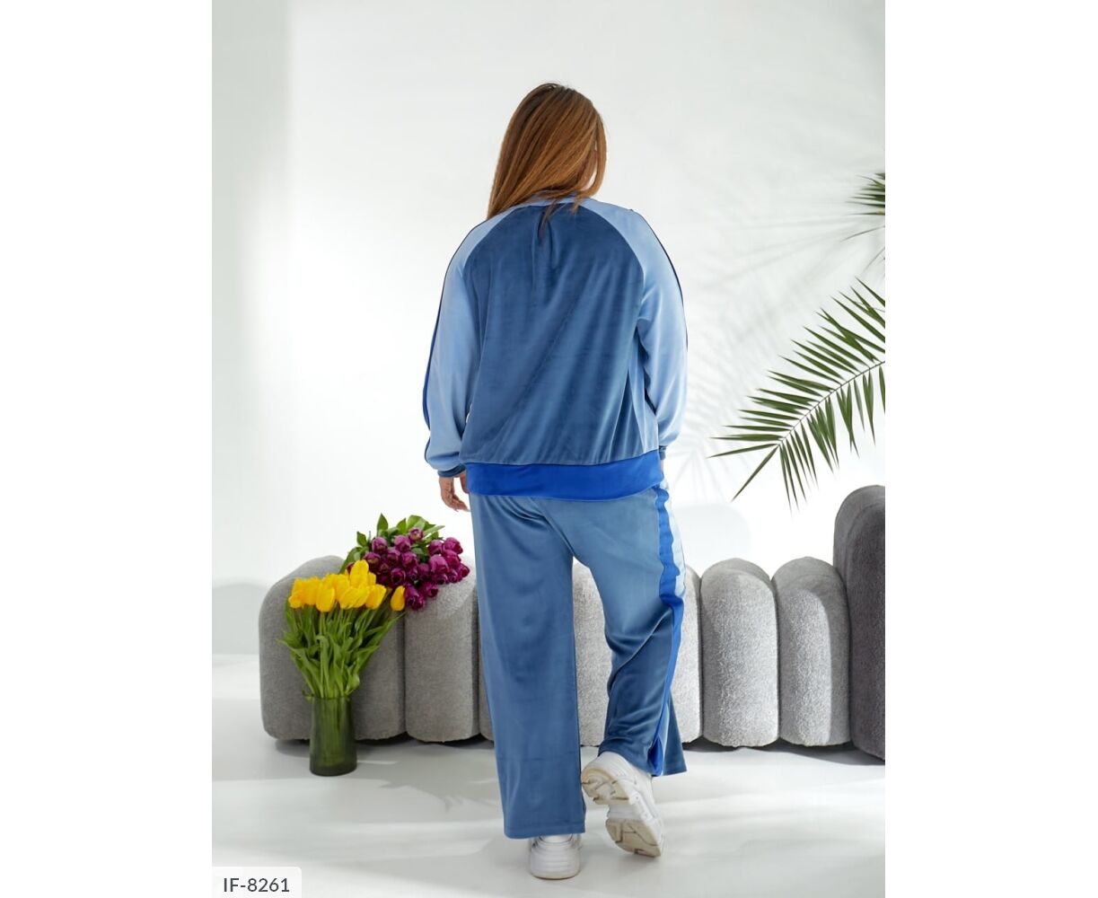 Кофта вільного крою, рукав реглан з лампасами, спереду Застібка блискавка. Штани палаццо, з лампасами, високої посадки і з кишенями.