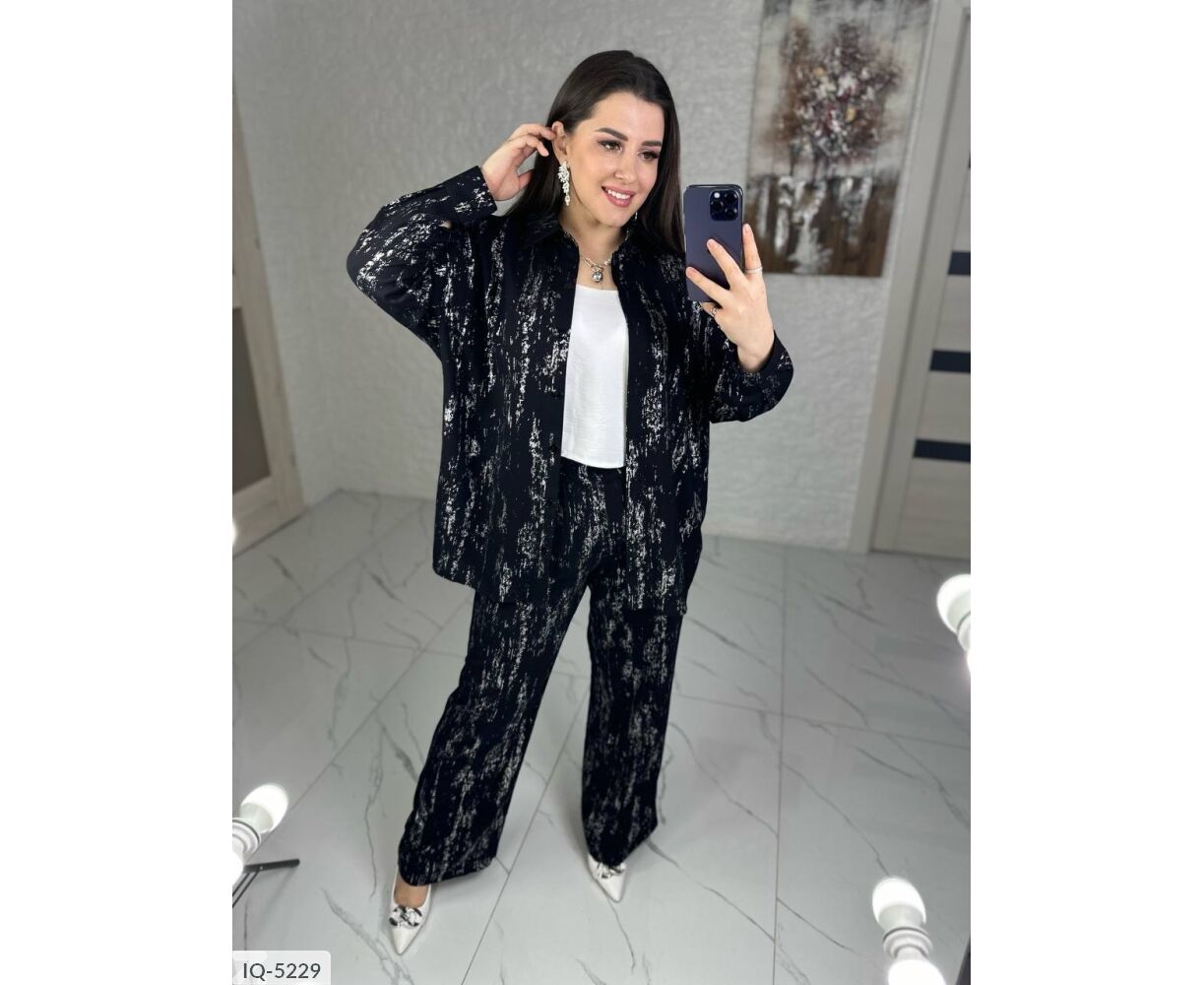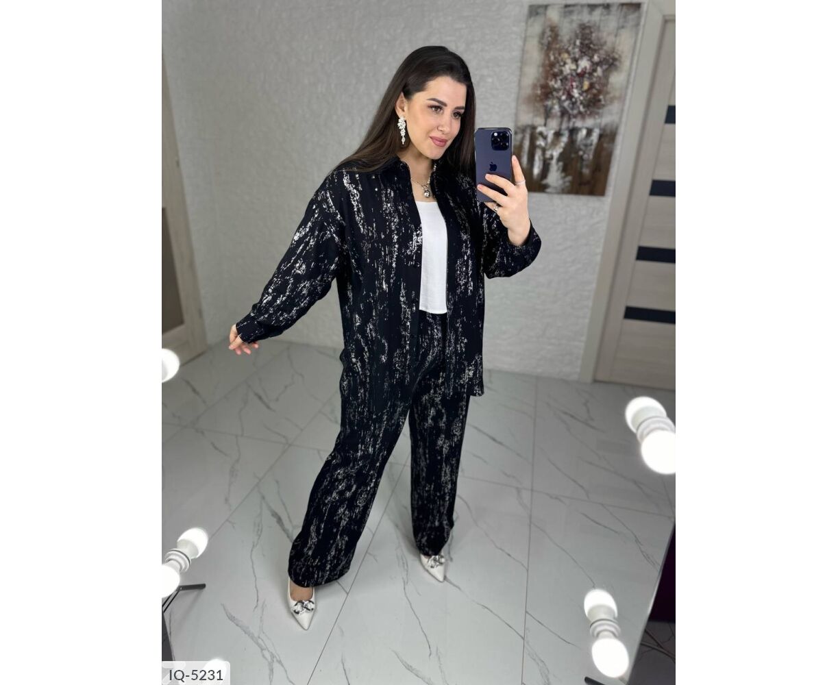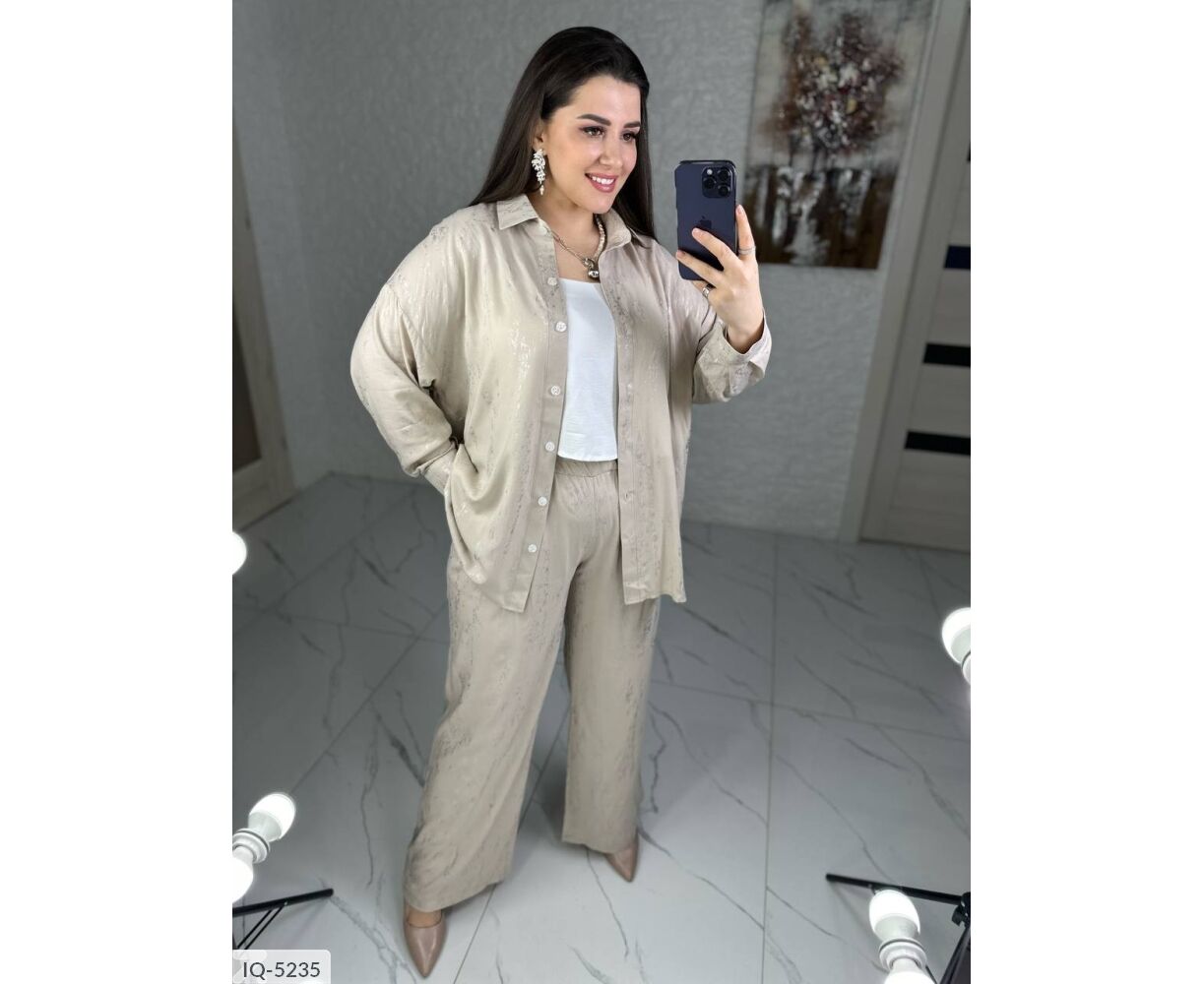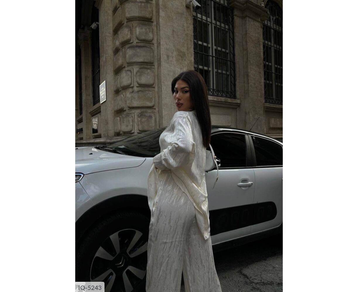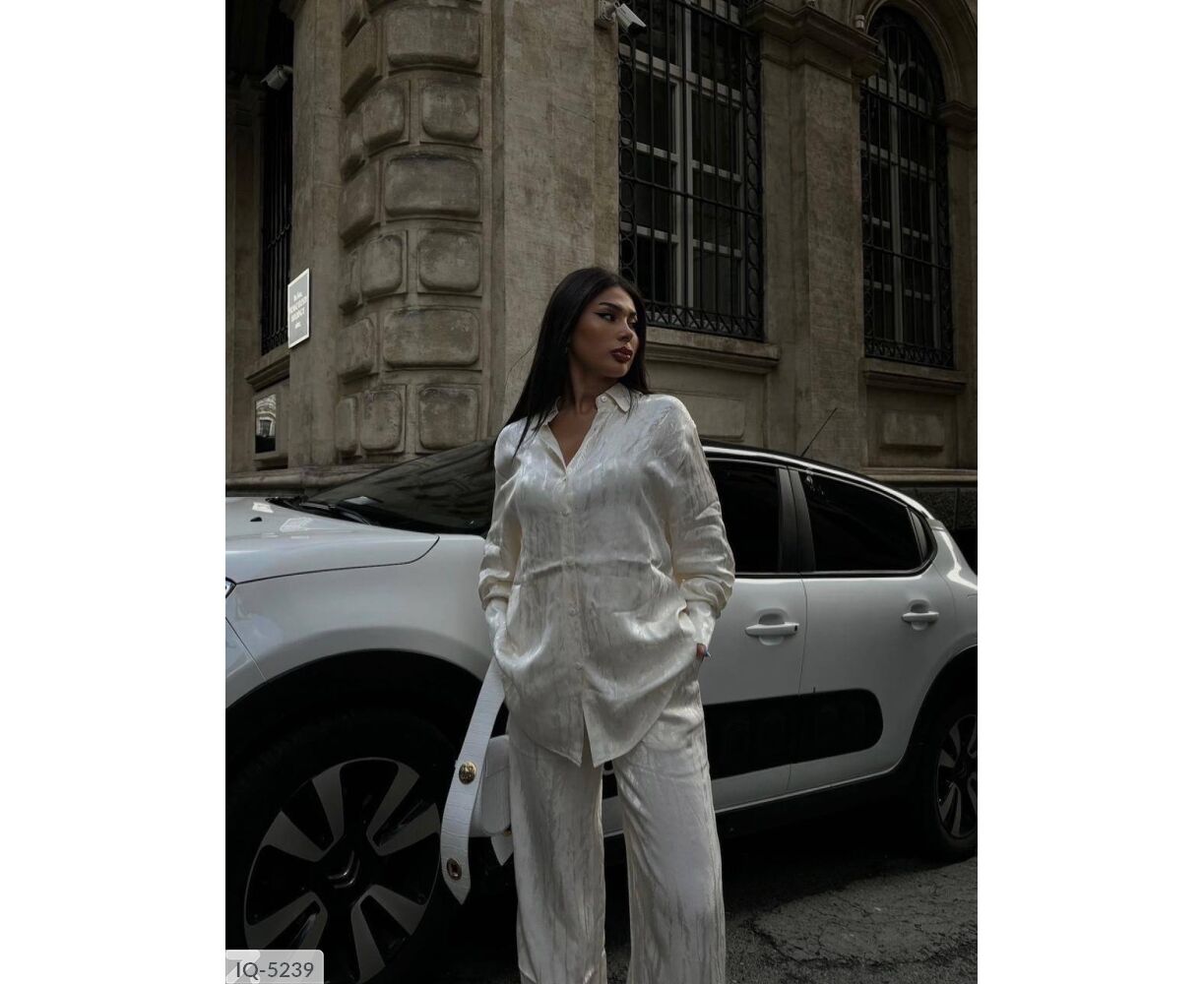 Костюм-двійка: сорочка + штани кльош, приємна тканина з якісним срібним напиленням, переливається гарним сяйвом на світлі, в такому костюмі ви не залишитися не поміченою