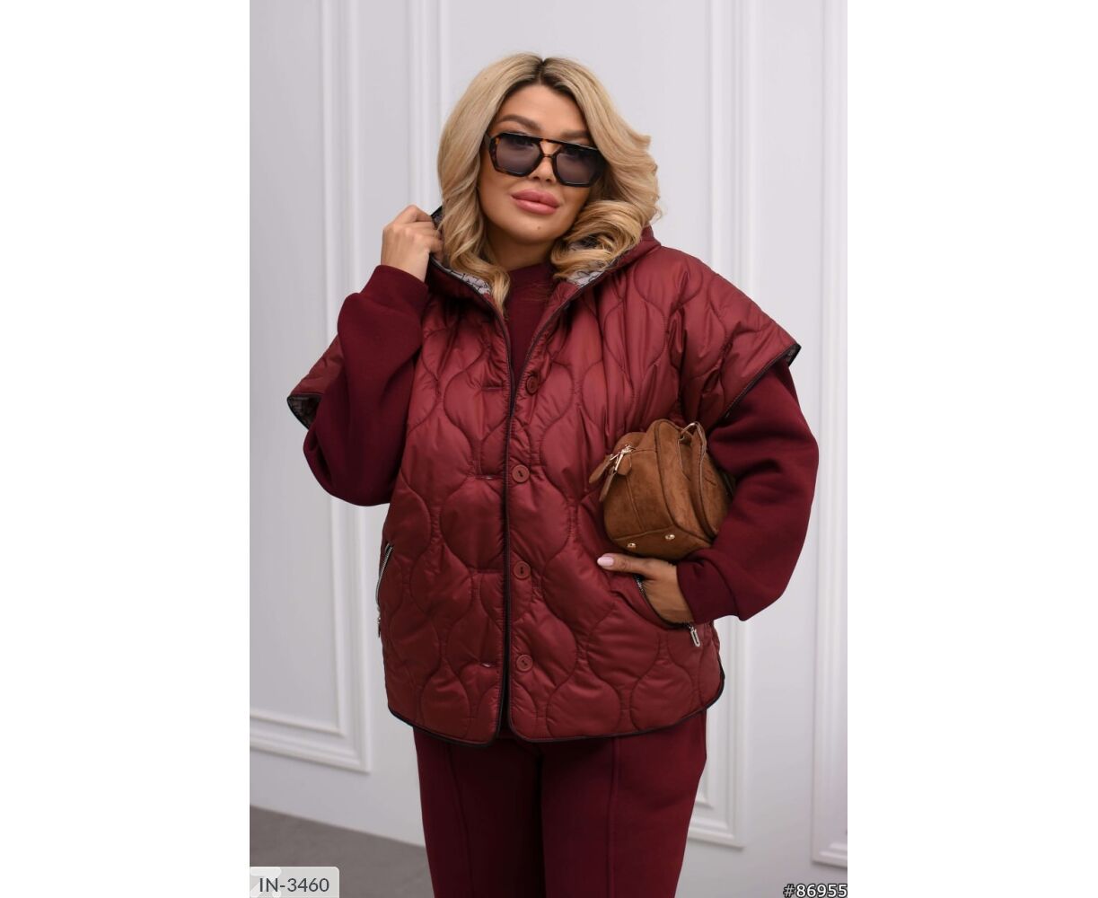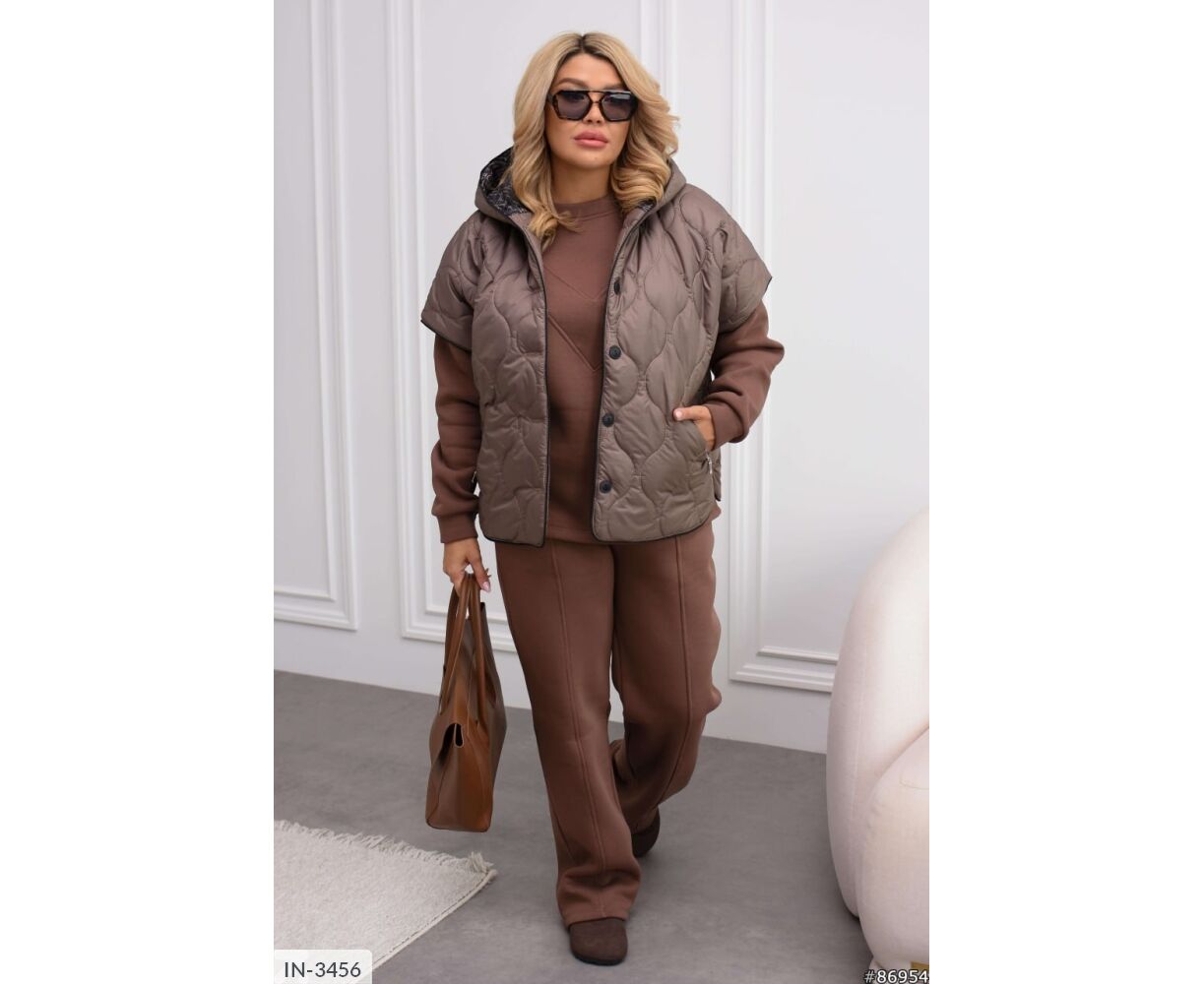 Теплий костюм-трійка прослугує вам декілька років: стьоганий жилет з цікавим, оригінальним візерунком, глибокий капюшон, спущений рукав -реглан, жилет застібається на робочі ґудзики в колір основи, з боків неробочі ґудзики, кишені на молнії.