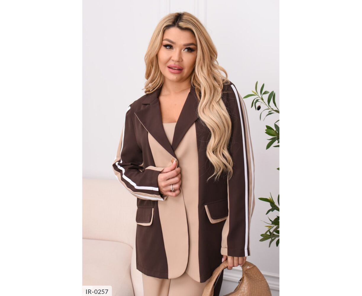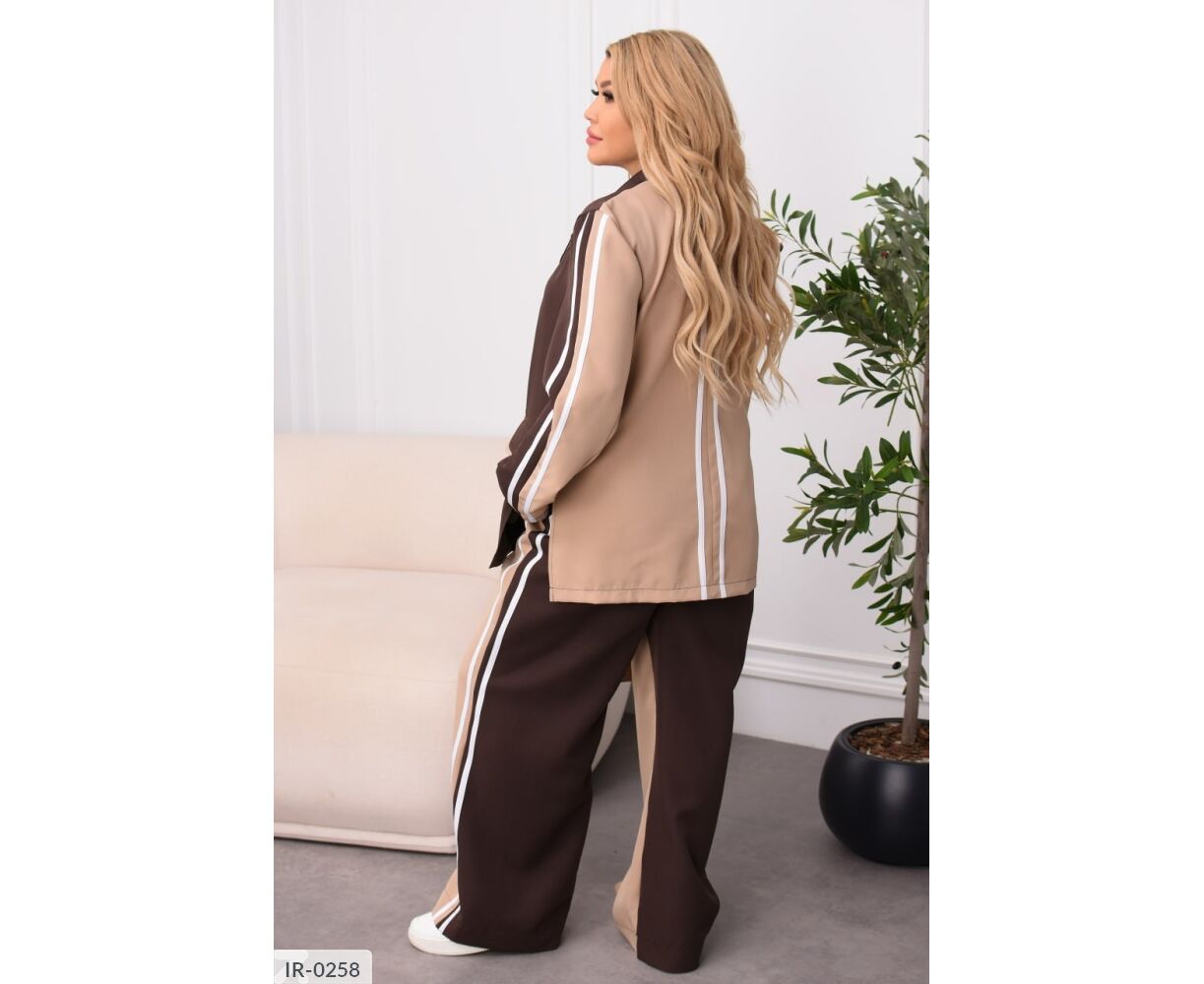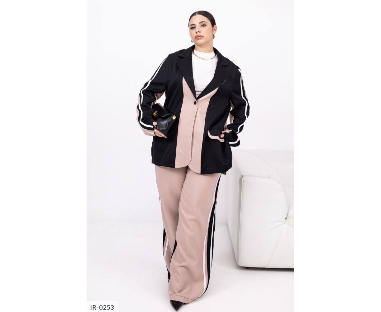 Стильний брючний костюм із костюмної тканини. Комбіновані кольори, лампаси та легкий оверсайз роблять образ сучасним та виразним. Ідеальний для міських прогулянок, подорожей та виходів у стилі smart casual. Піджак застібається на кнопку, має прорізні кишені із клапанами, вільні штани середньої посадки з еластичною гумкою на поясі комфорту на кожен день без компромісів.