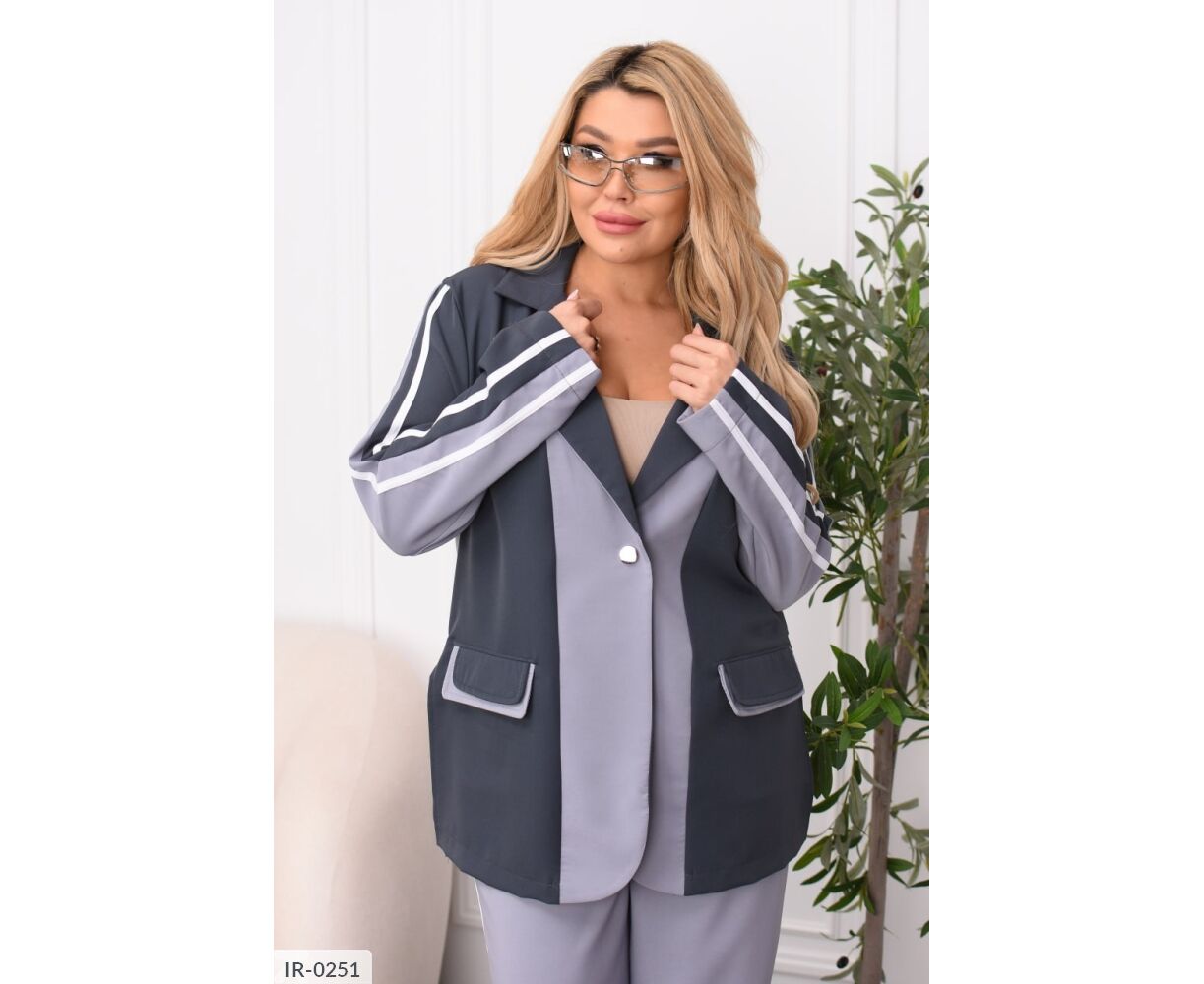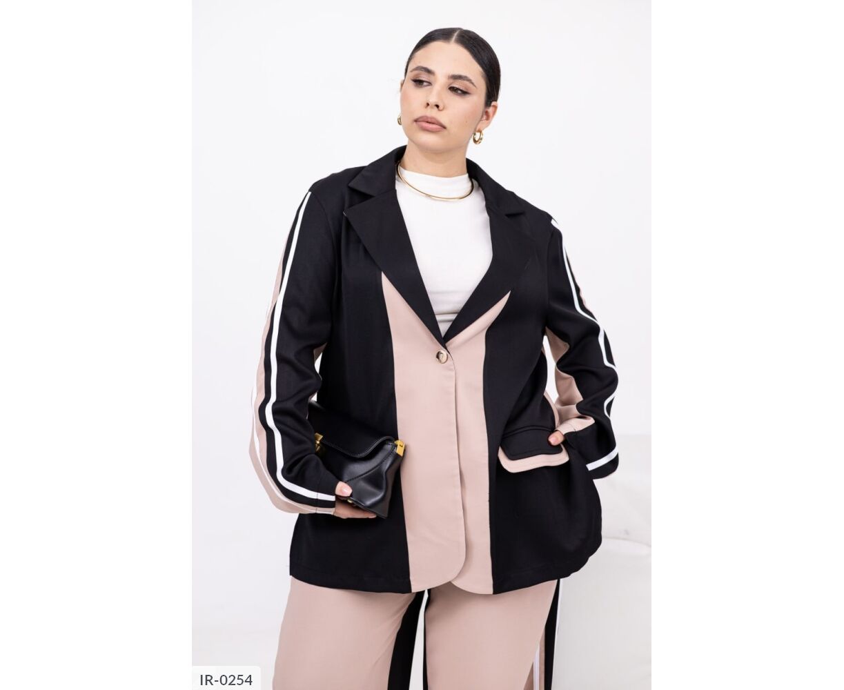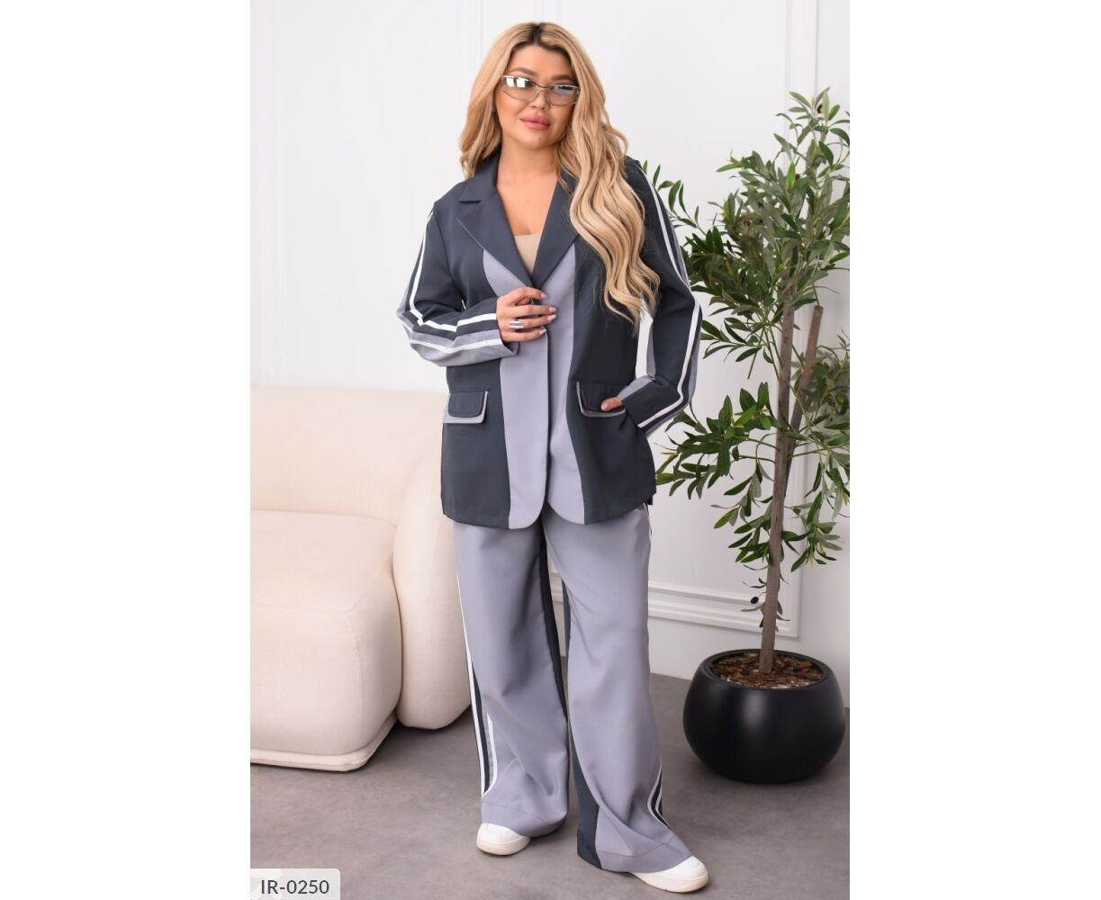 Стильний брючний костюм із костюмної тканини. Комбіновані кольори, лампаси та легкий оверсайз роблять образ сучасним та виразним. Ідеальний для міських прогулянок, подорожей та виходів у стилі smart casual. Піджак застібається на кнопку, має прорізні кишені із клапанами, вільні штани середньої посадки з еластичною гумкою на поясі комфорту на кожен день без компромісів.
