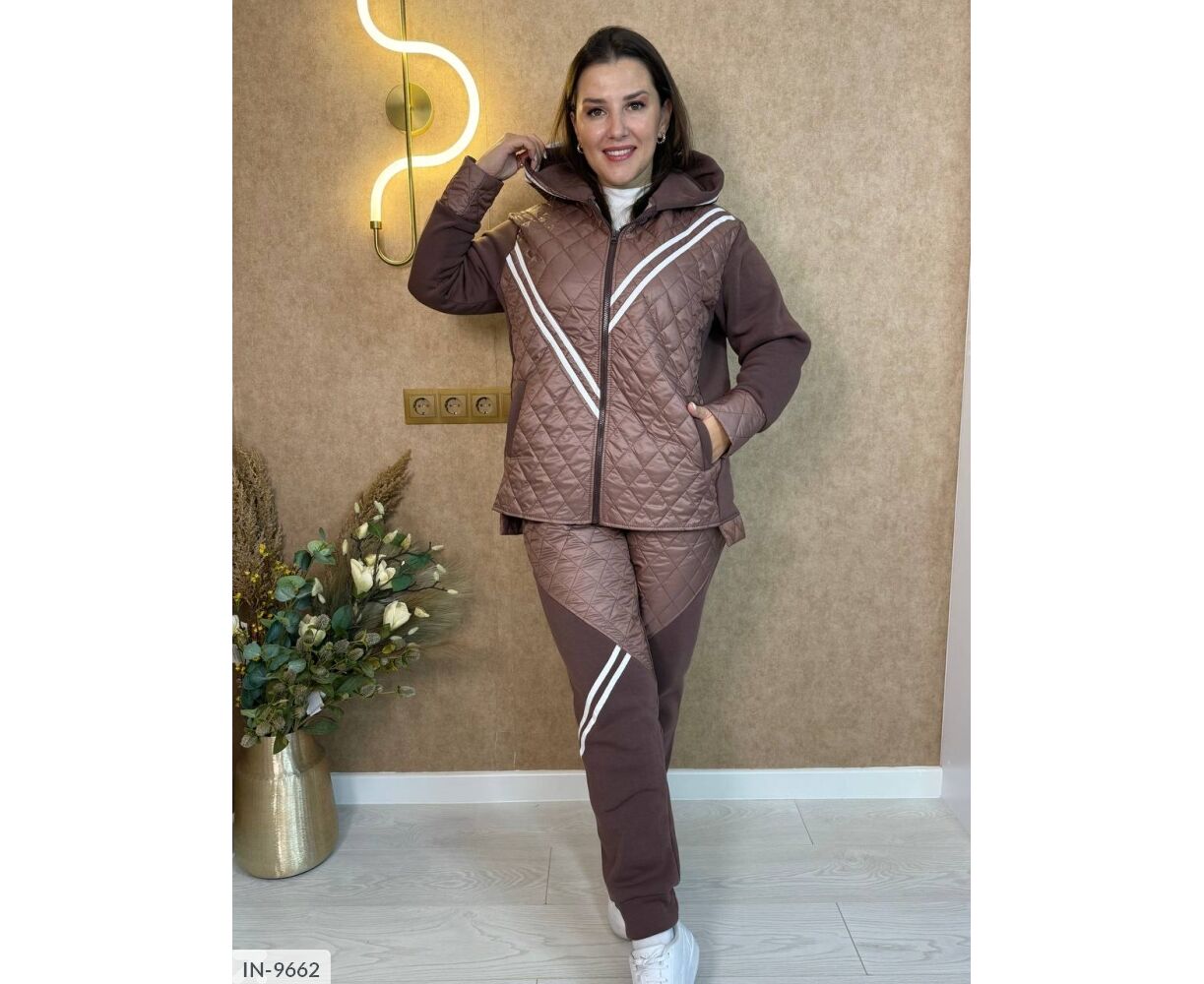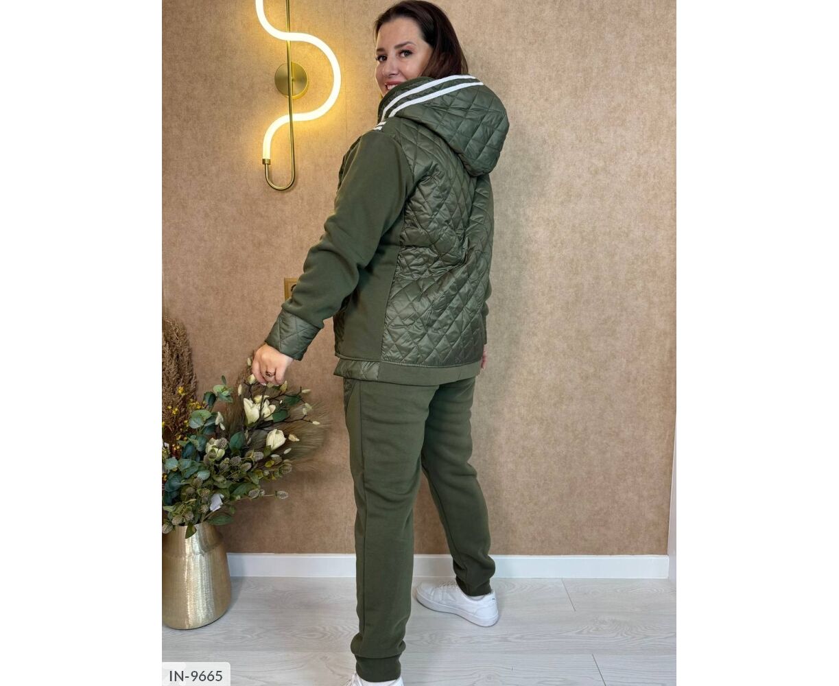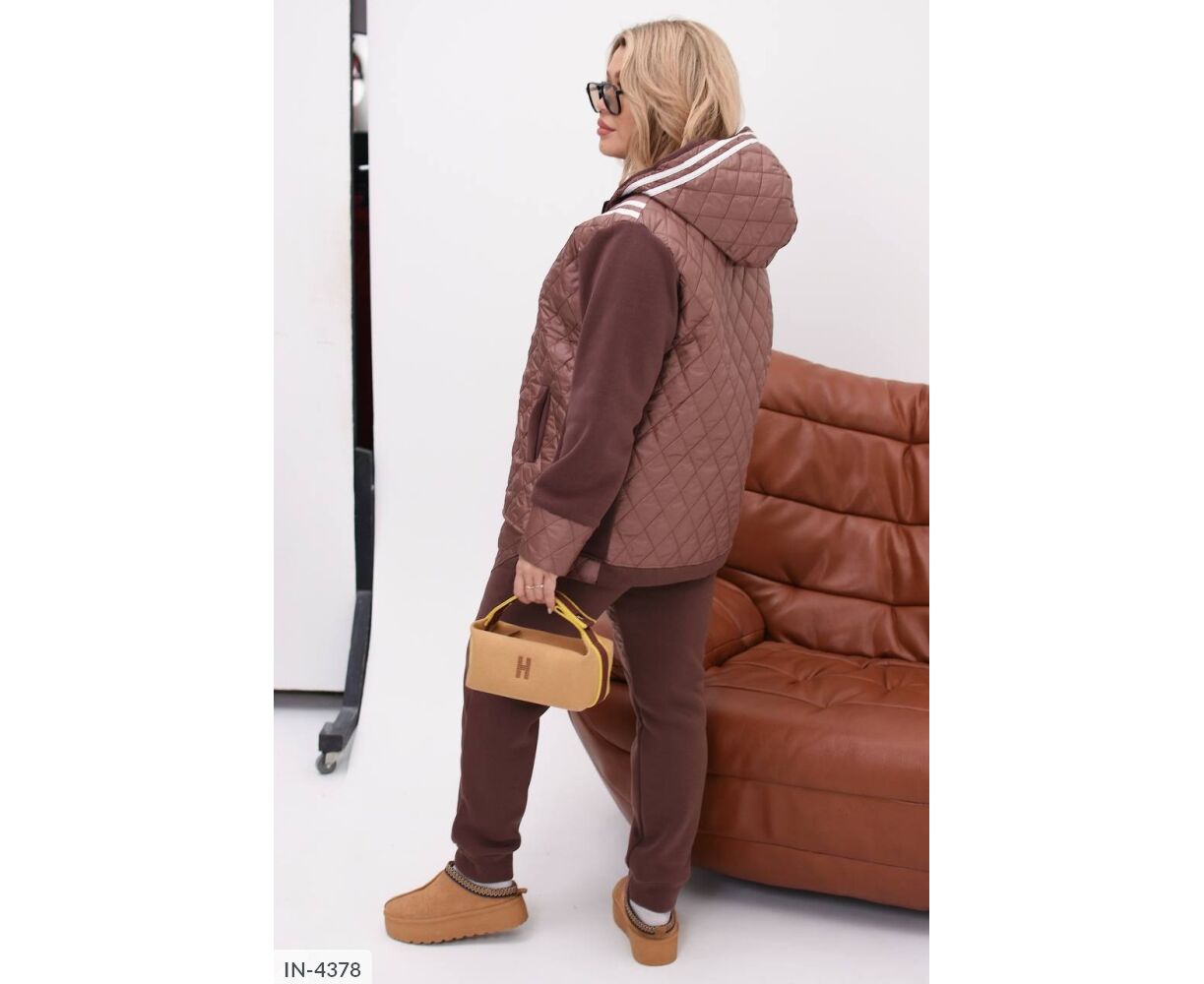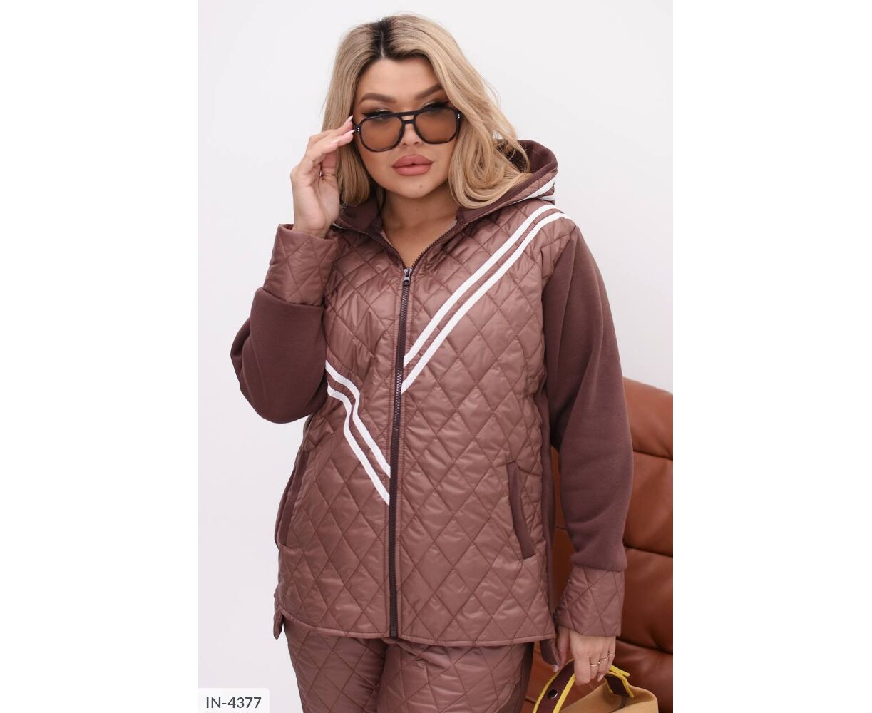 Стьобаний костюм-двійка: куртка на блискавці в колір основи, глибокий капюшон, на рукавах широкі манжети з плащової тканини.