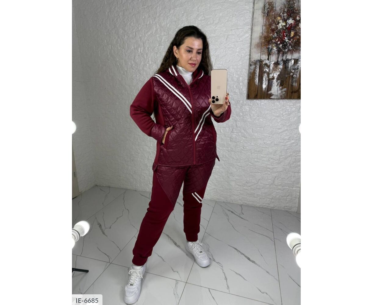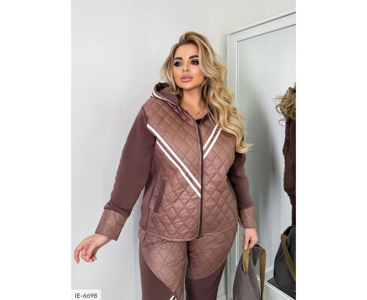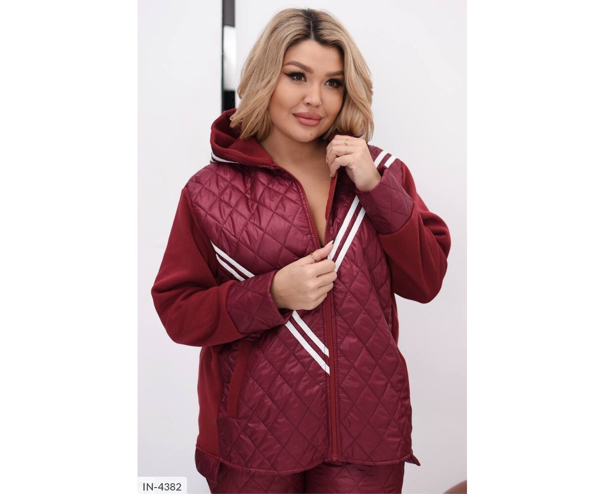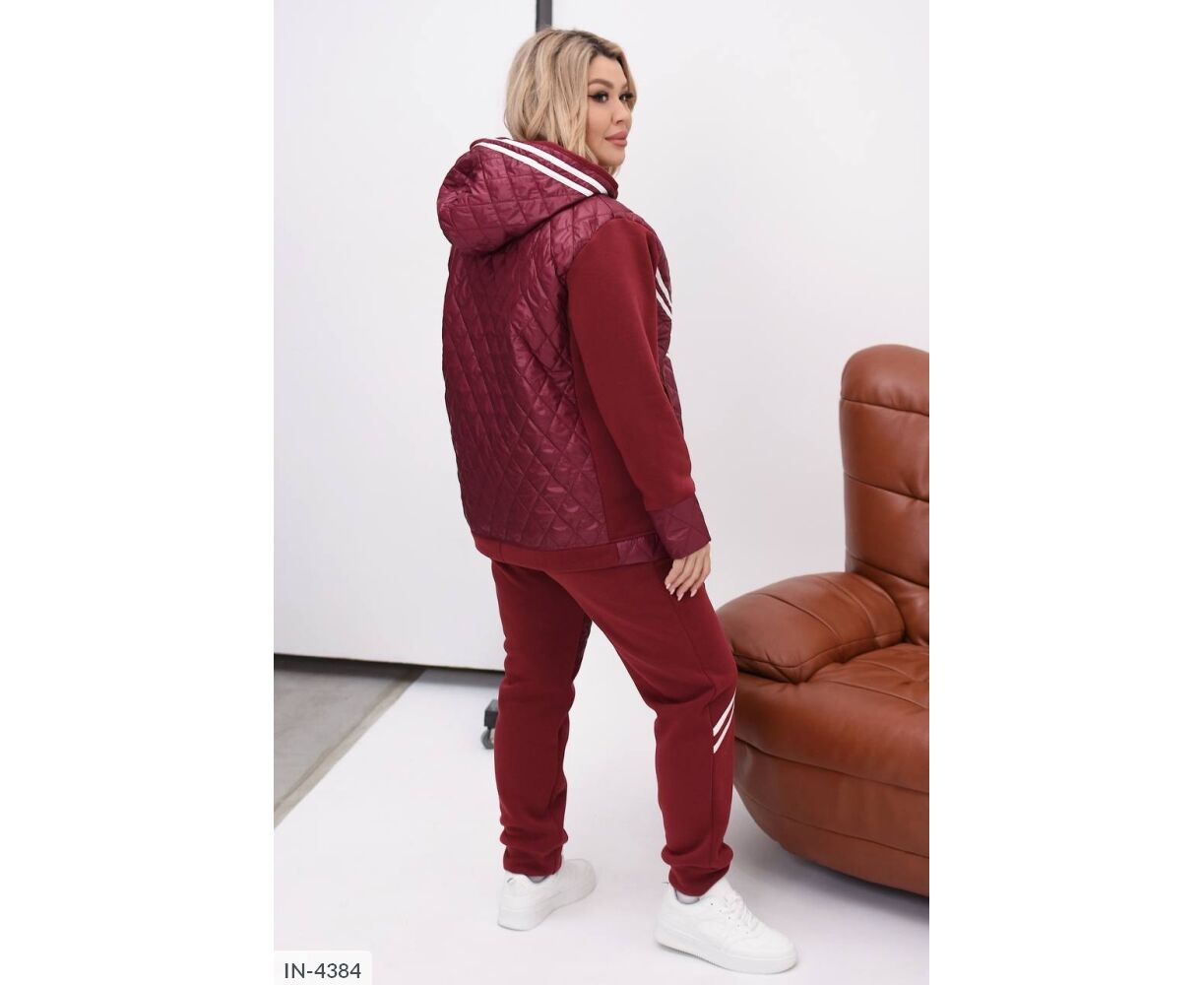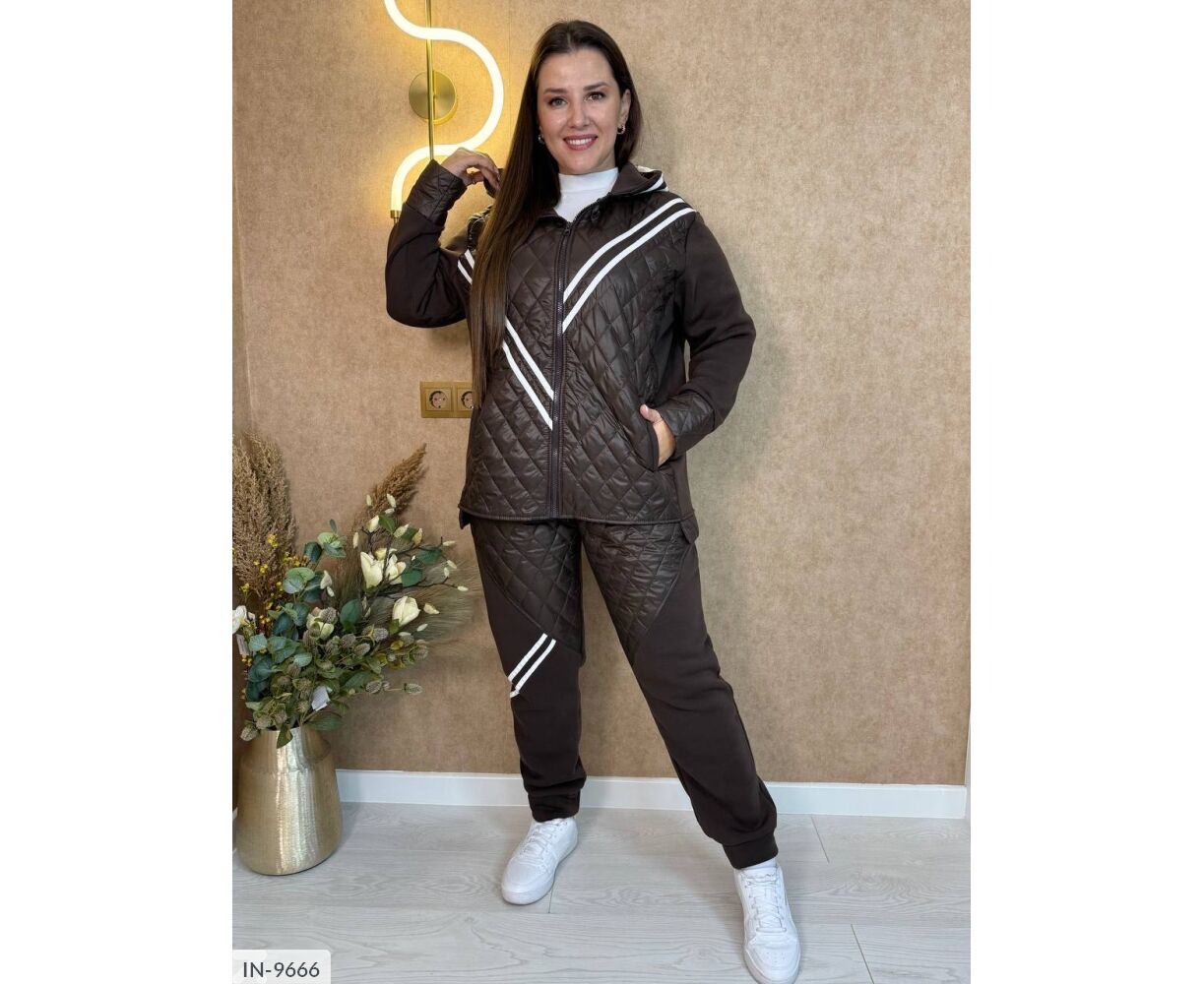 Стьобаний костюм-двійка: куртка на блискавці в колір основи, глибокий капюшон, на рукавах широкі манжети з плащової тканини.
