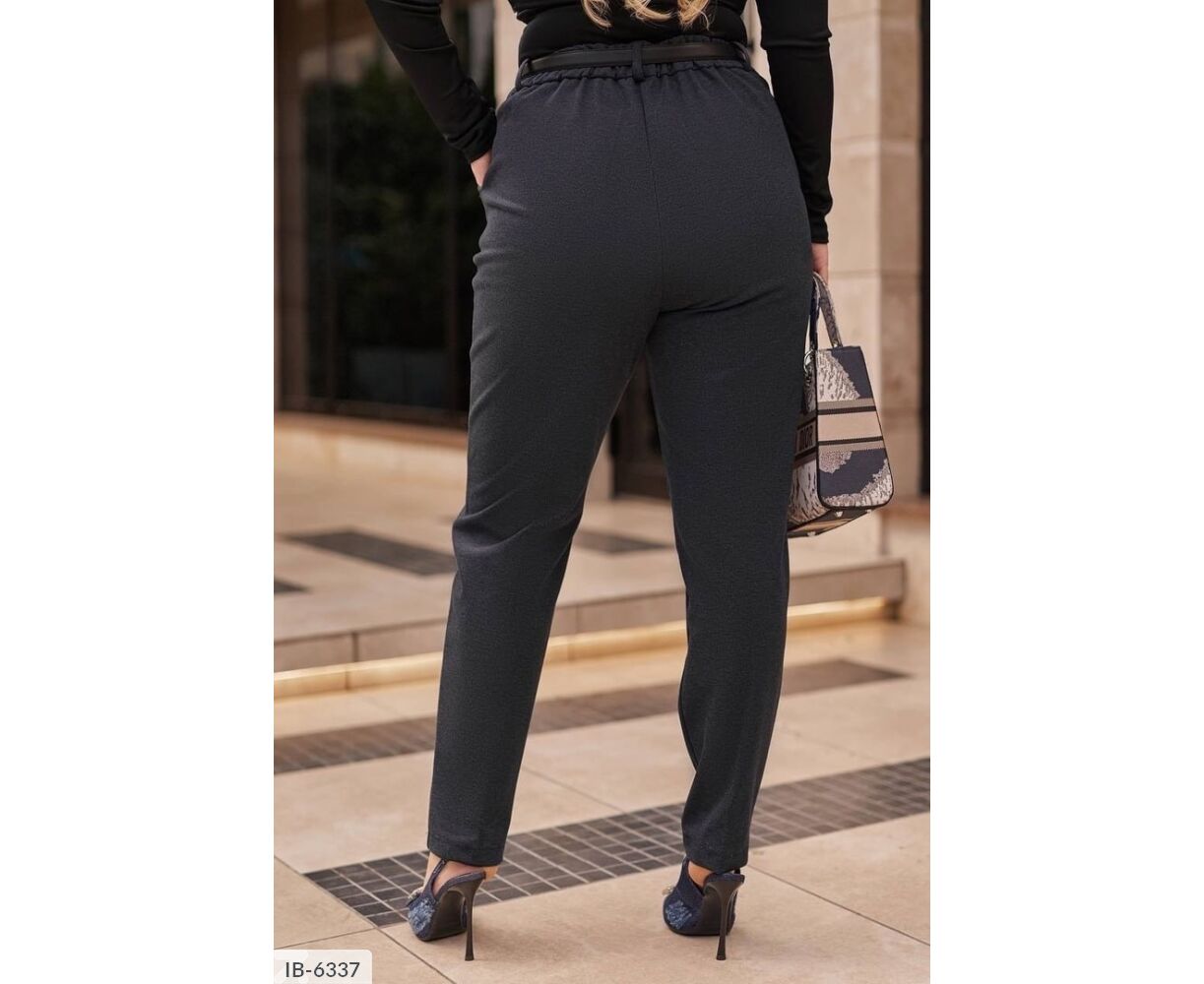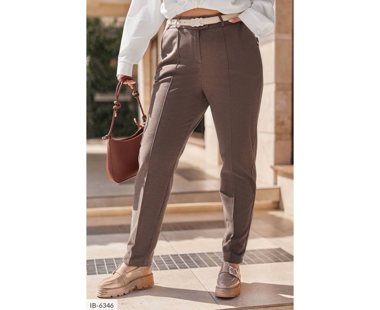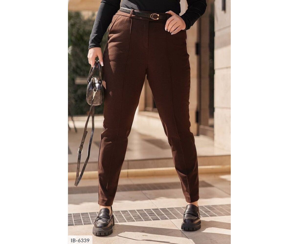 Жіночі штани, класичні, теплі з високою посадкою, до поясу ззаду вшита резинка, спереду - ширінка застібається на змійку і гудзик, з боків - кишені. Штани з нашитою стрілкою спереду по центру.