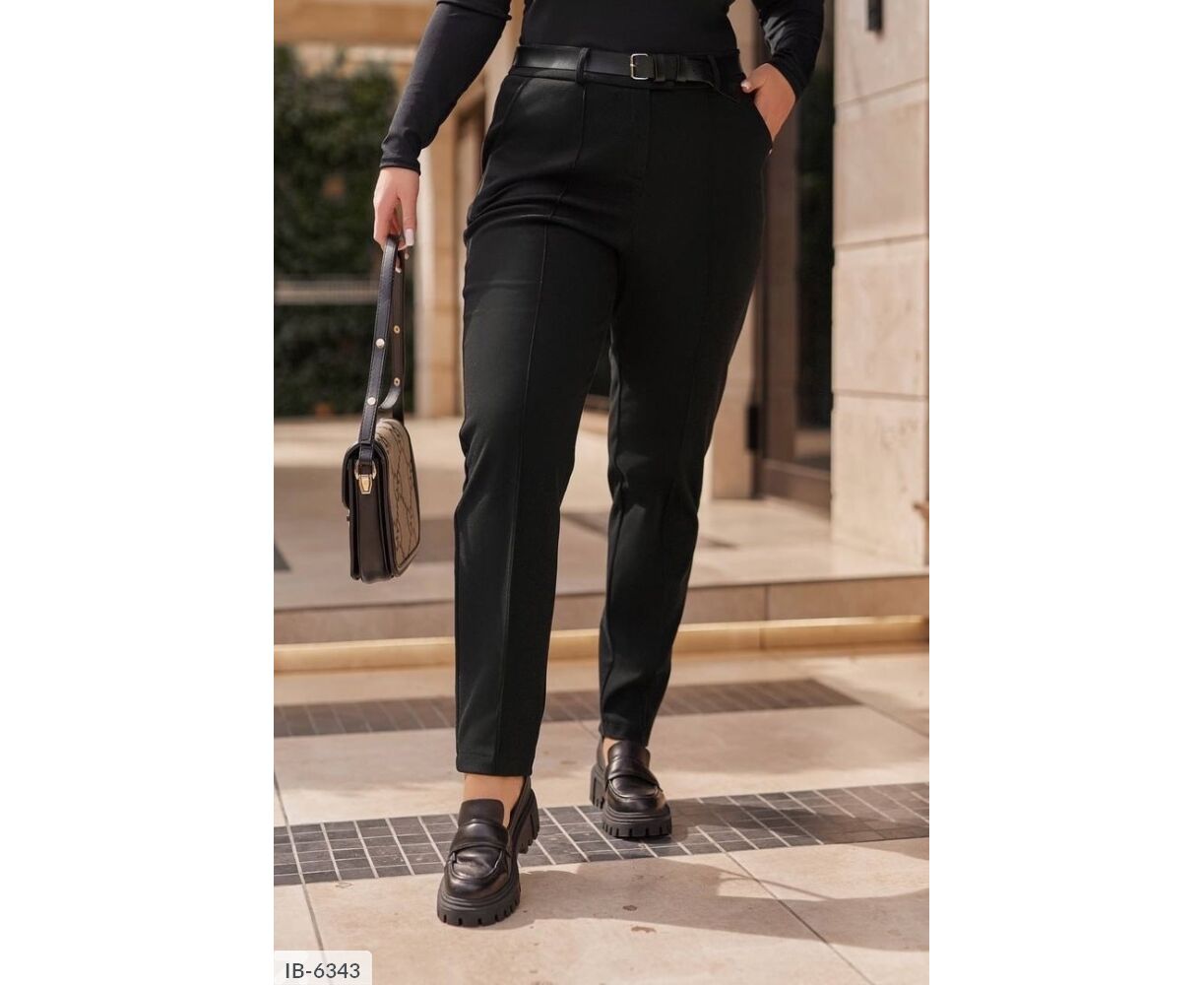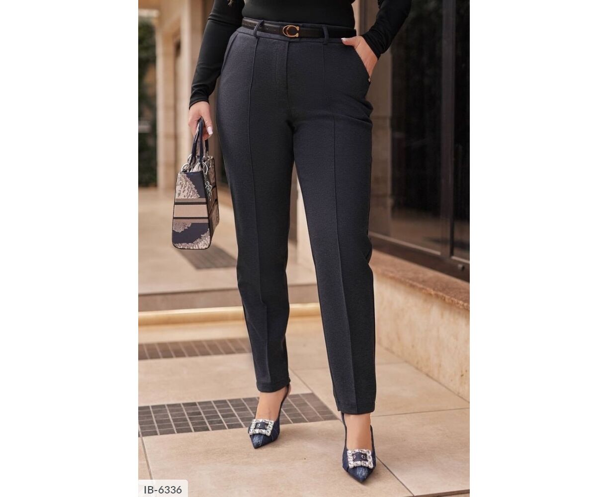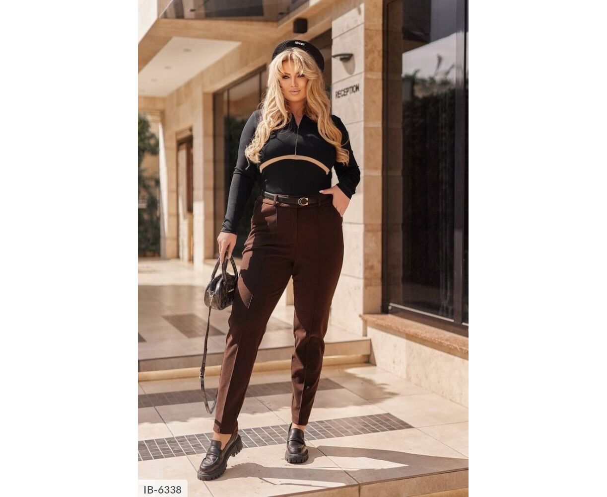 Жіночі штани, класичні, теплі з високою посадкою, до поясу ззаду вшита резинка, спереду - ширінка застібається на змійку і гудзик, з боків - кишені. Штани з нашитою стрілкою спереду по центру.