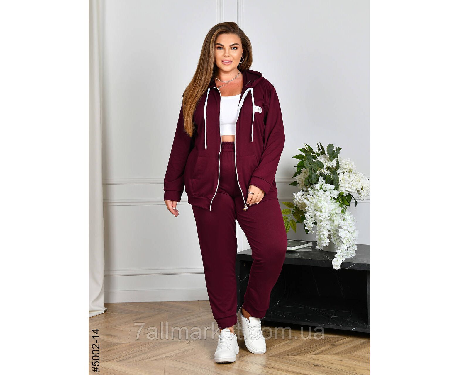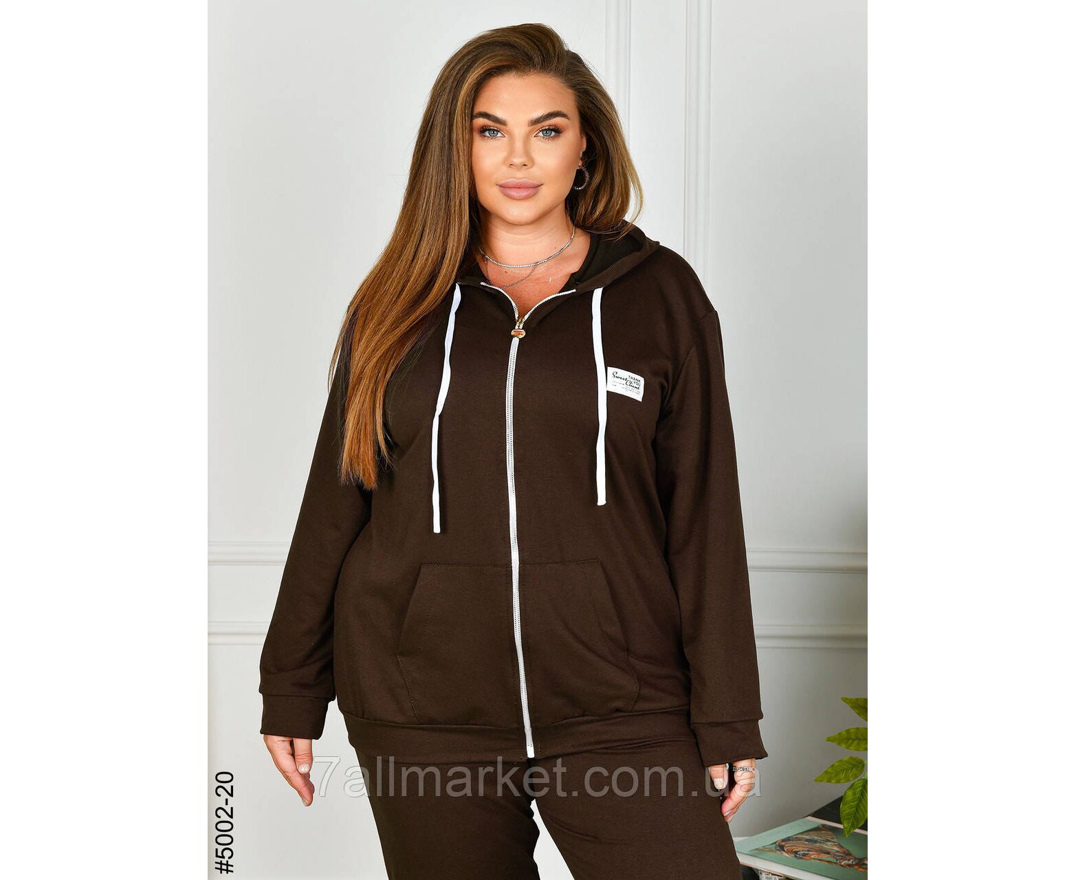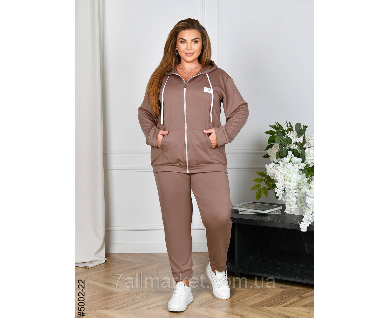Жіночий спортивний костюм із двонитки в батальних розмірах. Верх — кофта з капюшоном і блискавкою, обладнана двома кишенями; низ — зручні штани на манжеті та комфортній широкій резинці. Чудова повсякденна модель, повномірна розміри.