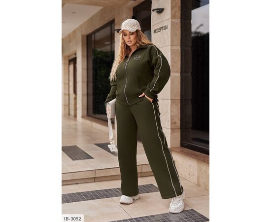 Кофта спереду має застібку блискавку, на грудях прикраса з камінчиками ( стрази), з врізними кишенями. На рукавах і на брюках - кантований лампас. Штани вільного крою, з кишенями, ідеальної посадки, в талії на резинці.