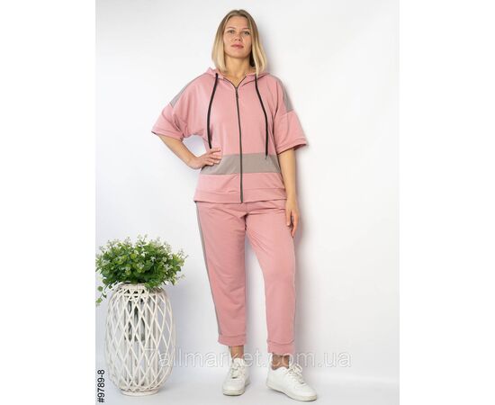 Жіночий спортивний костюм з двунитки. Верх – кофта на блискавці, з коротким рукавом, та капюшоном; низ –штани з широким комфортним поясом на резинці, є шнурок для додаткової фіксації. Зручна модель на літо.
