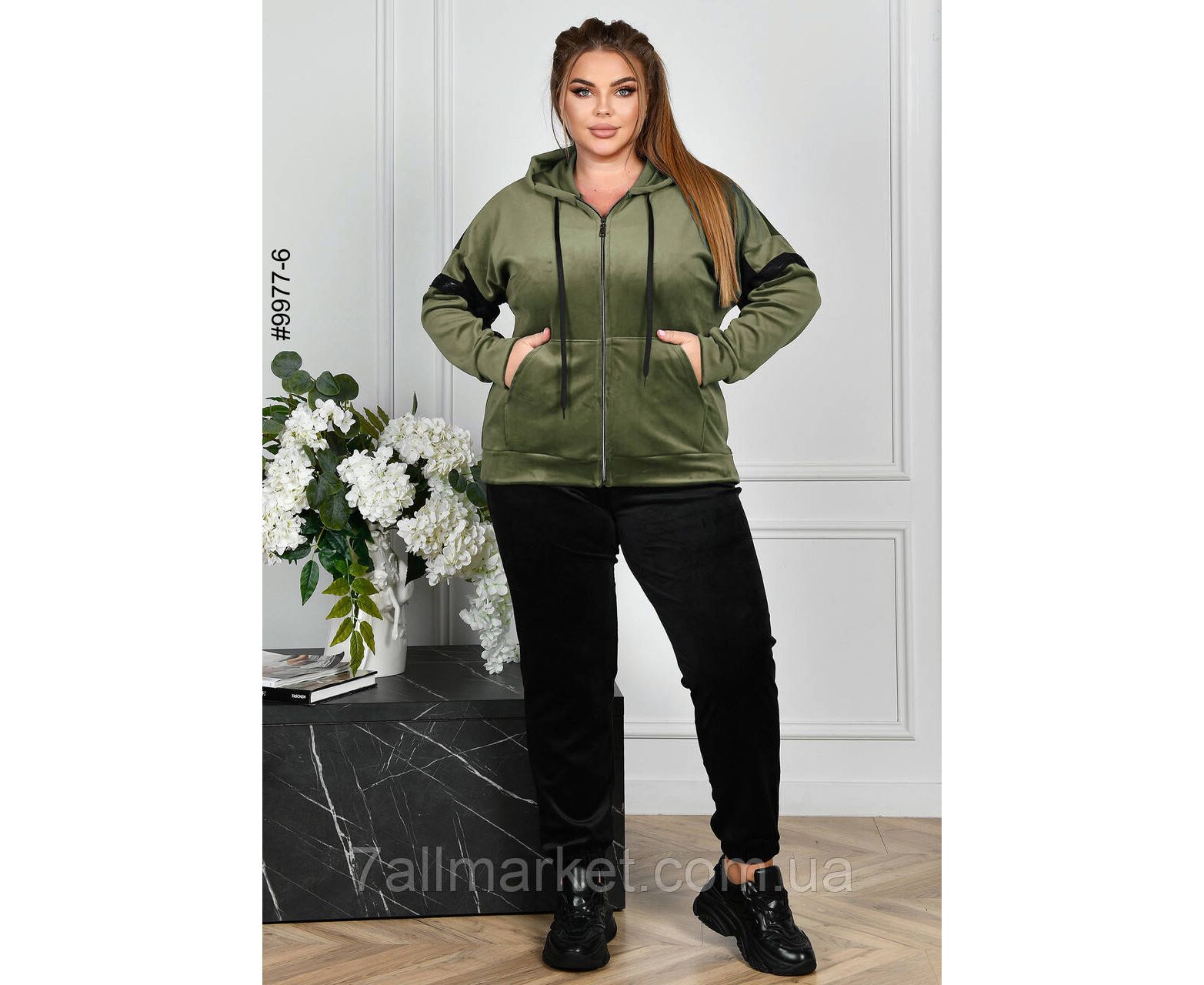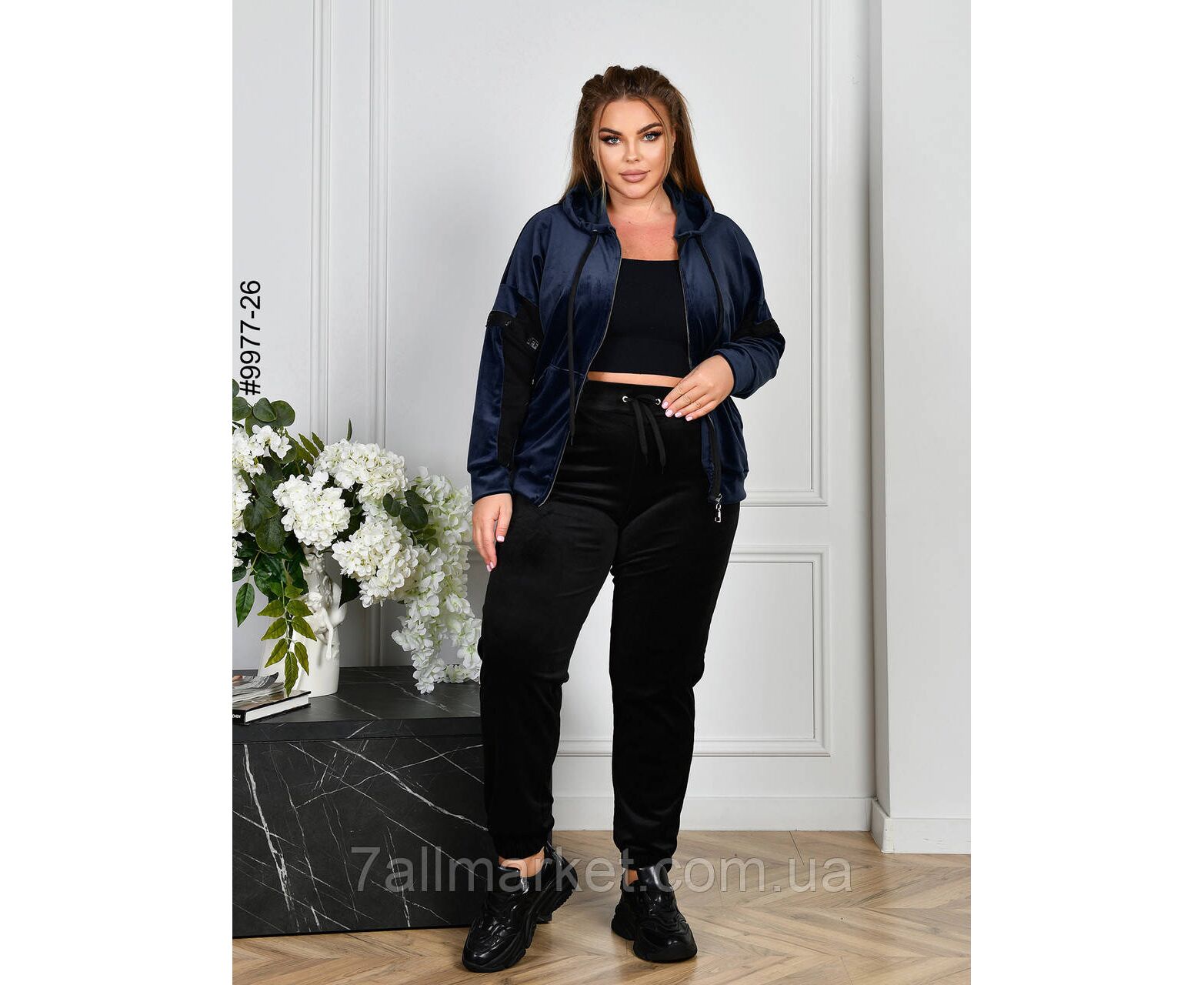 Жіночий велюровий спортивний костюм у батальних розмірах. Верх — худі з капюшоном на блискавці; обладнаний манжетами на рукавах. Низ — чорні штани на манжеті-резинці, широкий комфортний пояс доповнено функціональним шнурком.