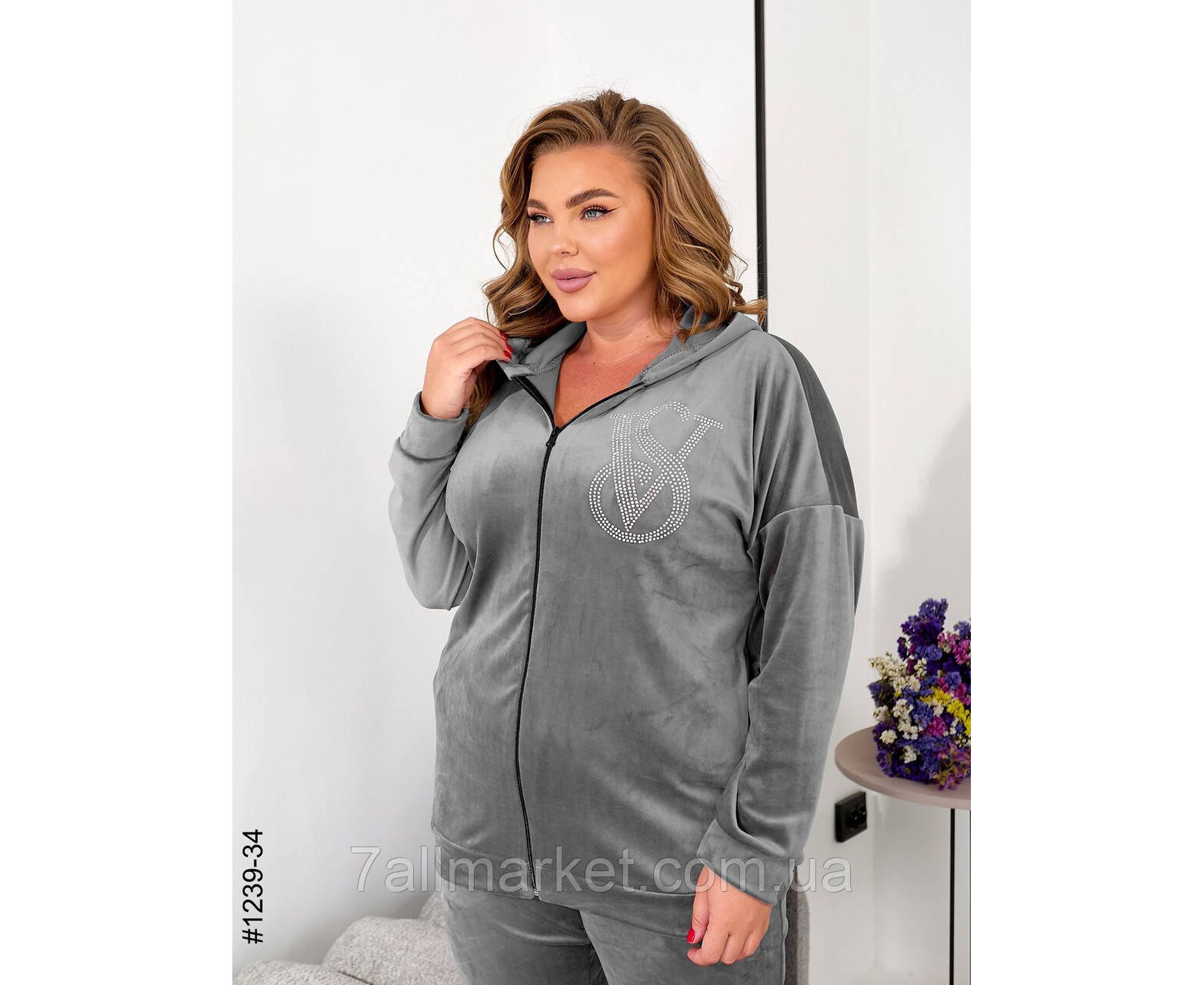 Жіночий велюровий спортивний костюм у супербатальних розмірах. Верх — кофта з капюшоном на блискавці; доповнена малюнком зі страз. Низ — штани на широкій резинці, з бічними кишенями та манжетами на штанинах.