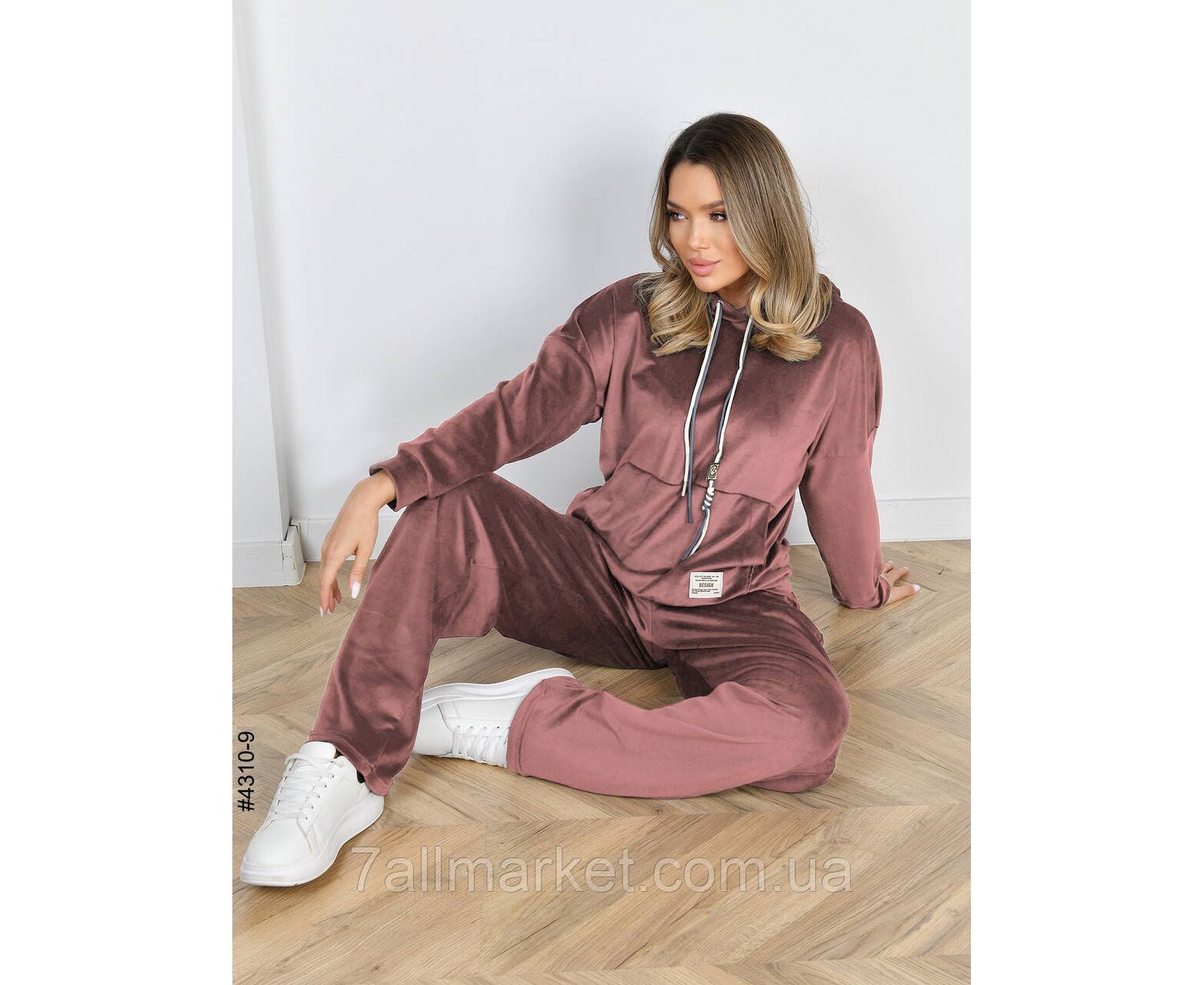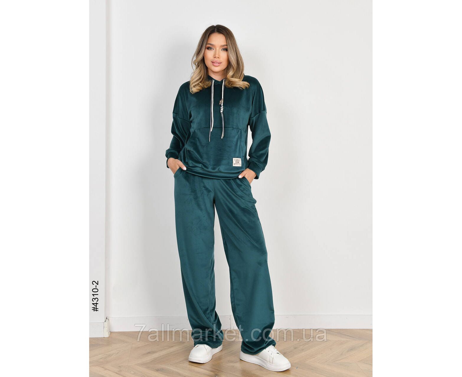 Жіночий велюровий костюм. Верх – худі з капюшоном і кишенею-кенгуру. Низ – прямі штани з широким поясом на резинці. Відмінна якість тканини, пошиття. Гарне лекало, стильна повномірна модель.