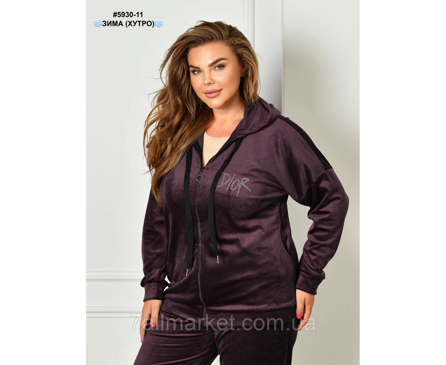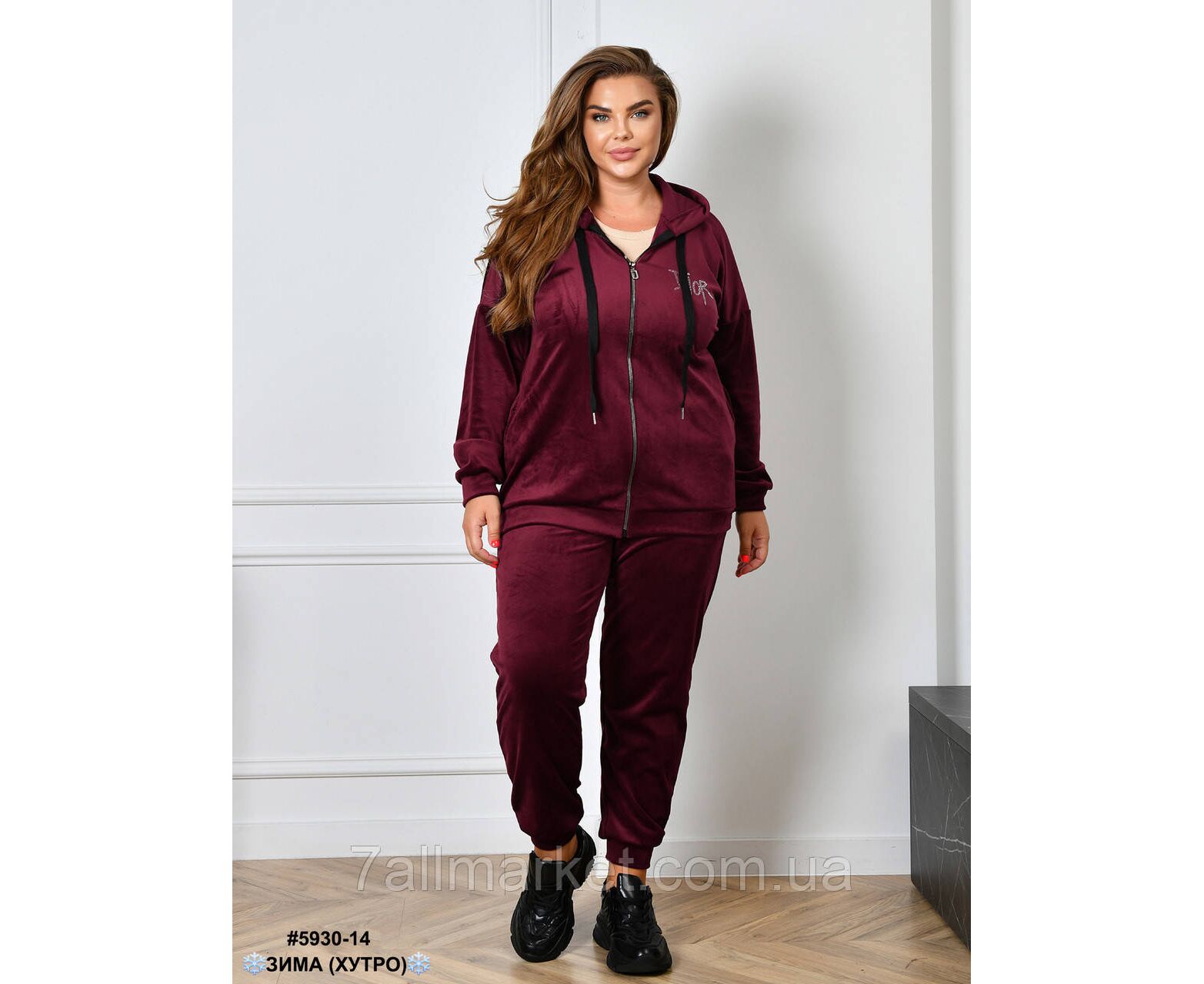 Теплий велюровий костюм на хутрі, прикрашений написом з каміння. Верх — кофта з капюшоном на блискавці; обладнана манжетами на рукавах. Низ — штани на манжеті, в поясі широка комфортна резинка. Батальна повсякденна модель на зиму.