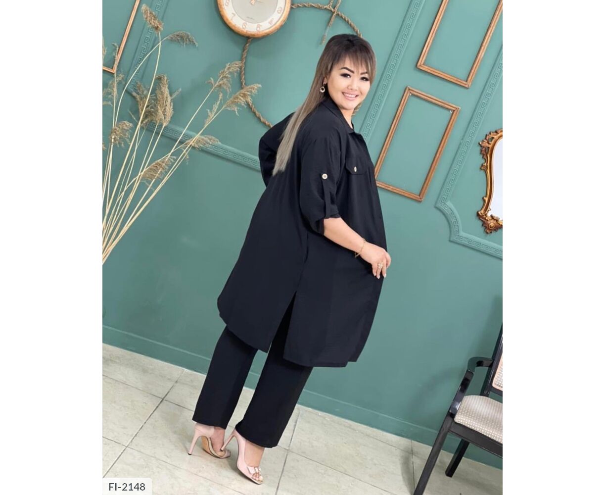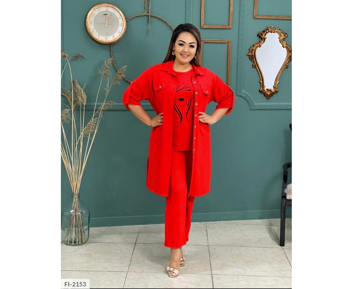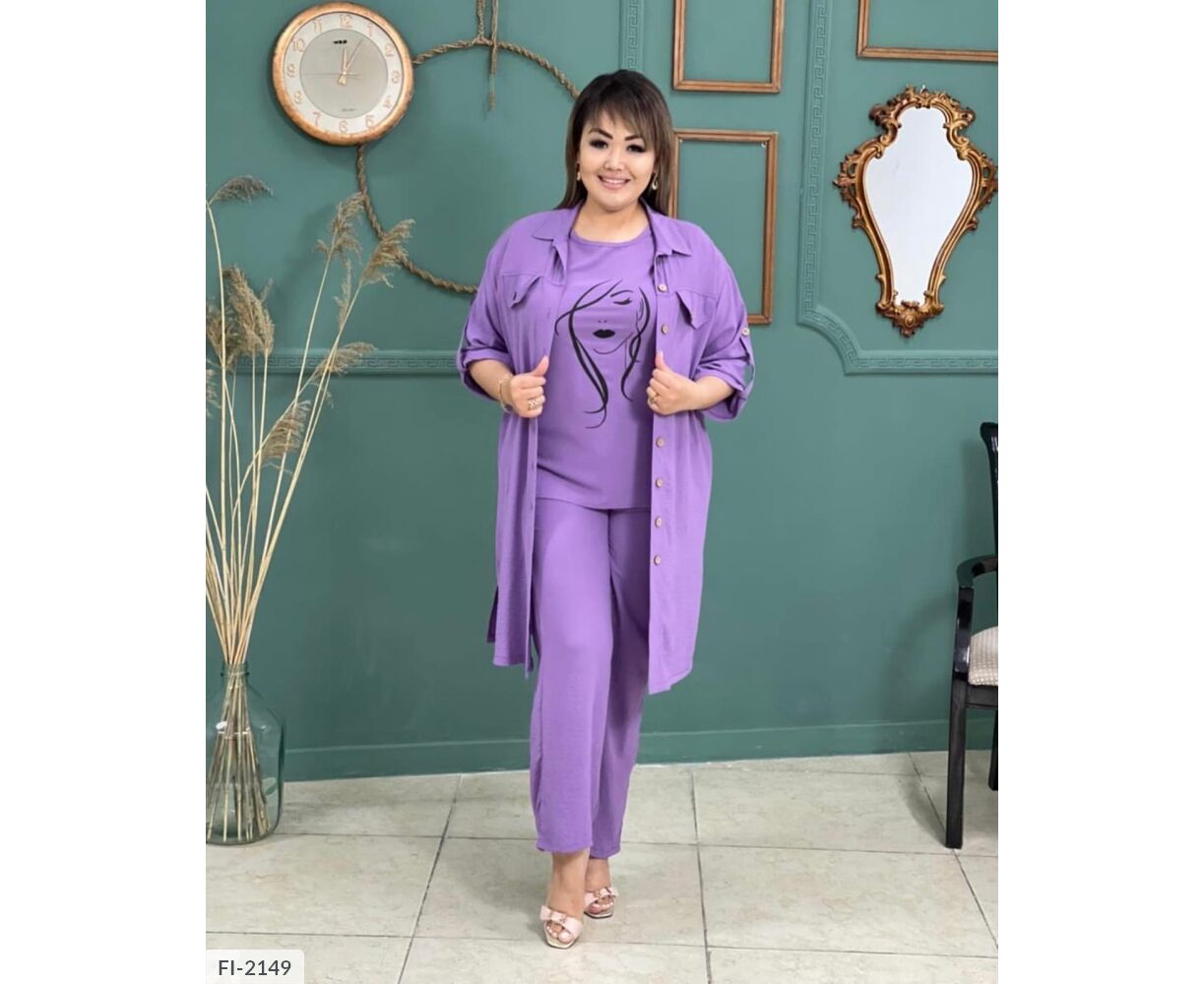 Костюм трійка з оригінальним накатом, всі три деталі гардероба можна носити окремо: блуза з якісним накатом, як на фото, з боків разрезики , штани на широкій гумці , з боків кишені, подовжена сорочка , застібається на гудзики , рукав на патиці з гудзиком( довжину можна регулювати), на грудях кишені з гудзиком, з боків разрезики.