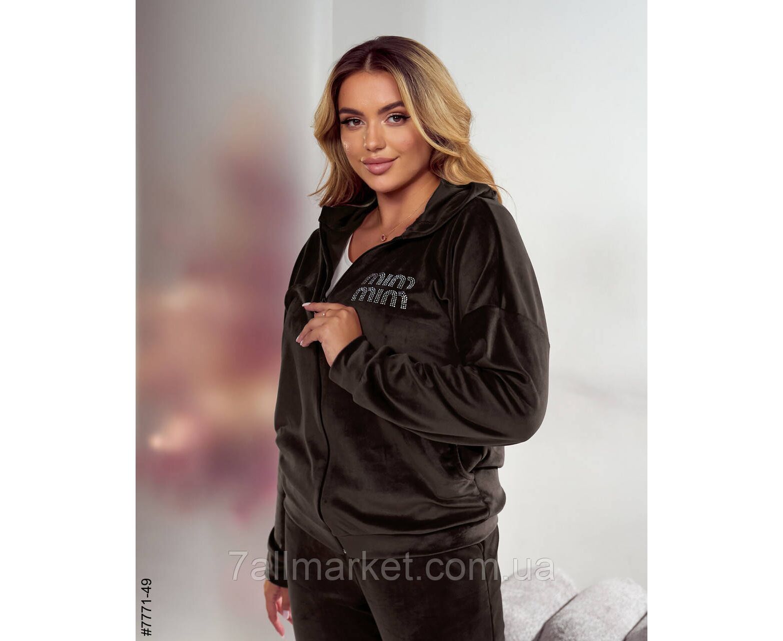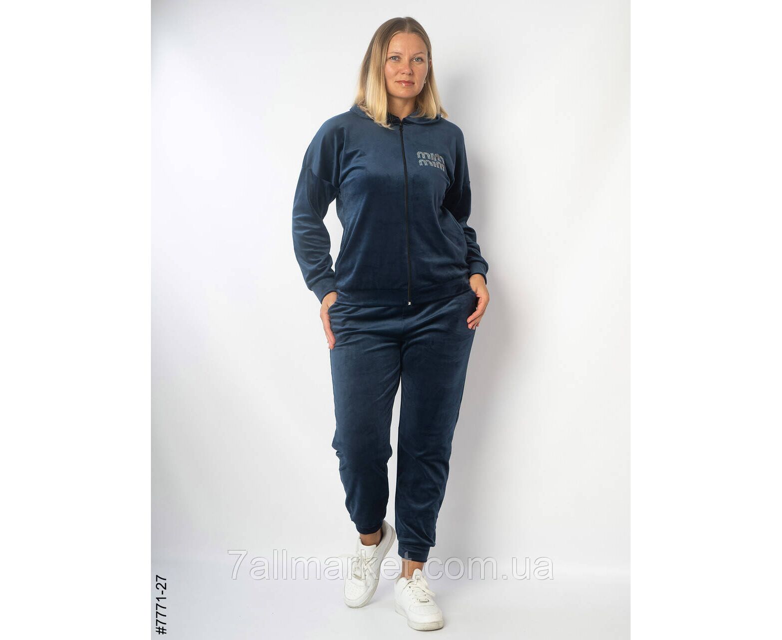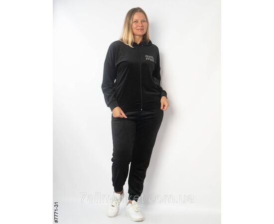 Жіночий спортивний костюм в напівбатальних розмірах. Верх — кофта з капюшон на блискавці; прикрашена написом зі страз. Низ — штани на манжеті, в поясі комфортна широка резинка.