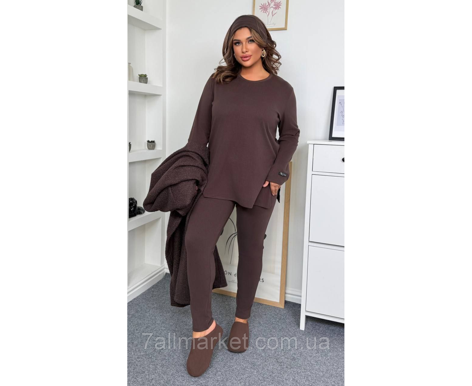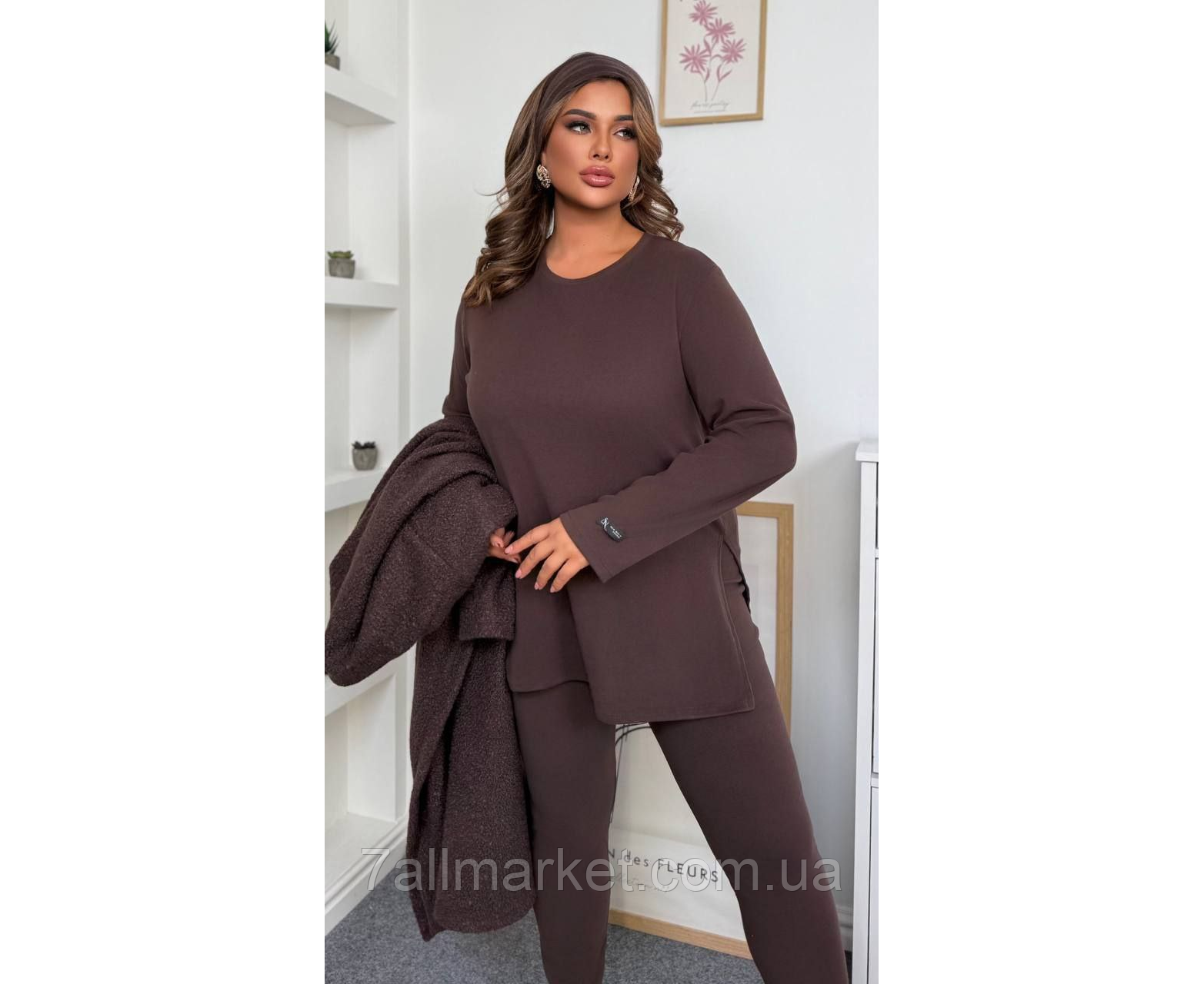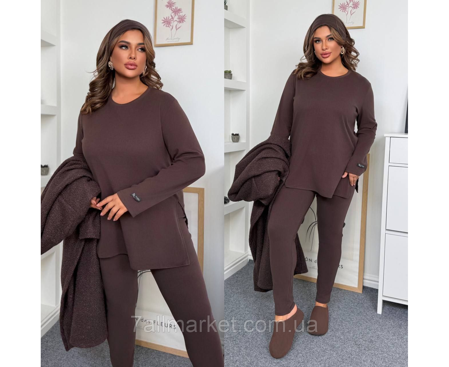 Костюм двійка Модель № 057 ЯКІСТЬ ВІДМІННА Розмір : 46-48; 50-52; 54-56; 58-60 Тканина : трикотаж фліс - Пум@ ( гарно тягнеться ) Довжина кофти : 80 см . Довжина рукава : 64 см . Довжина лосин : 108 см. Теплий костюм на холодну пору - кофта + лосини . Кофта прямого покрою , з бічними розрізами . Лосини з високою посадкою на гумці .