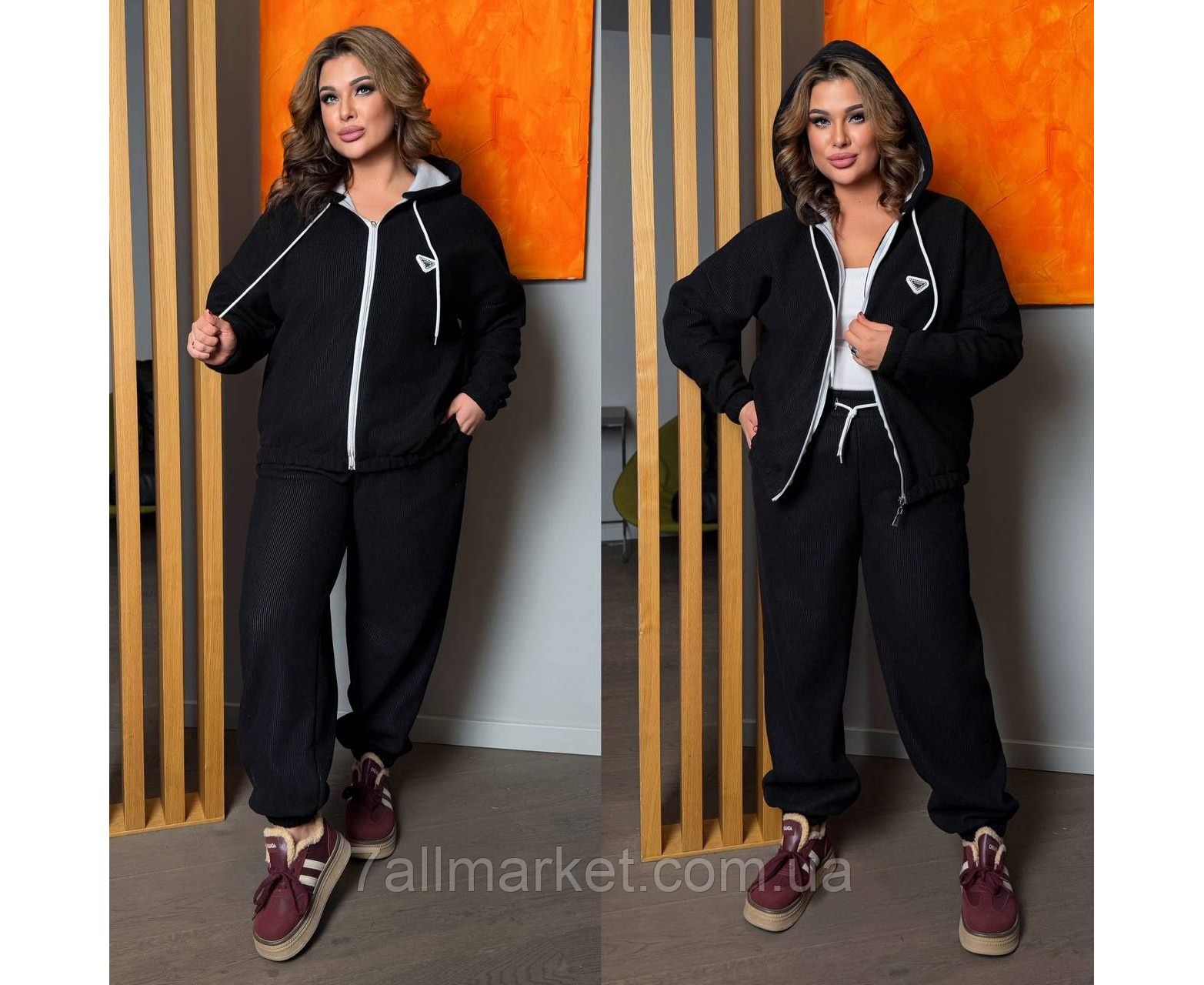 Костюм двійка Модель № 7897-1 ЯКІСТЬ ВІДМІННА Розмір : 46-48; 50-52; 54-56; 58-60 Тканина : вельвет на хутрі ( гарно тягнеться ) Довжина кофта : 74 см.. Довжина рукава : 80 см. ( від горловини ) Довжина штанів : 110 см. Теплий костюм на холодну пору . Штани з високою посадкою , пояс на гумці та шнуркі , низ на гумці . Кофта прямого покрою , з капюшоном , на блискавці , низ рукава та кофти на гумці