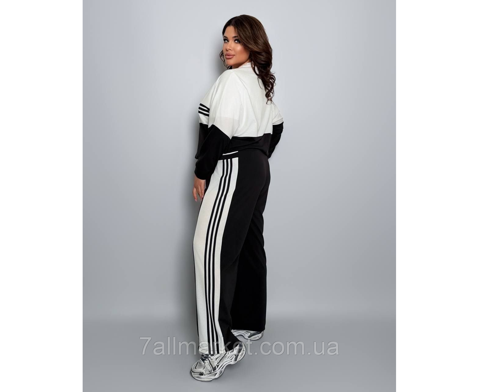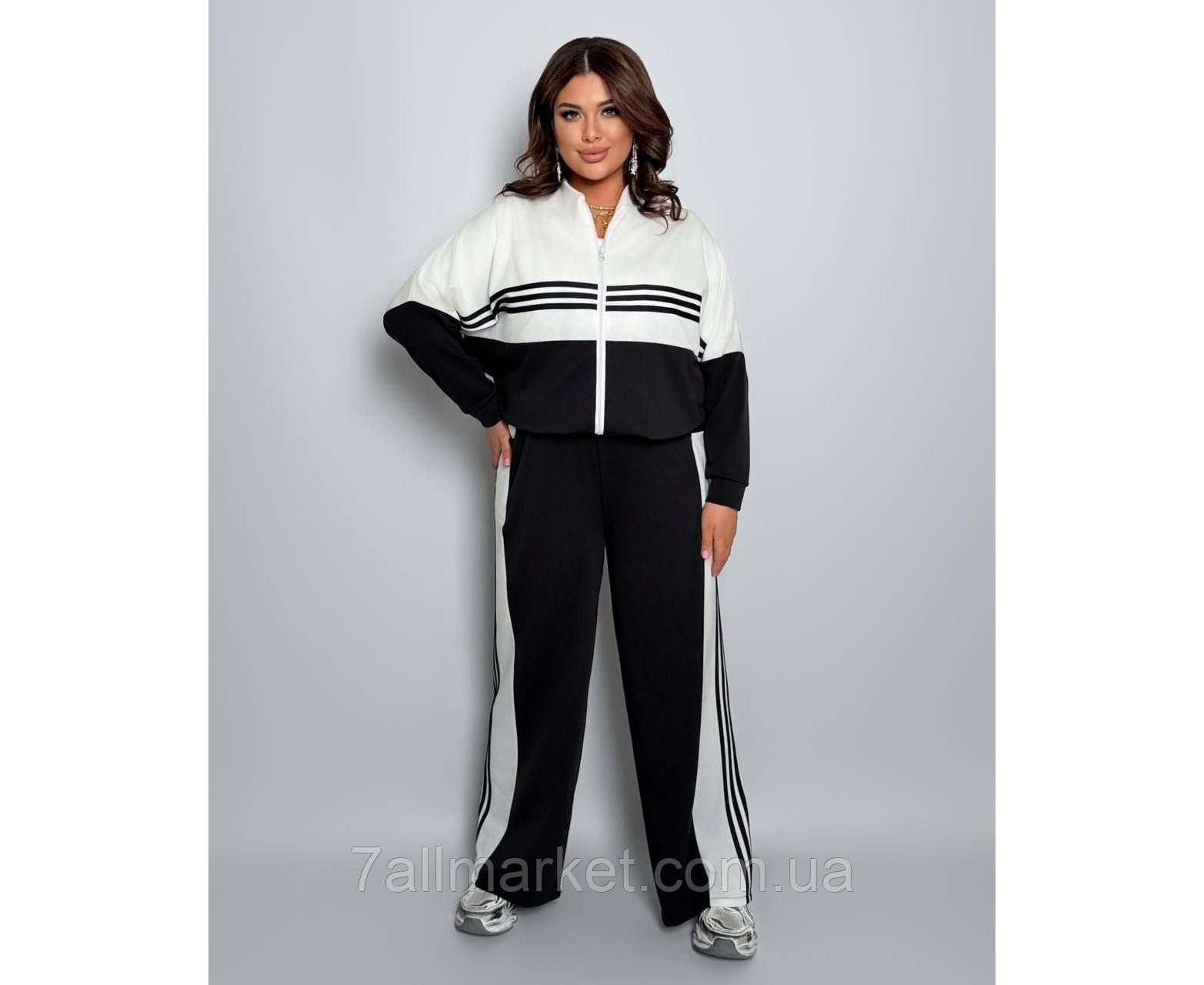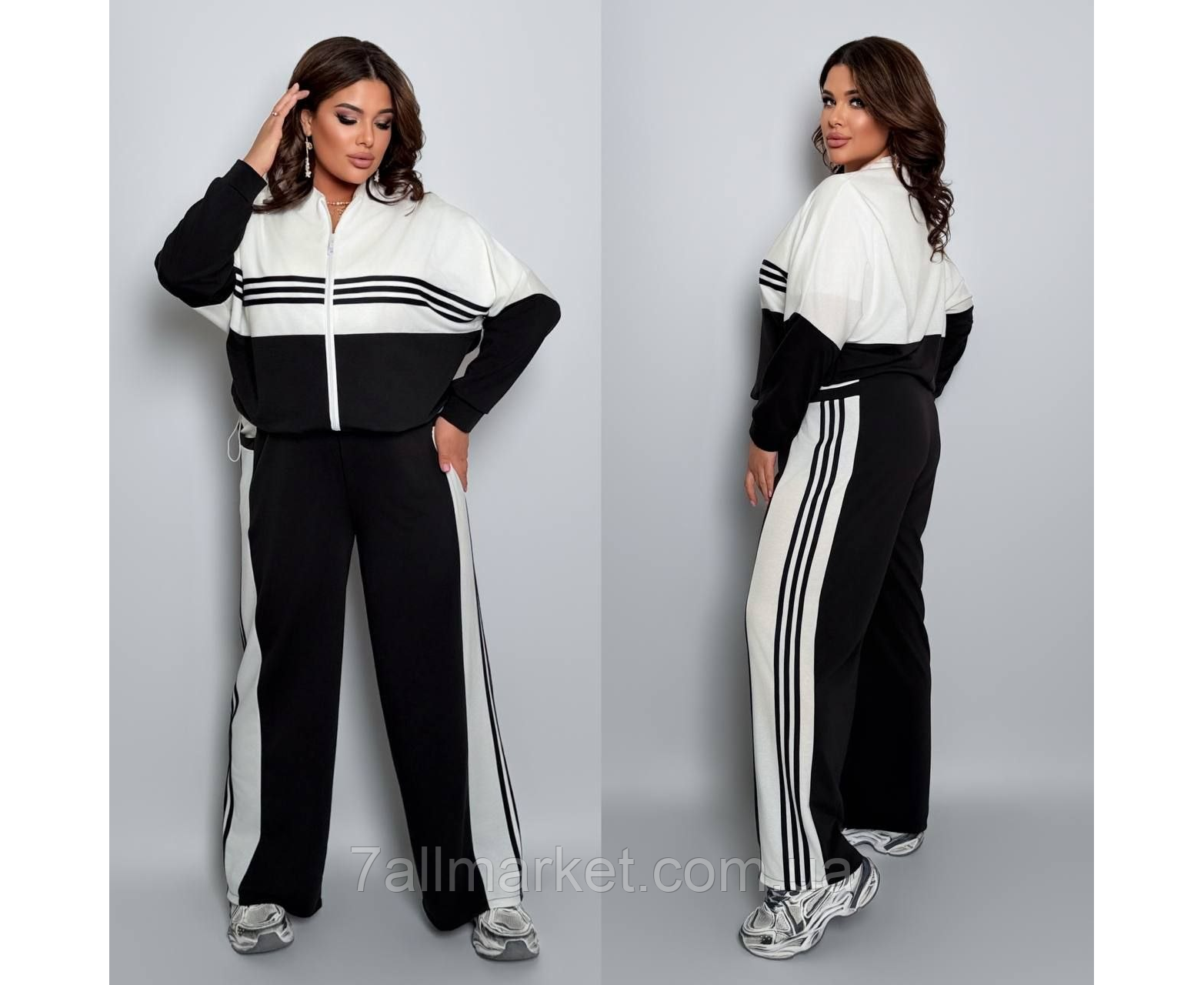 ККостюм двійка Модель № 7984-1 ЯКІСТЬ ВІДМІННА Розмір : 46-48; 50-52; 54-56; 58-60 Тканина : двонитка ( гарно тягнеться ) Довжина кофта : 72 см.. Довжина рукава: 75 см. ( від горловини ) Довжина штанів : 106 см Штани з ломпасом , з високою посадкою , пояс на гумці , бічні кишені . Кофта прямого покрою , з ломпасом , низ на фіксаторі , на блискавці .